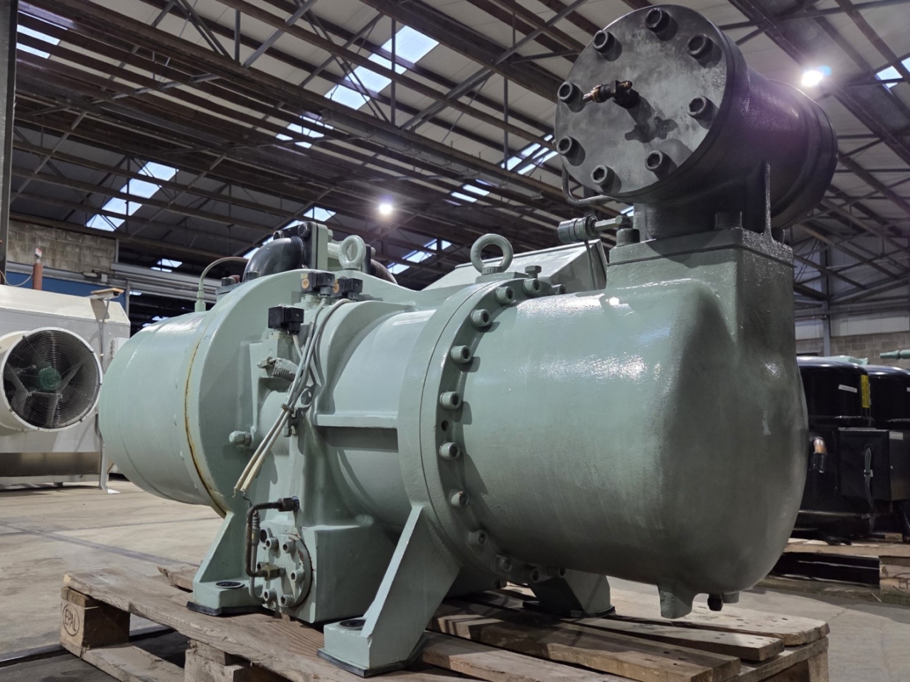 Used Fu Sheng SR-5H screw compressor on Freon complete with a sight glass. The compressor has a displacement of 432,6 m³/h at 50 Hz & 519,1 m³/h at 60 Hz.
