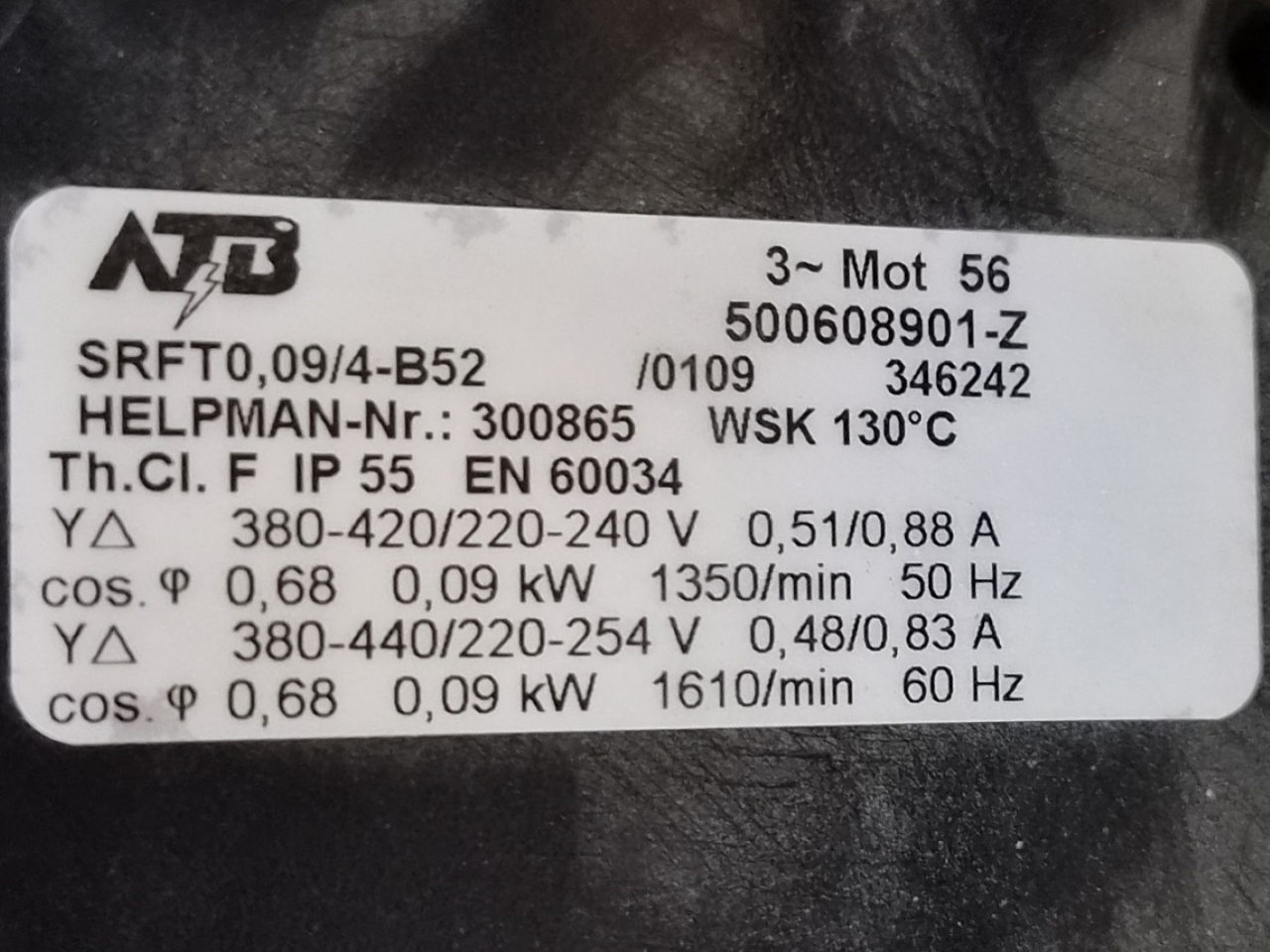 Used ATB SRFT 0,09/4-B52 fan with the following specifications: 50 Hz - 0,09 kW - 1350 RPM & 60 Hz - 0,09 kW - 1610 RPM - diameter 350 mm.