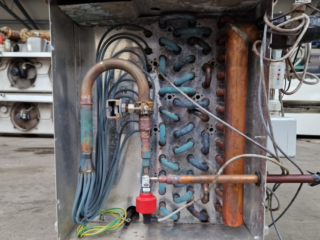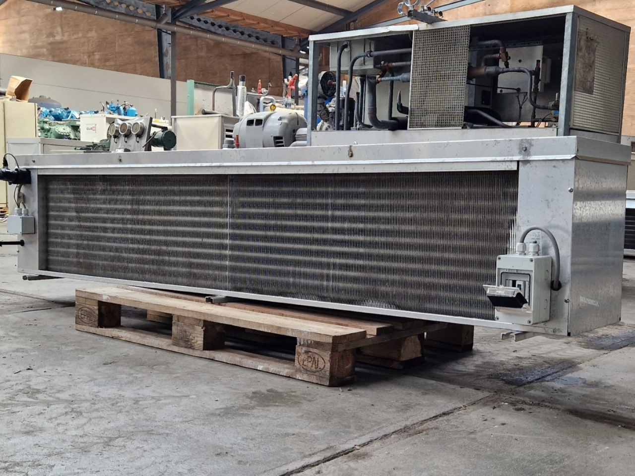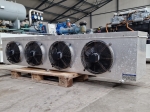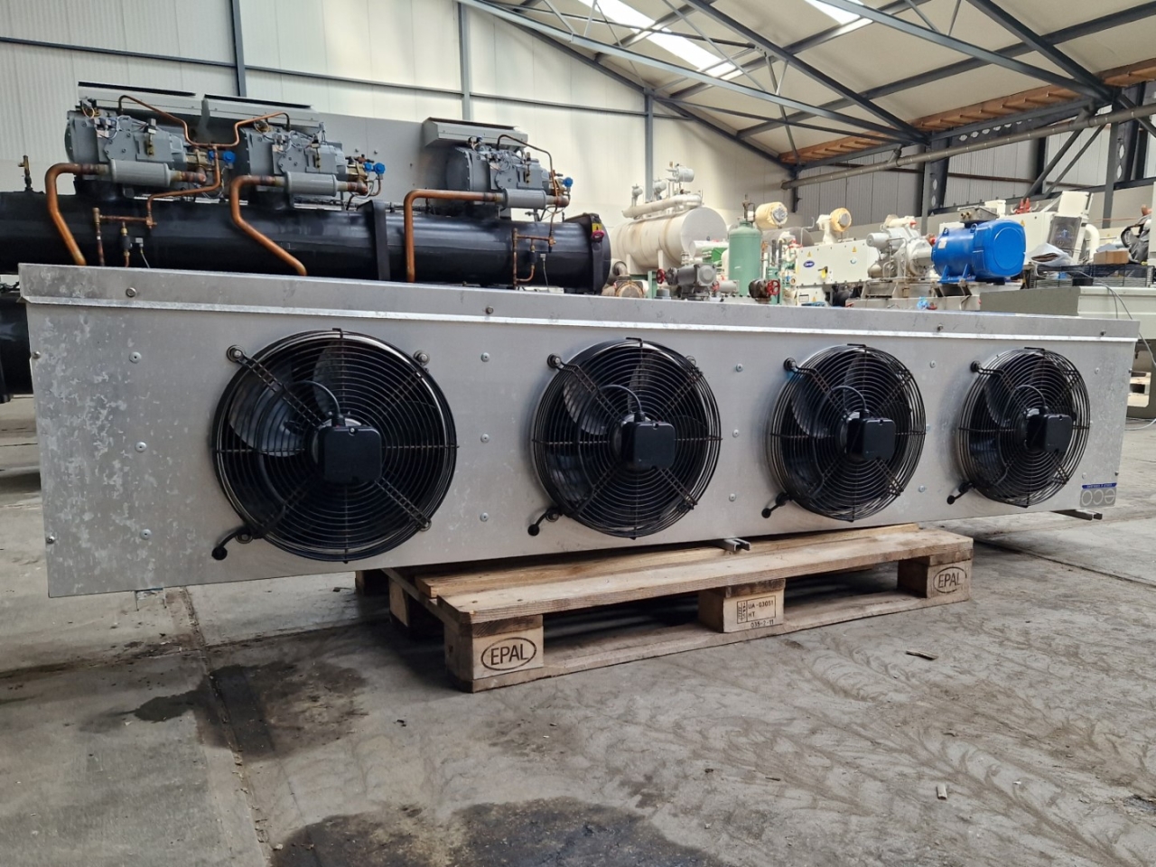 Gebrauchter Öko-Verdampfer auf Freonbasis. Komplett mit 4 EBM-Papst A4E350-AQ02-12-Lüftern – 50/60 Hz – 0,15/0,21 kW – 1450/1700 U/min – Durchmesser 630 mm und einem Gesamtluftstrom von 13.500 m³/h.