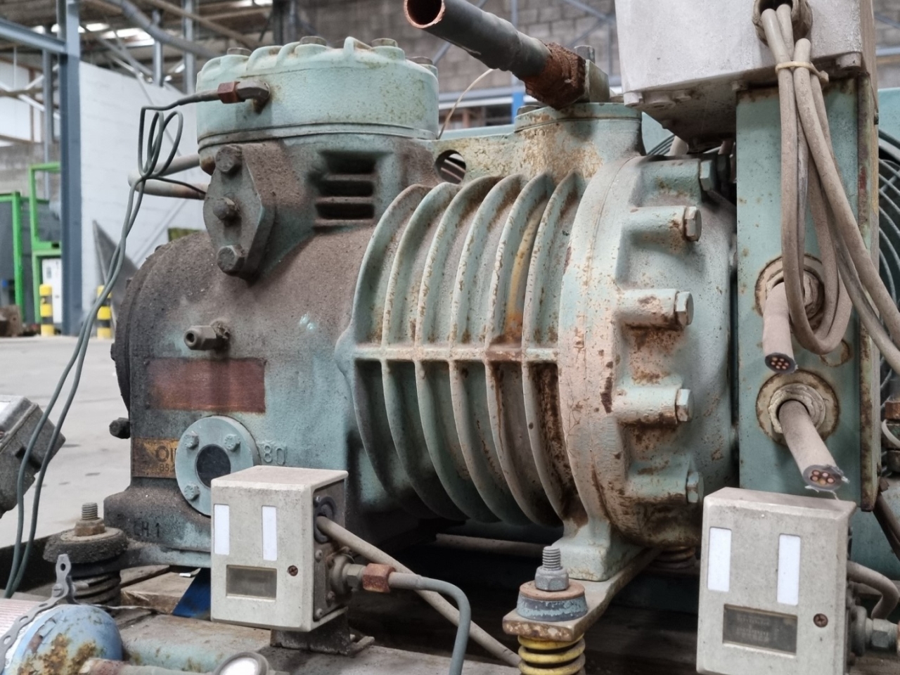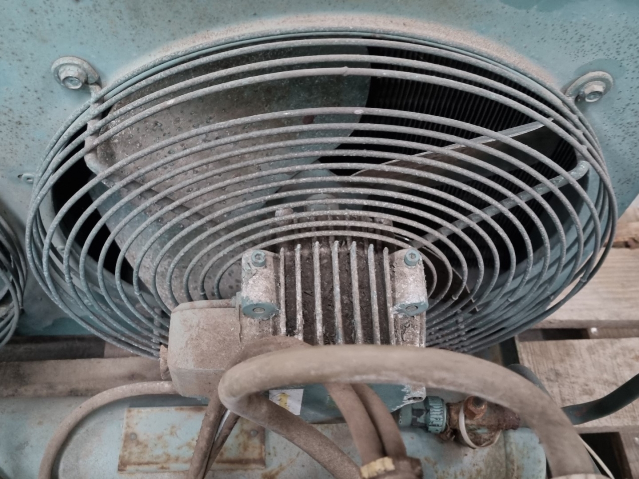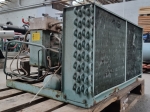 Gebrauchte Bitzer-Verflüssigungseinheit mit Freon. Komplett mit einem halbhermetischen Bitzer-Zweizylinder-Kompressor, einem Kondensator mit zwei Lüftern, einem Flüssigkeitssammler und einem Filtertrockner für die Flüssigkeitsleitung.