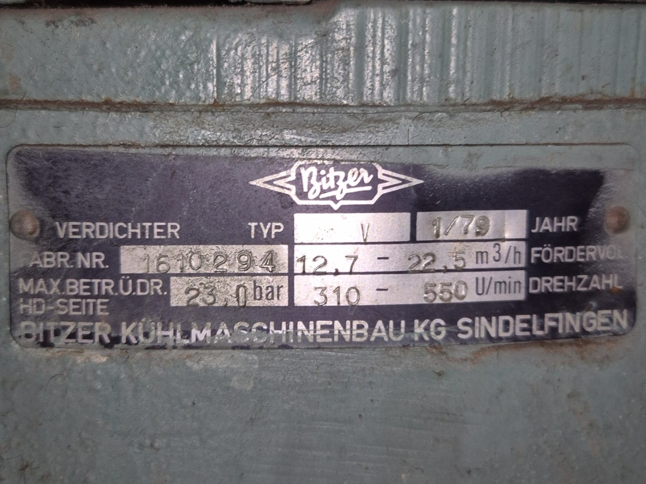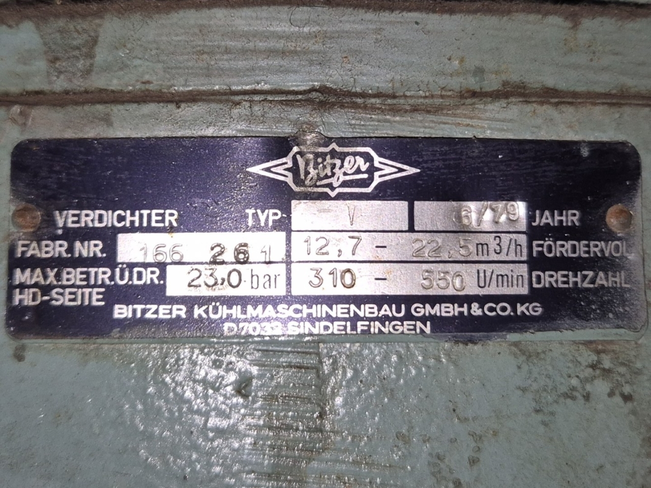 Gebrauchter Bitzer V Kolbenkompressor mit offenem Antrieb, betrieben mit Freon und einem Fördervolumen zwischen 12,7 m³/h und 22,5 m³/h.