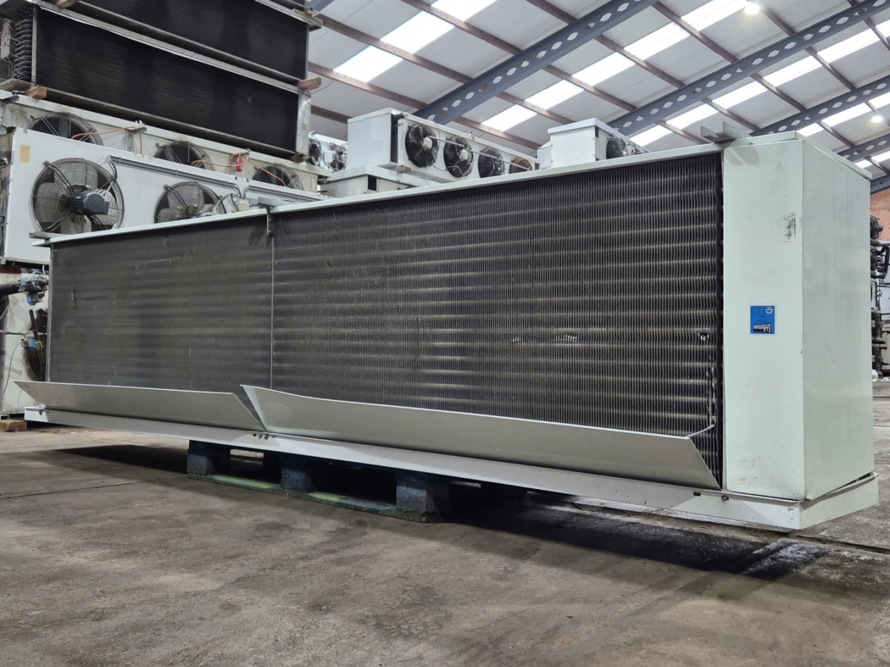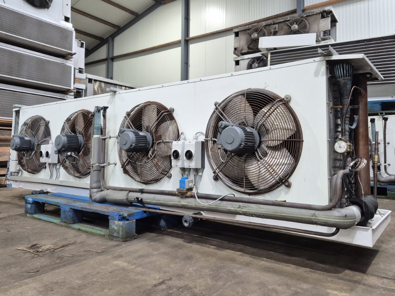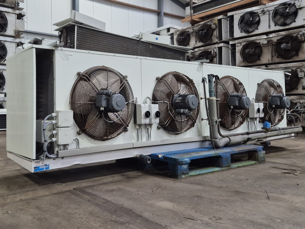 Gebrauchter Helpman LEX 30-7 Freon-Verdampfer mit Heißgas- und elektrischer Abtaufunktion. Komplett mit 4 ATB RBFT0,25/4-7R Ventilatoren – 50 Hz – 0,22 kW – 1330 U/min – Durchmesser 508 mm und einem Luftdurchsatz von 26.000 m³/h.