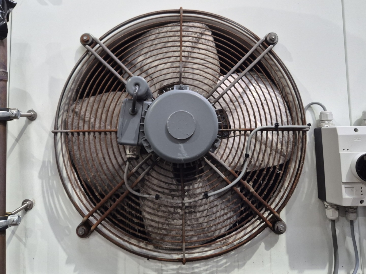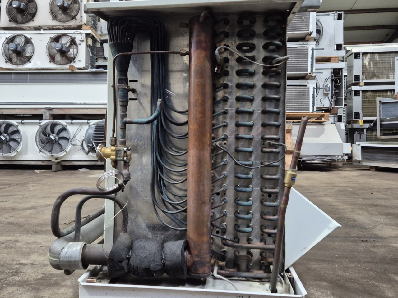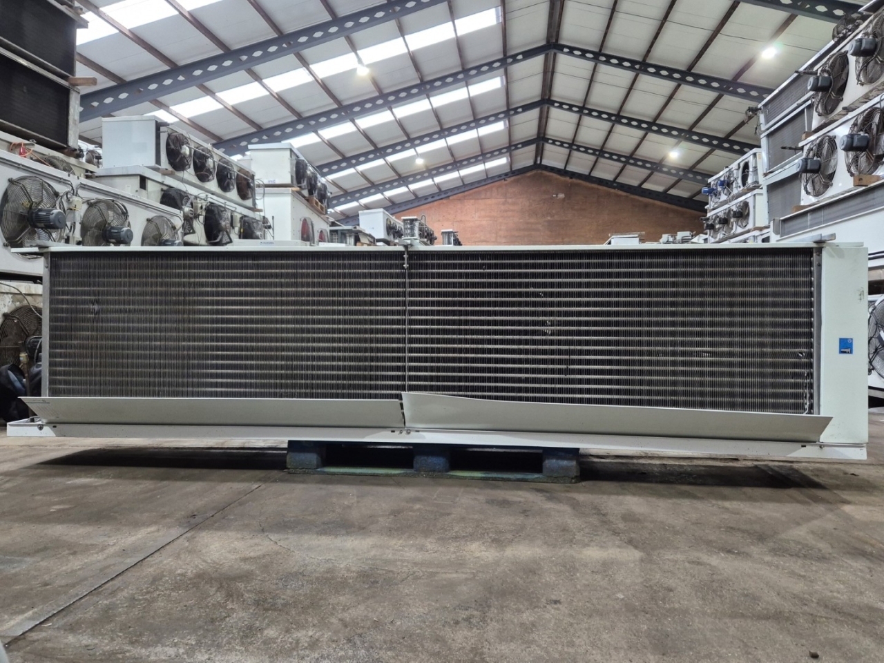 Gebrauchter Helpman LEX 30-7 Freon-Verdampfer mit Heißgas- und elektrischer Abtaufunktion. Komplett mit 4 ATB RBFT0,25/4-7R Ventilatoren – 50 Hz – 0,22 kW – 1330 U/min – Durchmesser 508 mm und einem Luftdurchsatz von 26.000 m³/h.