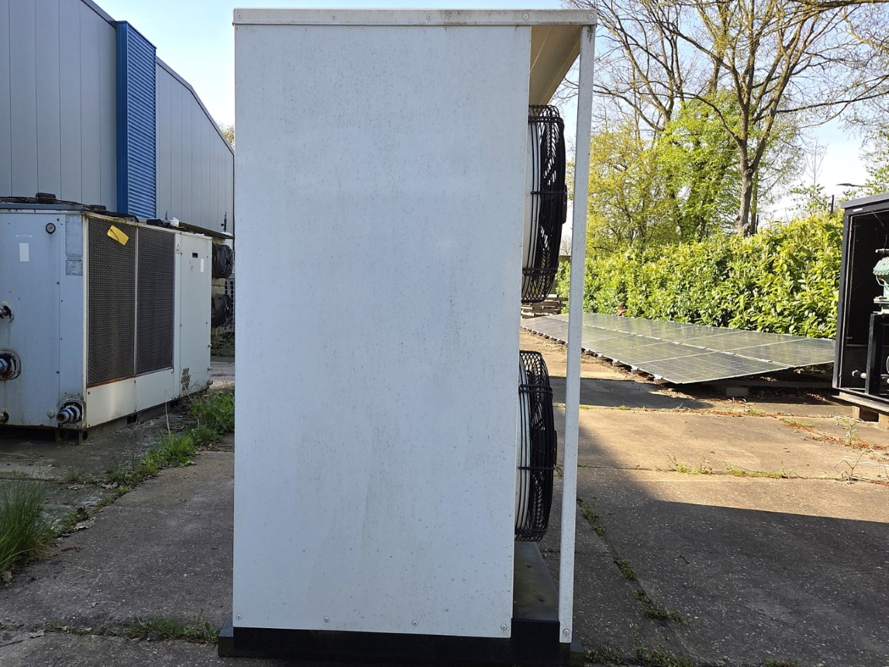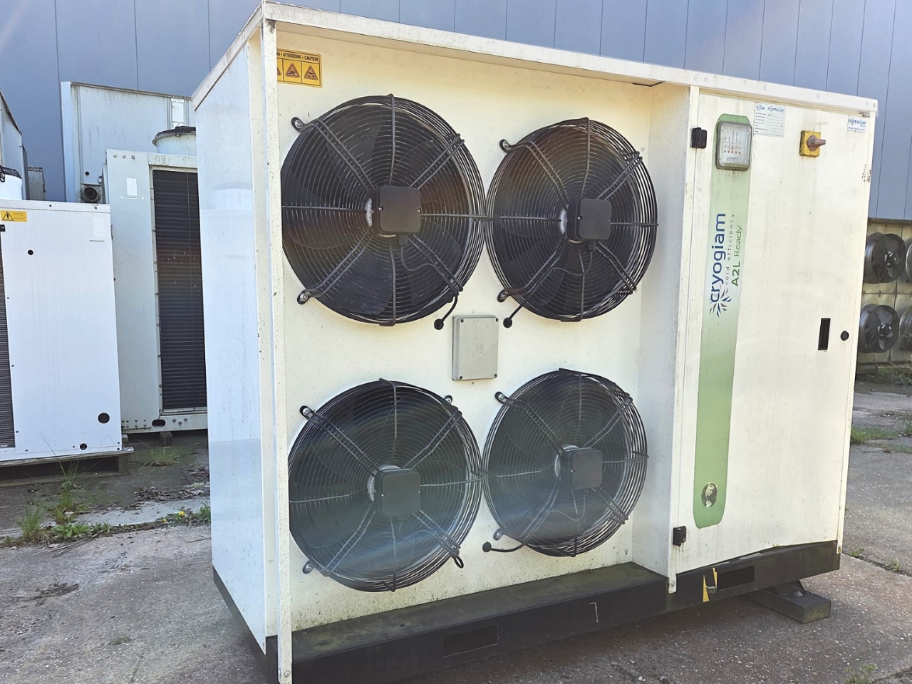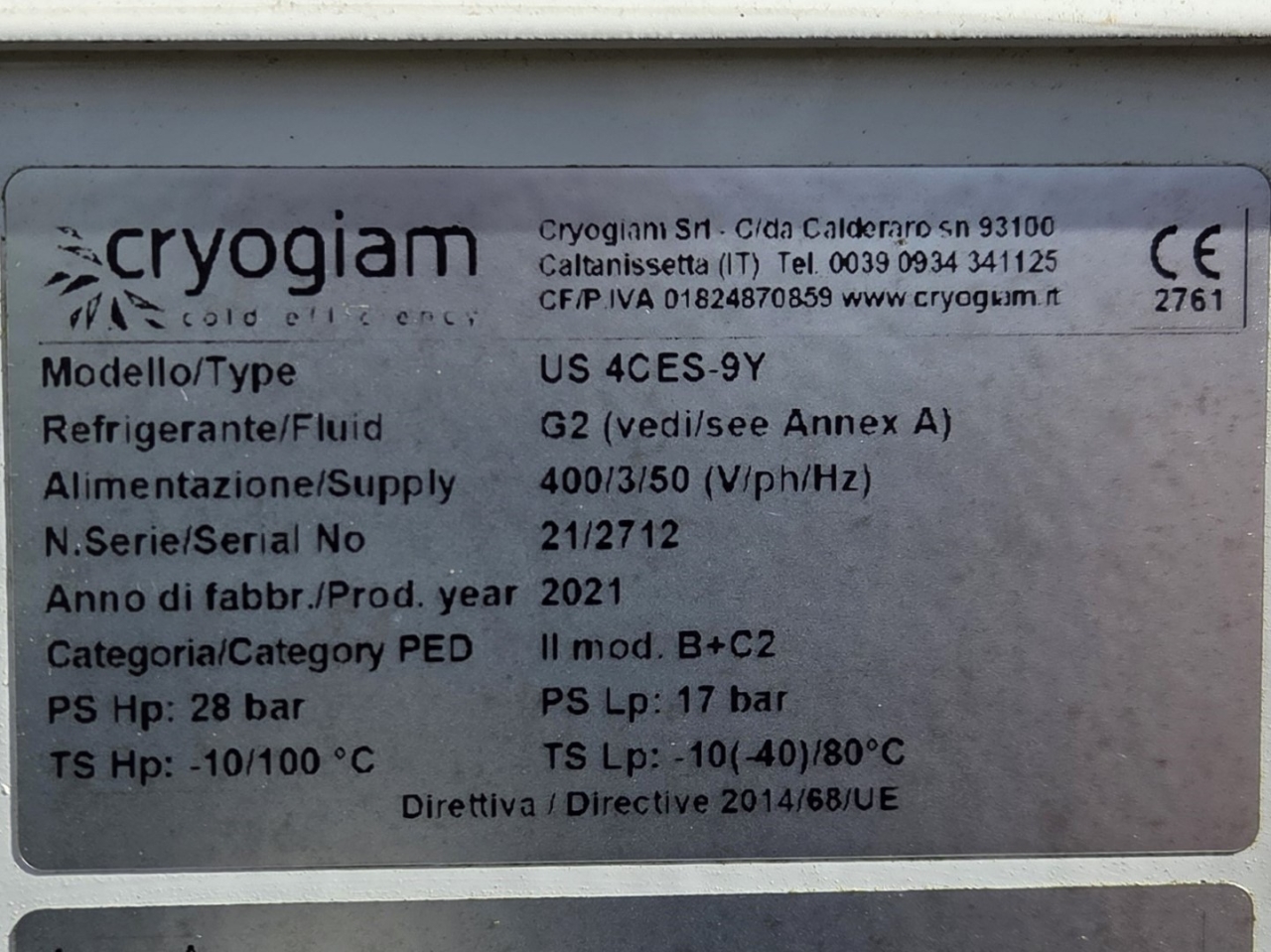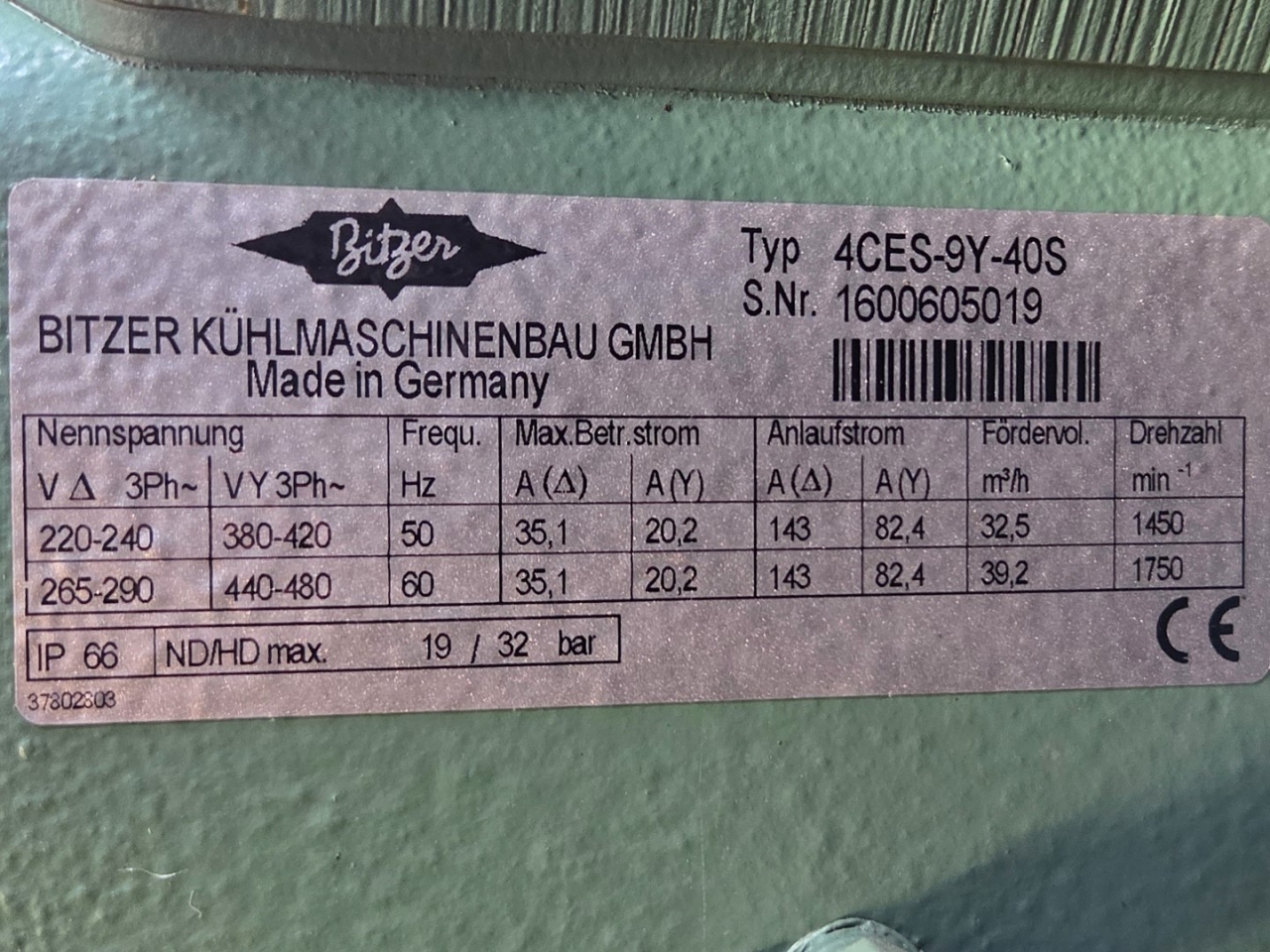 .Gebrauchte Cryogiam US 4CES-9Y-Verflüssigungsanlage mit Freon-Betrieb. Komplett mit Bitzer 4CES-9Y-40S halbhermetischem Hubkolbenkompressor, Verflüssiger mit 4 Lüftern YDWF74L60P4-522B-450 S (50/60 Hz, 0,36/0,25 kW, 1424/1362 U/min, 450 mm Durchmesser), Frigomec-Flüssigkeitsbehälter, Frigomec-Auslassschalldämpfer SLT-76/22, Druck- und Sicherheitsschaltern sowie Schaltschrank mit Cryogiam-Bedienfeld zur Temperaturregelung. Die Kompressorleistung beträgt 32,5 m³/h bei 50 Hz.