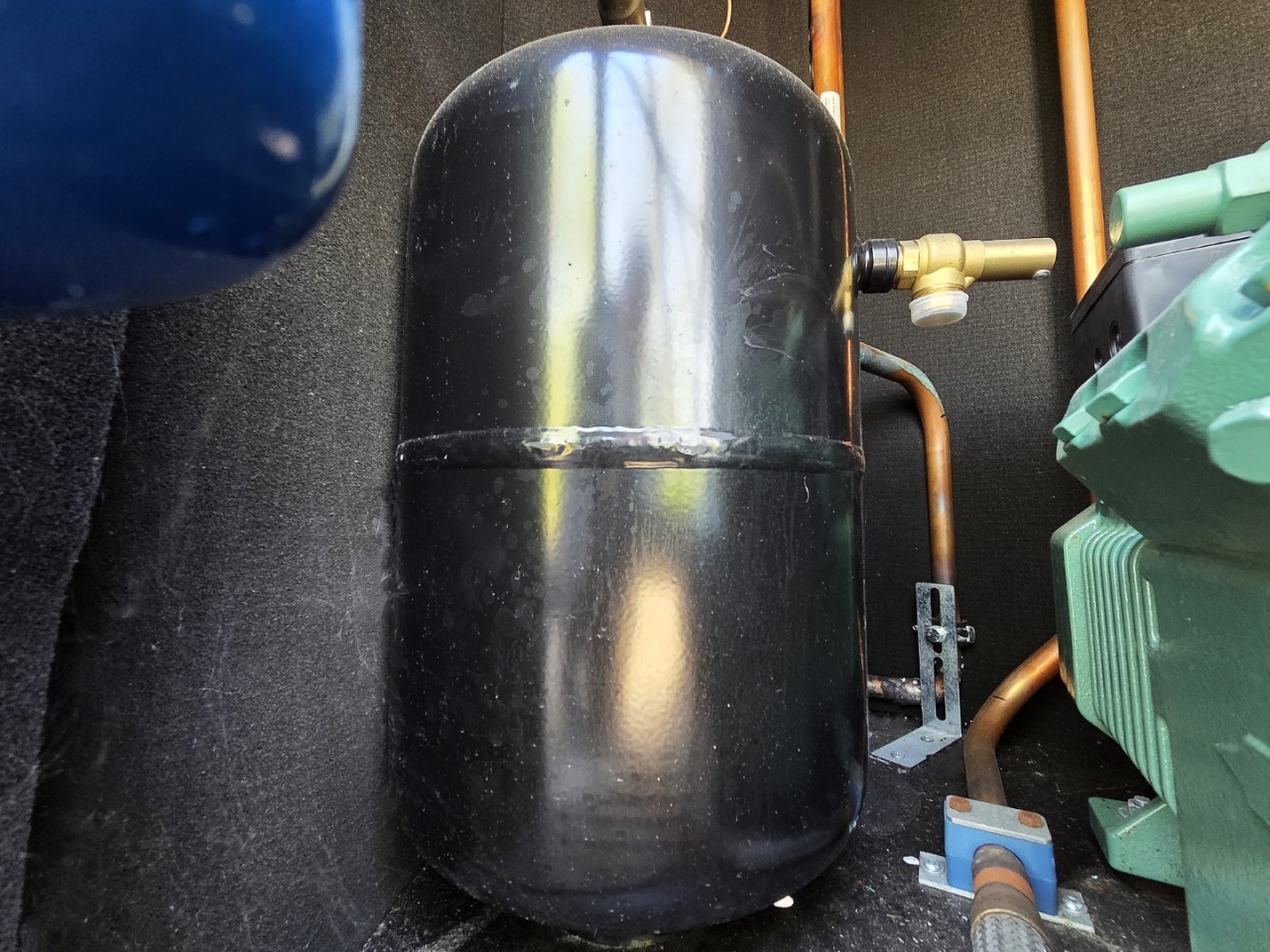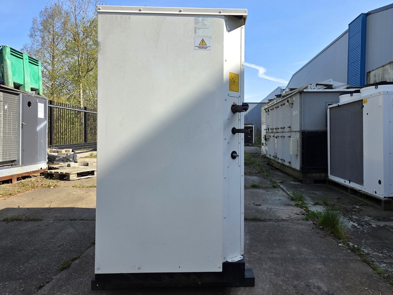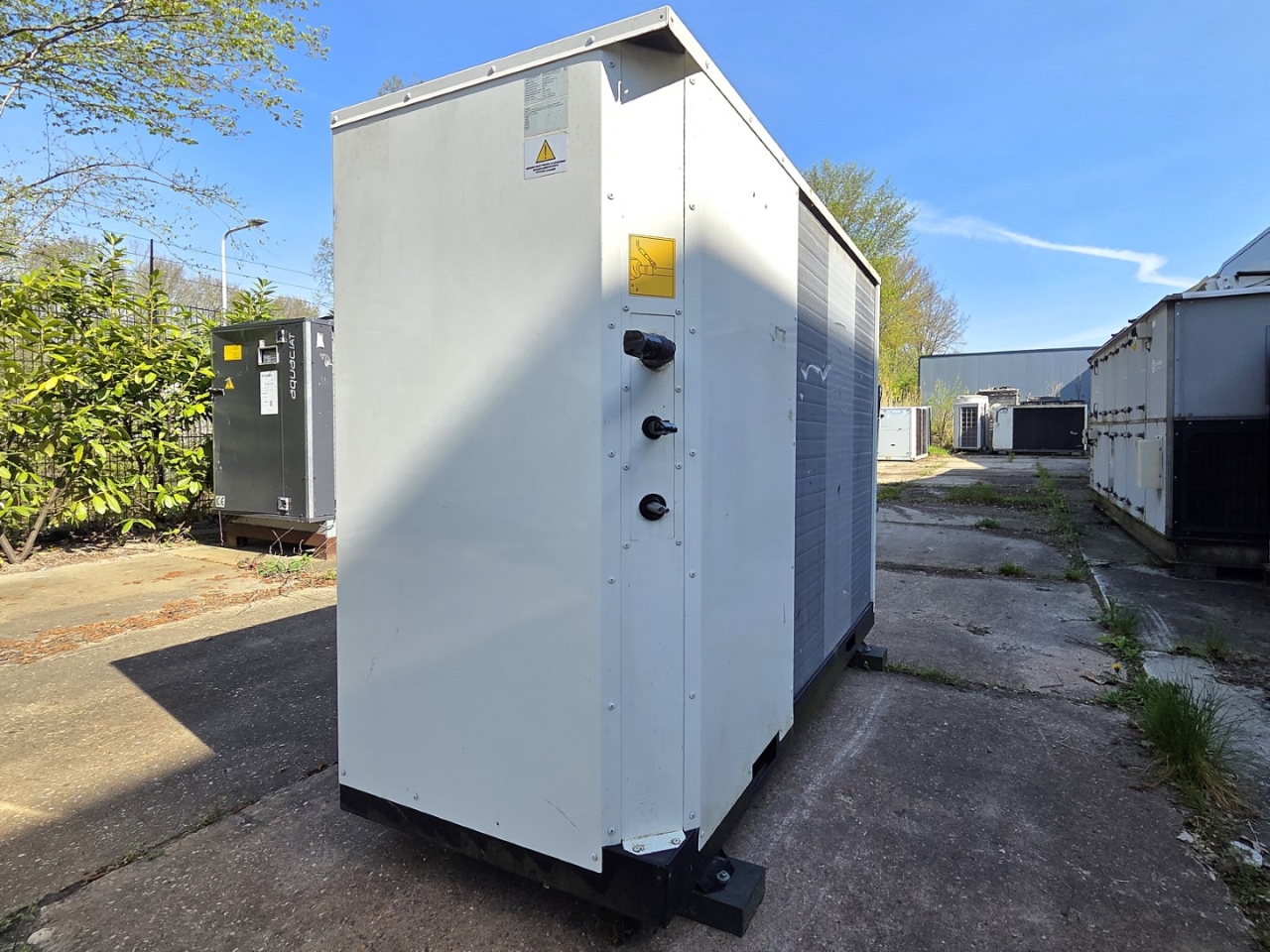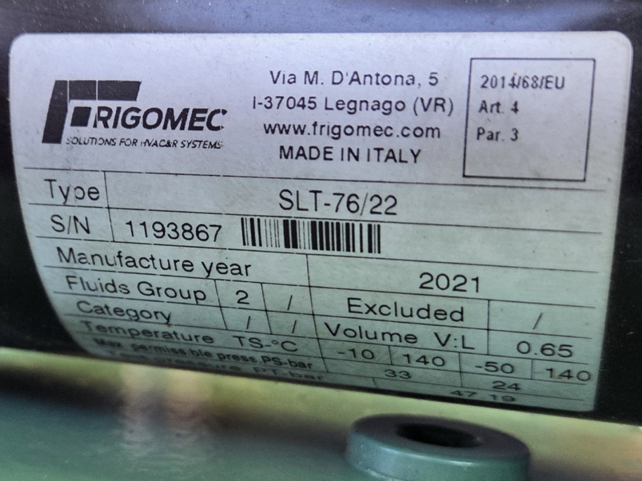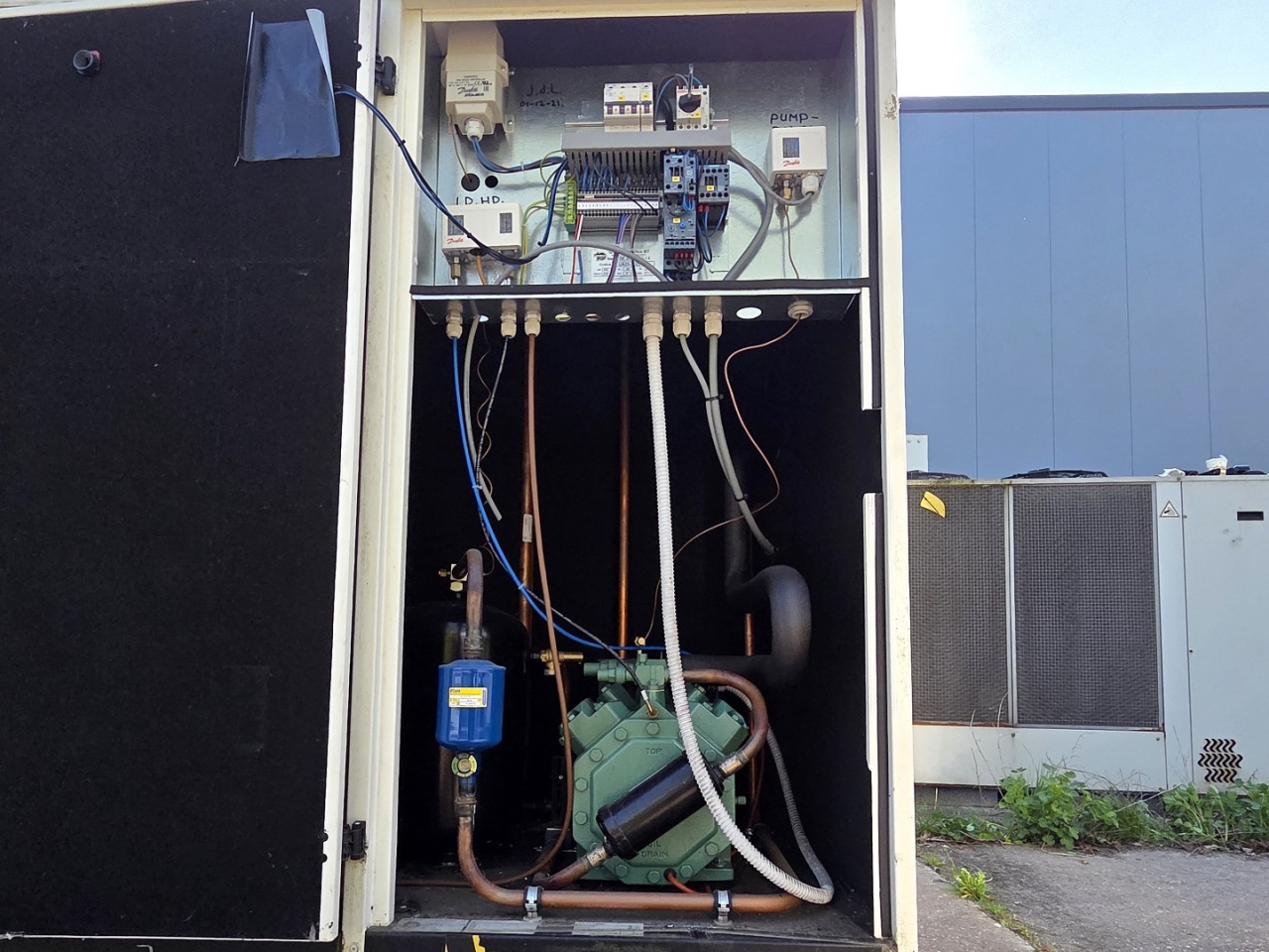 .Gebrauchte Cryogiam US 4CES-9Y-Verflüssigungsanlage mit Freon-Betrieb. Komplett mit Bitzer 4CES-9Y-40S halbhermetischem Hubkolbenkompressor, Verflüssiger mit 4 Lüftern YDWF74L60P4-522B-450 S (50/60 Hz, 0,36/0,25 kW, 1424/1362 U/min, 450 mm Durchmesser), Frigomec-Flüssigkeitsbehälter, Frigomec-Auslassschalldämpfer SLT-76/22, Druck- und Sicherheitsschaltern sowie Schaltschrank mit Cryogiam-Bedienfeld zur Temperaturregelung. Die Kompressorleistung beträgt 32,5 m³/h bei 50 Hz.