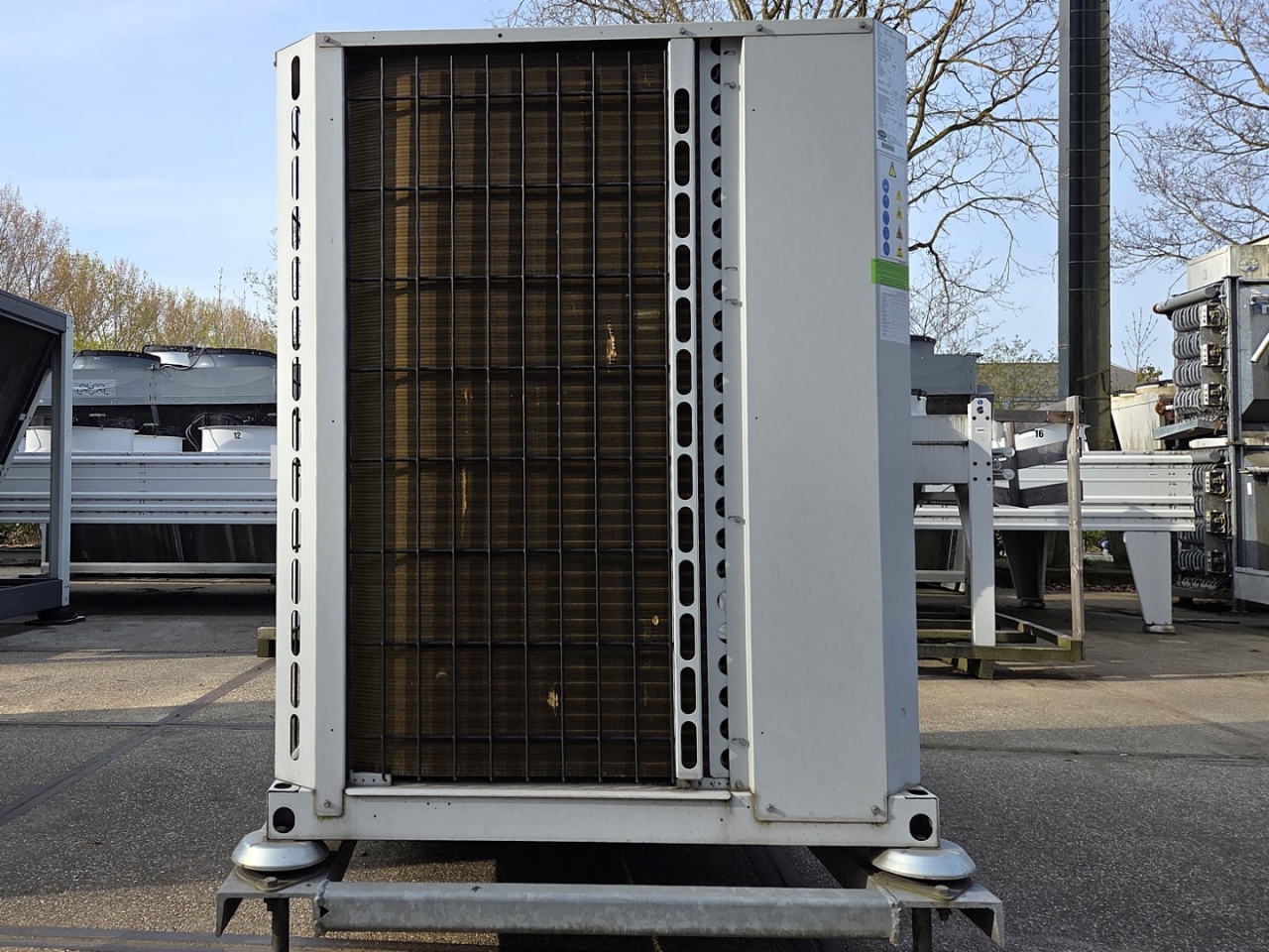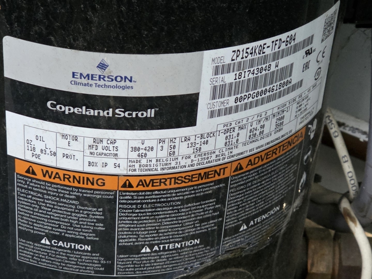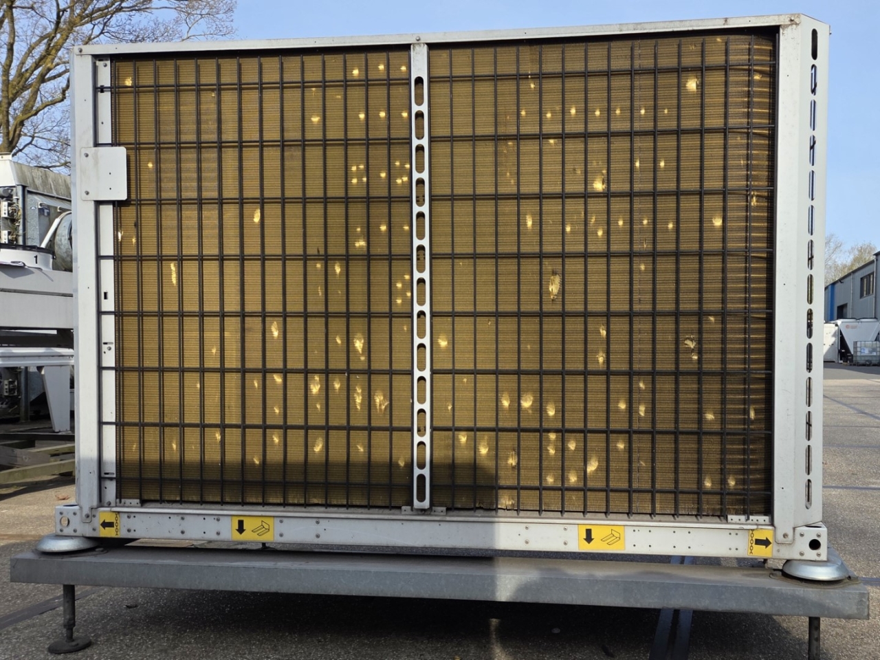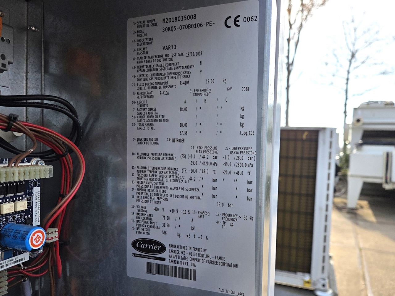 Gebrauchte luftgekühlter Kaltwassersatz Carrier 30 RQS 070 mit Kältemittel R410A. Komplett mit 2 Copeland ZP154KQE-TFD-604 Scrollverdichtern, Swep F80Hx86/1P-NC-F gelötetem Wärmetauscher als Verdampfer, Carrier PA0AA02A02 Ventilator (50 Hz, 970/480 U/min, 1,4/0,19 kW), Grundfos Wasserpumpe, Ausdehnungsgefäß, Mecasem OOPSG001170800B Druckluftbehälter (14 Liter) und Schaltschrank mit Carrier Touch Pilot.