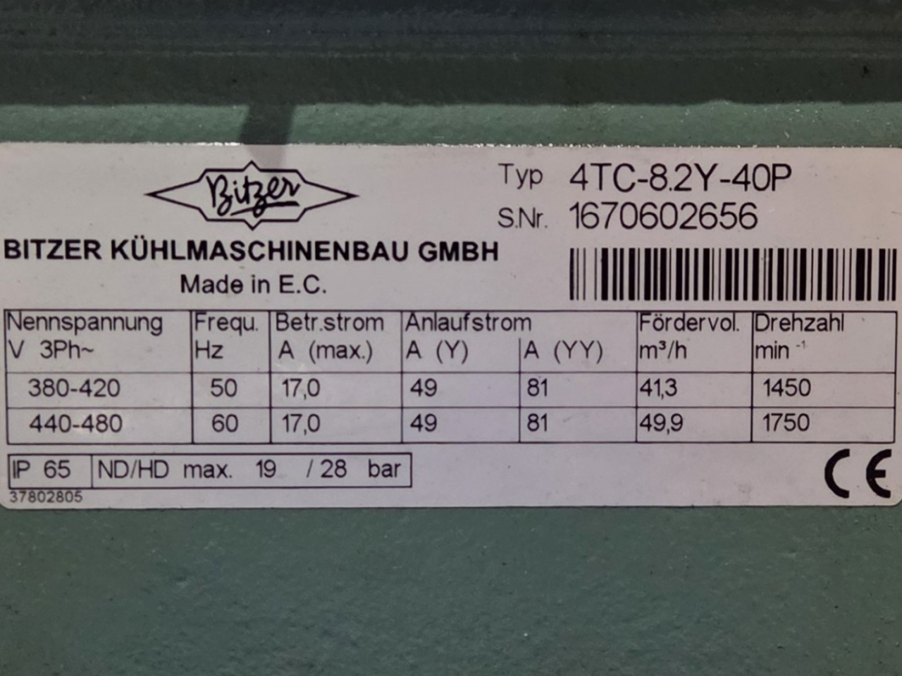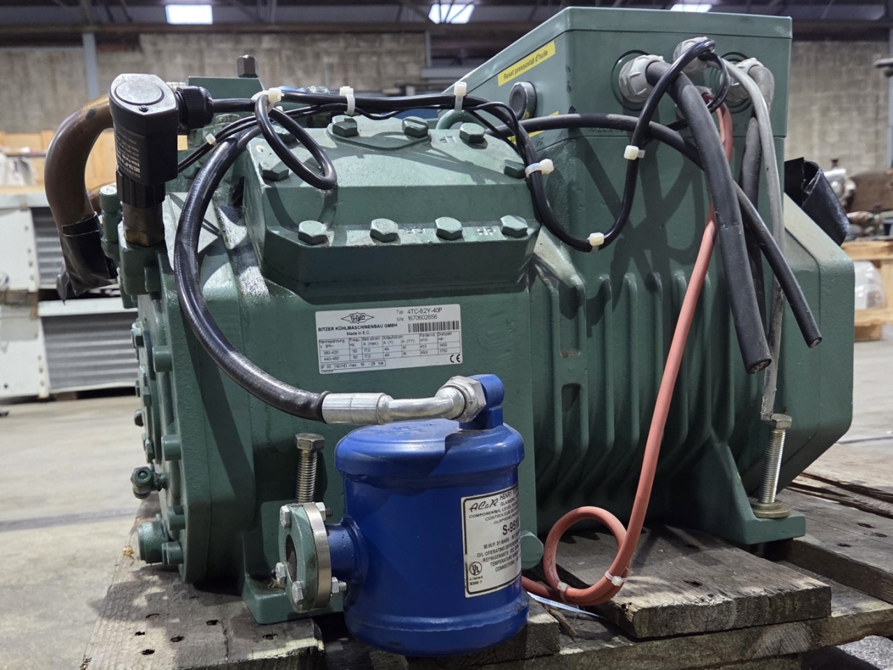 Used Bitzer 4TC-8.2Y-40P semi-hermetic reciprocating compressor on Freon. Complete with a oil level system AC&R Henry Technologies S-9510 and a sight glass. The compressor has a displacement of 41,3 m³/h at 50 Hz and 49,9 m³/h at 60 Hz.