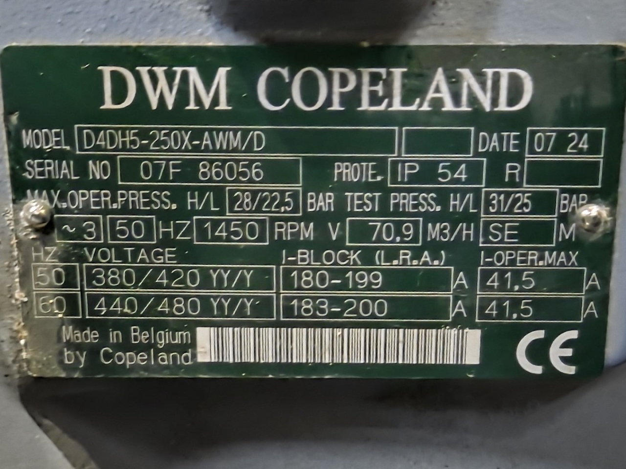 Used DWM Copeland D4DH5-250X-AWM/D semi-hermetic piston compressor on Freon. Complete with a oil level system AC&R and a sight glass. The compressor has a displacement of 70,9 m³/h at 50 Hz.
