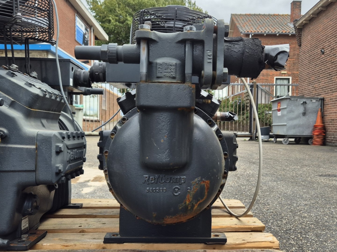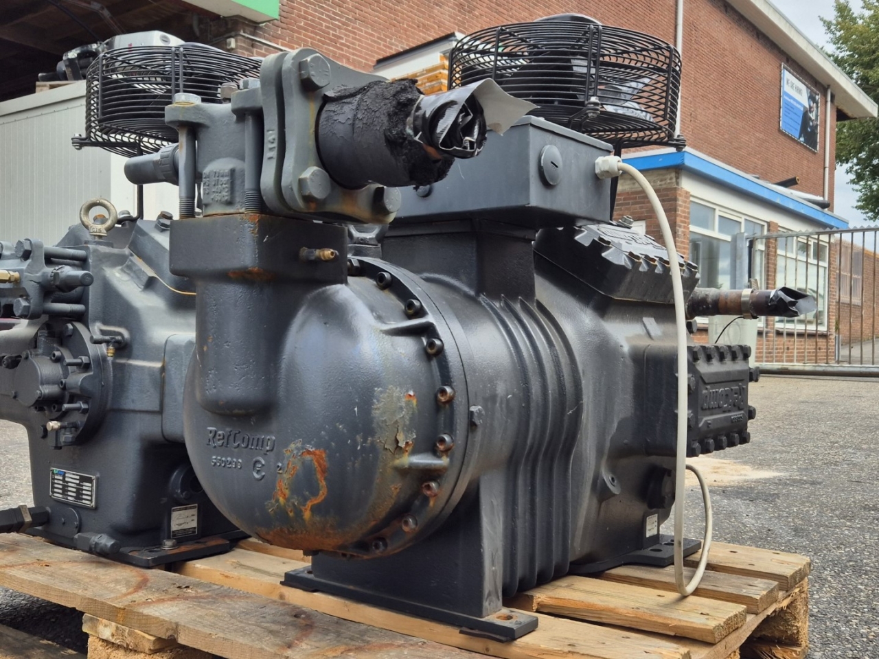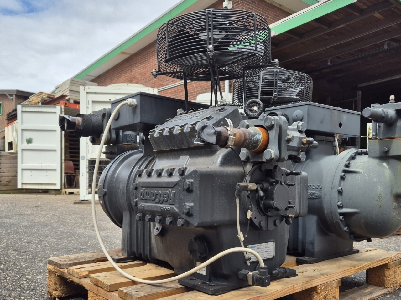 Used Refcomp SRC-L160L0 semi-hermetic reciprocating compressor on Freon built in 2016. Complete with a Hidria R09R-3132P-4T-3561 head fan and a sight glass. The compressor has a displacement of 184 m³/h.