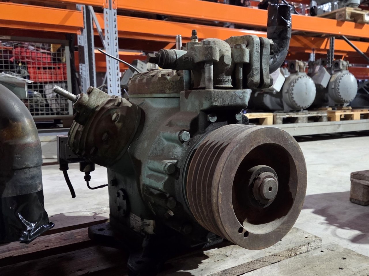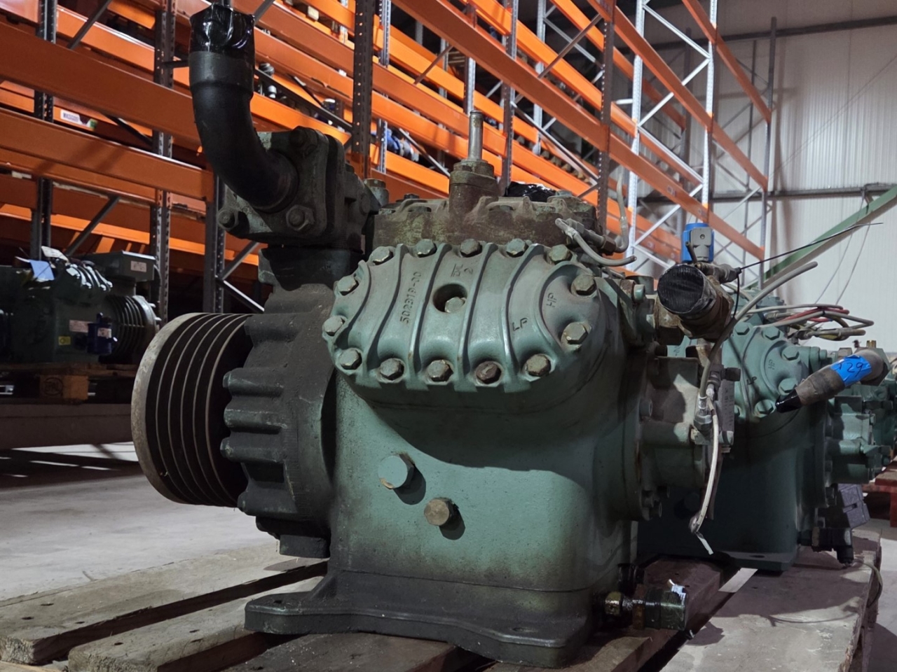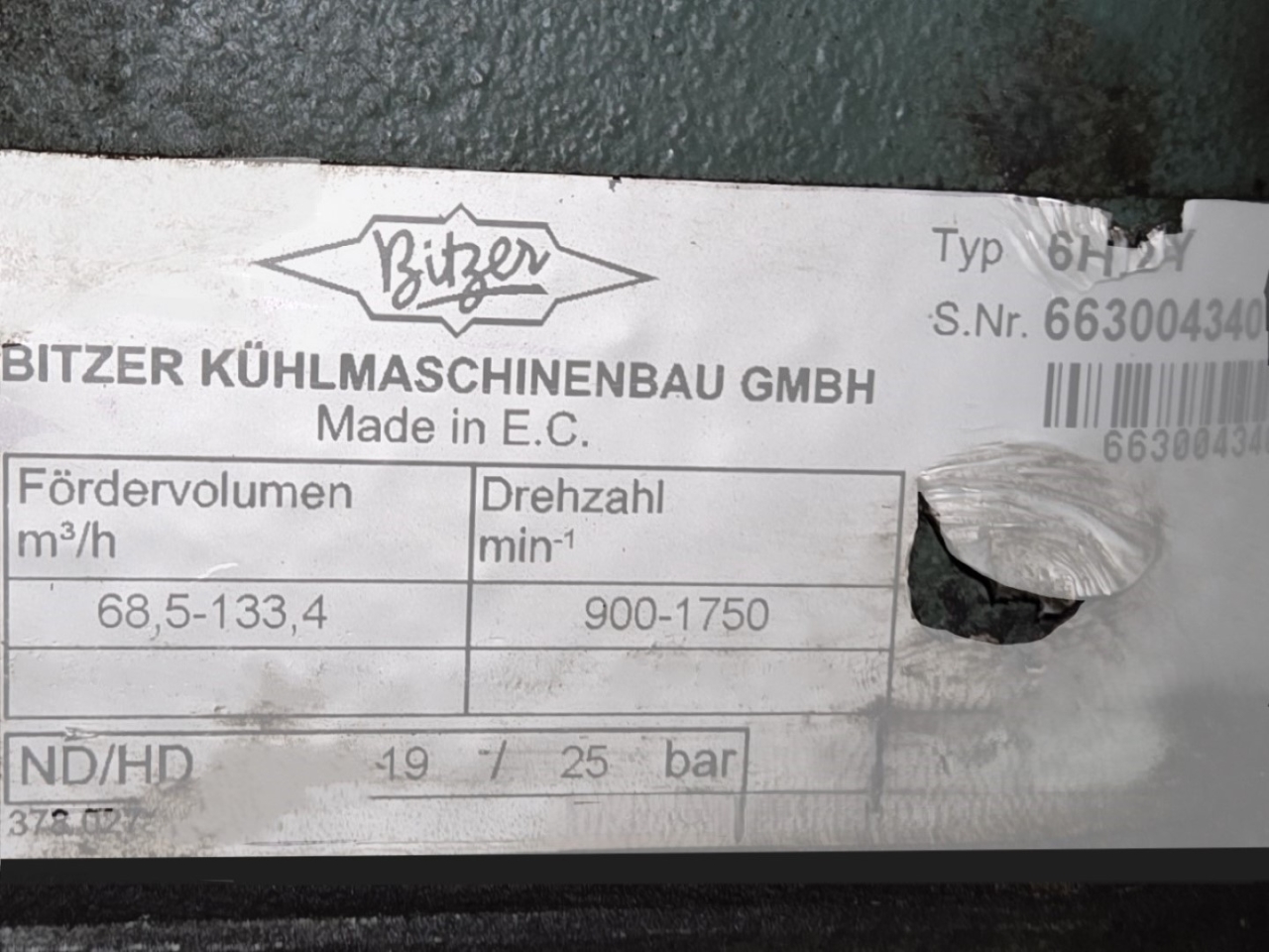 Used Bitzer 6H.2Y open-type reciprocating compressor on Freon with a sight glass. The compressor has a displacement between 68,5 - 133,4 m³/h at 900 - 1750 RPM.