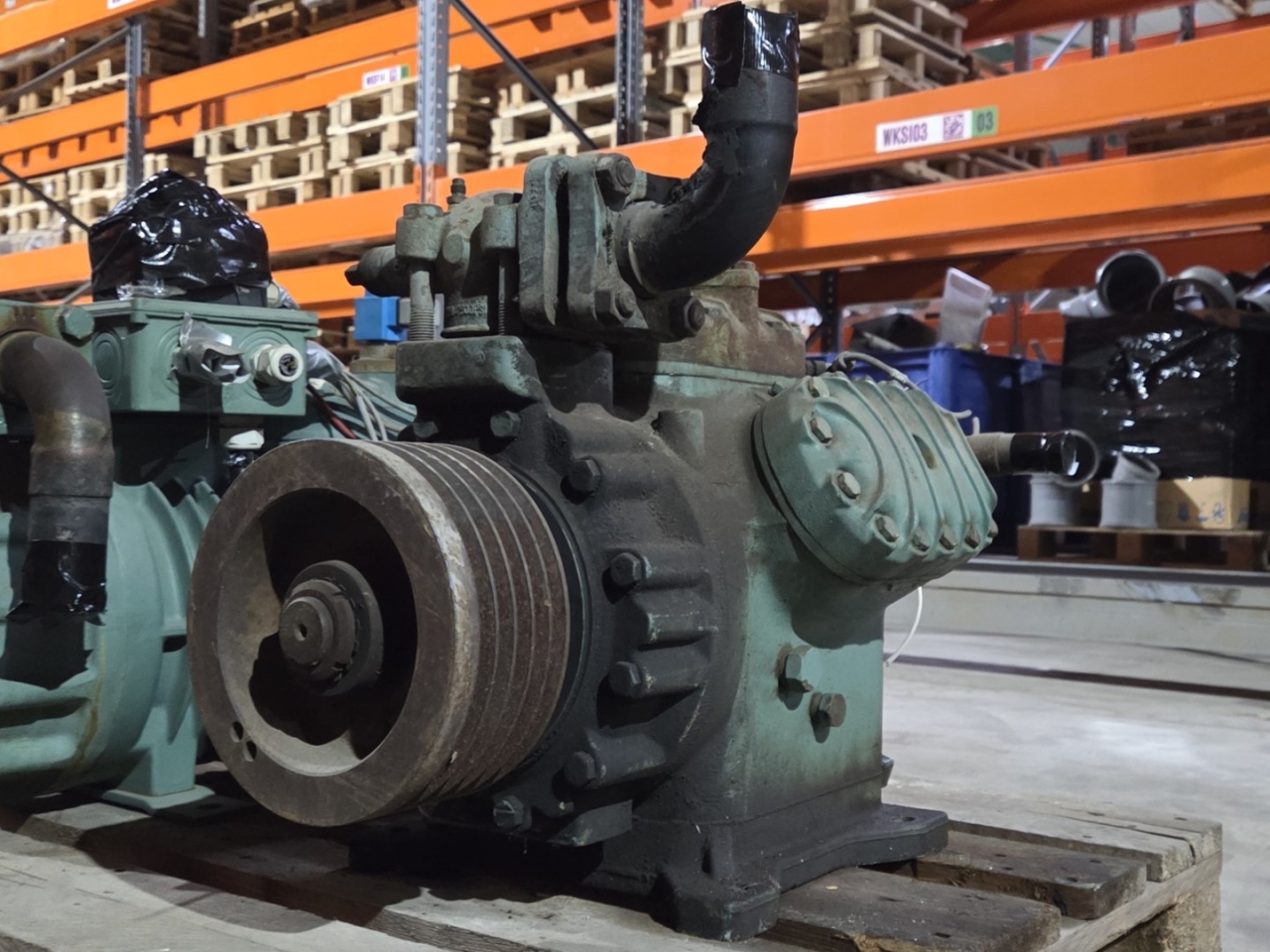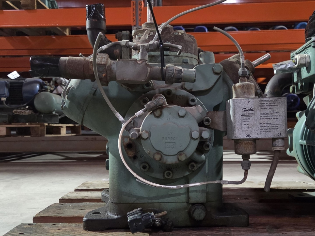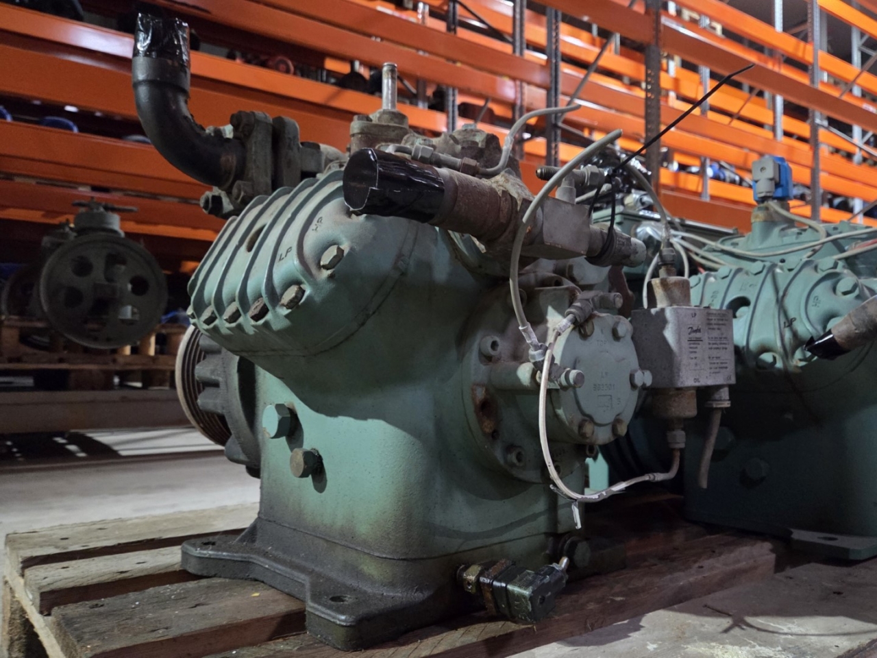 Used Bitzer 6H.2Y open-type reciprocating compressor on Freon with a sight glass. The compressor has a displacement between 68,5 - 133,4 m³/h at 900 - 1750 RPM.