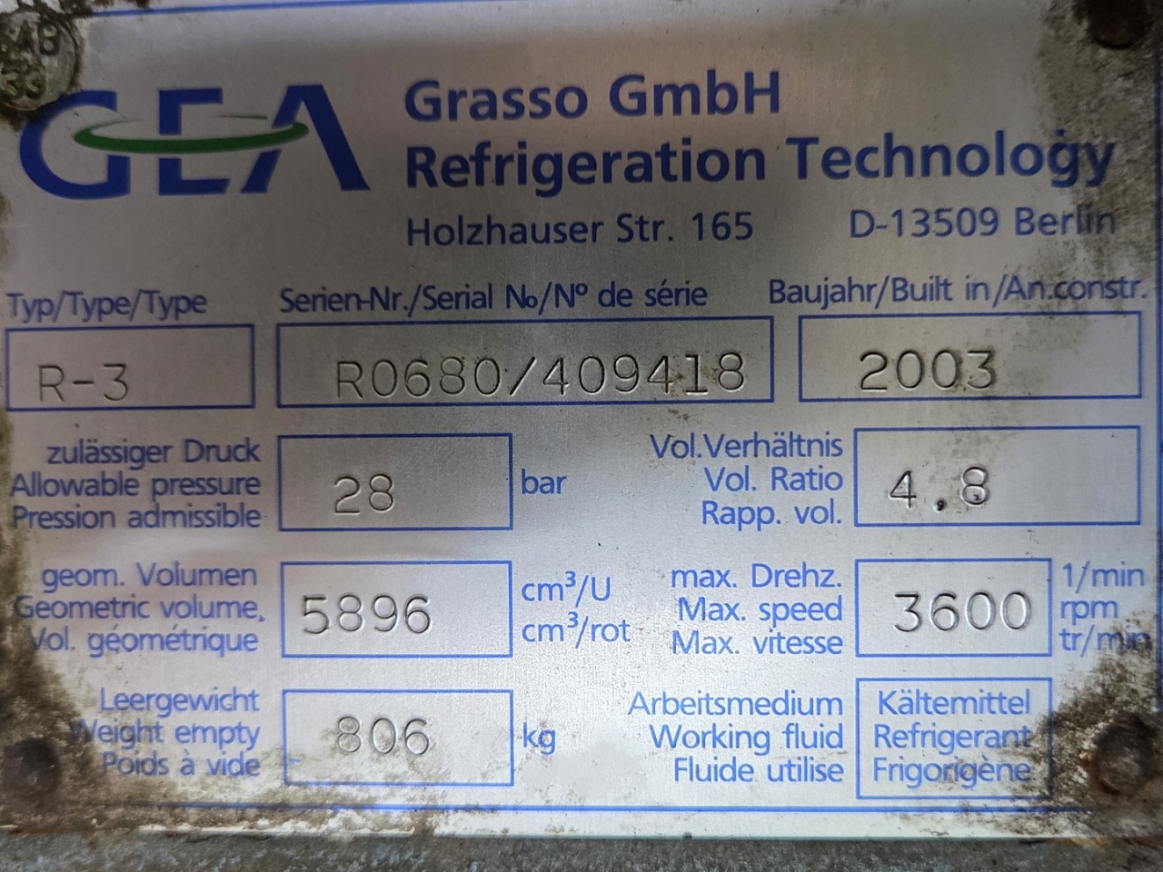 Used Grasso R-3 screw compressor on Freon.