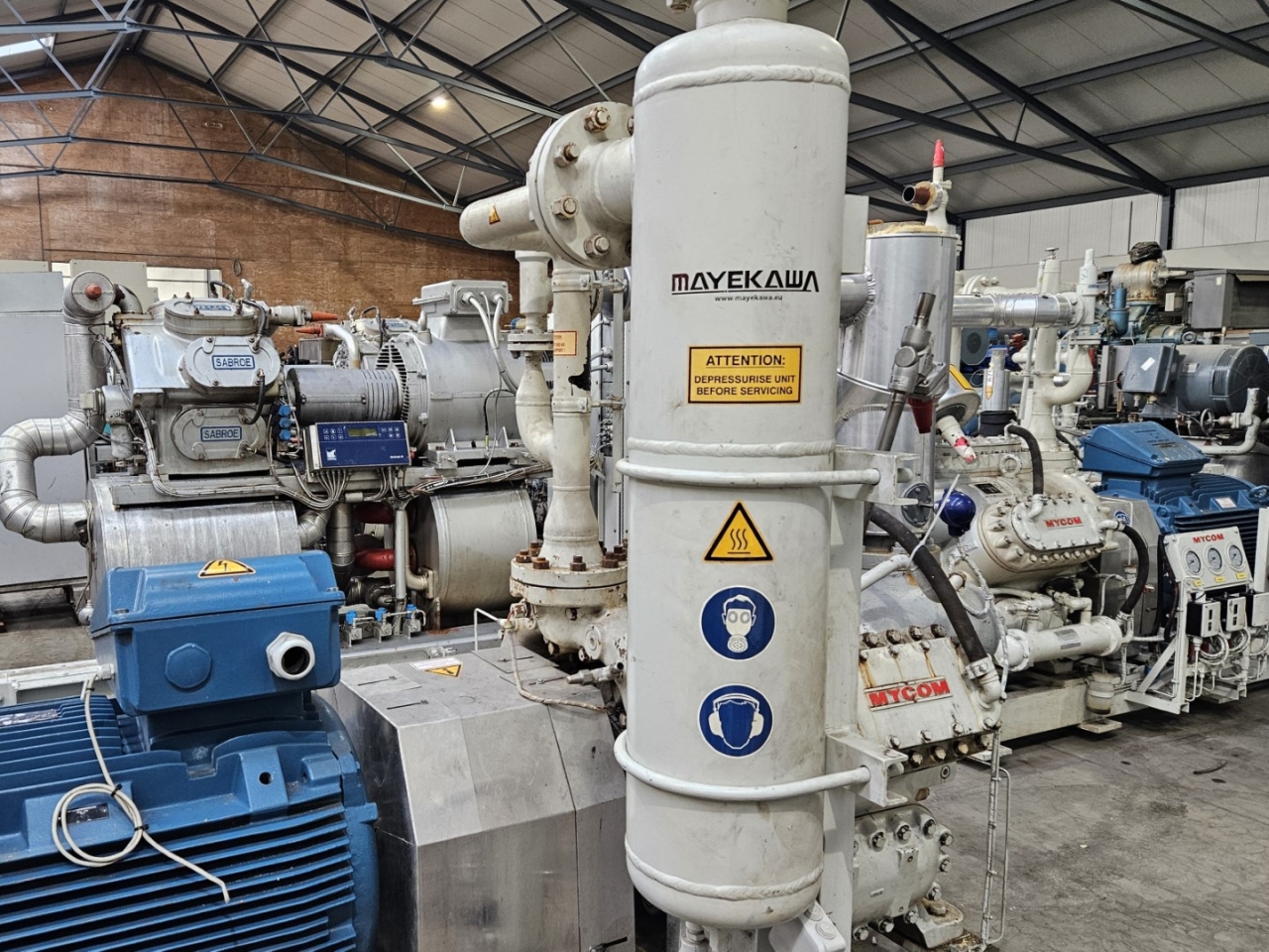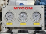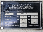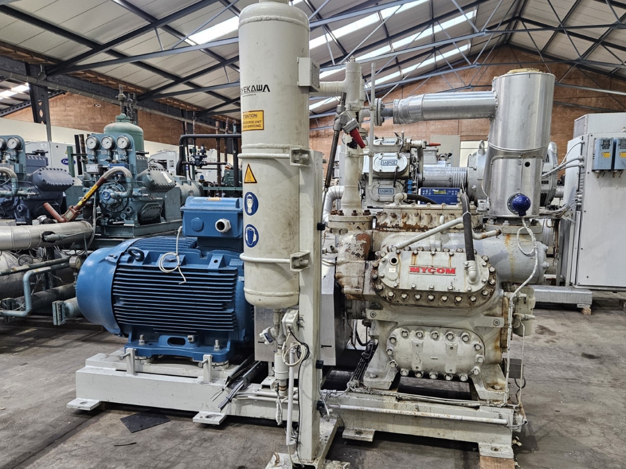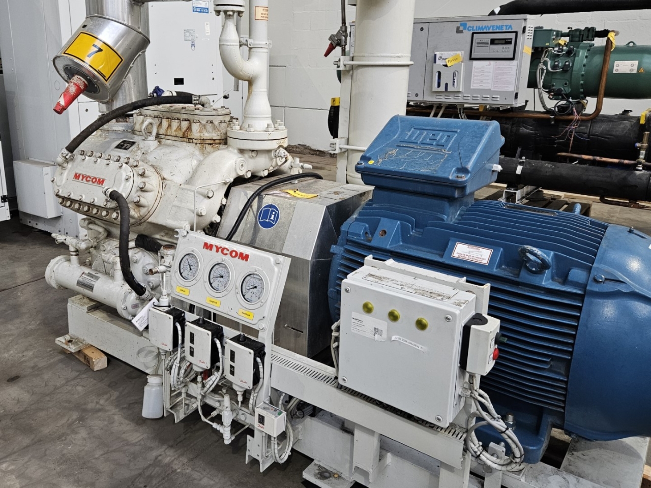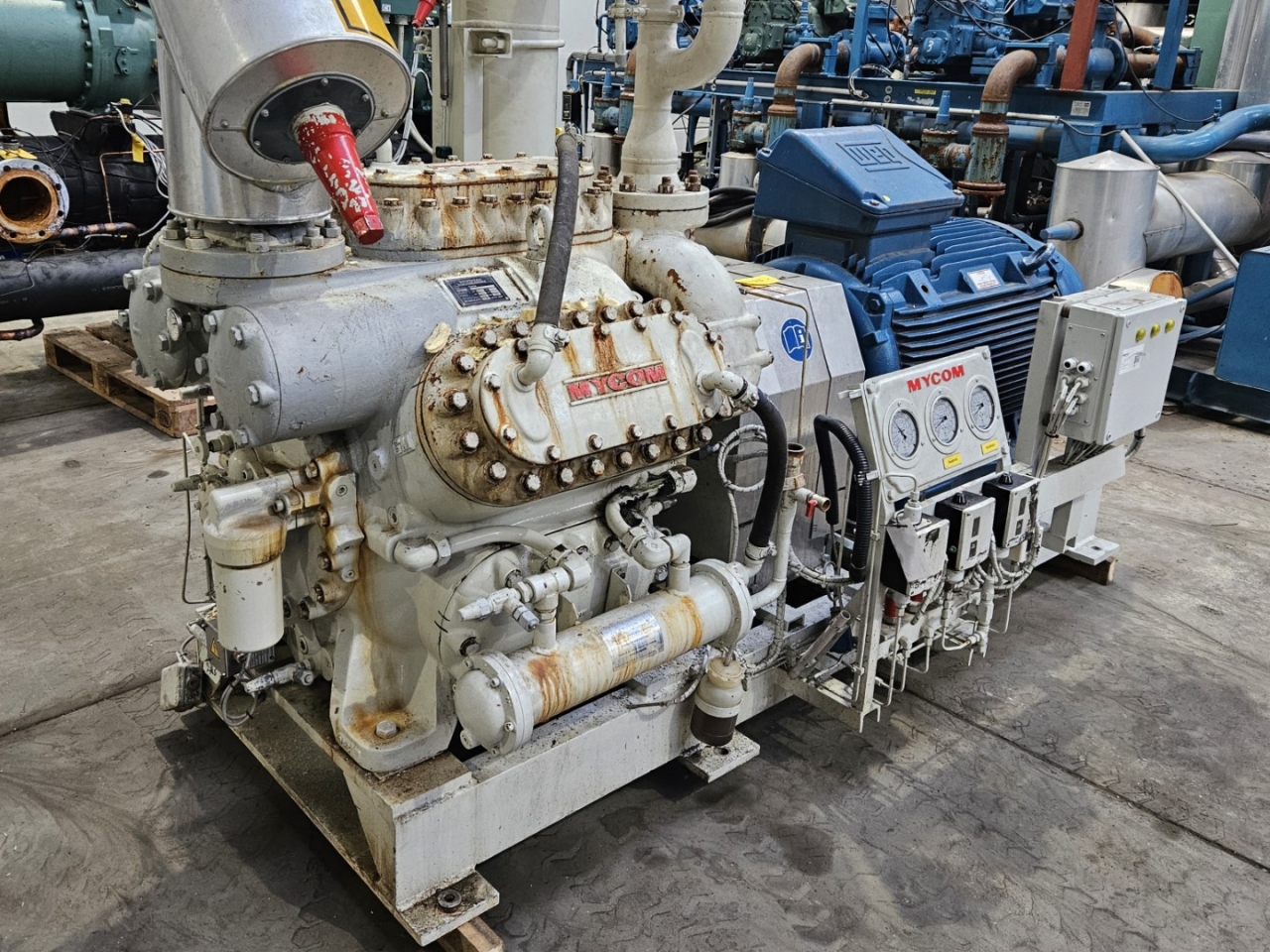 Used Mycom N6M reciprocating compressor on NH3 with head cooling. Complete with WEG 315SM6 electric motor - 50/60 Hz - 132/151 kW - 990/1185 RPM, Mayekawa OSF250-26/52-RM4-CE oil separator, oil cooler and pressure and safety switches/gauges. The compressor has a displacement of 958 m³/h.