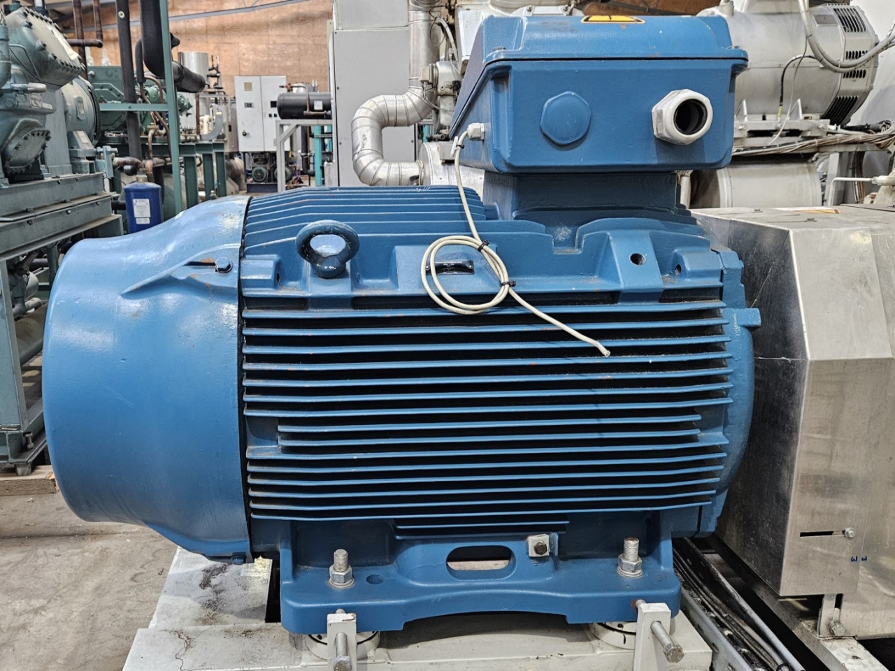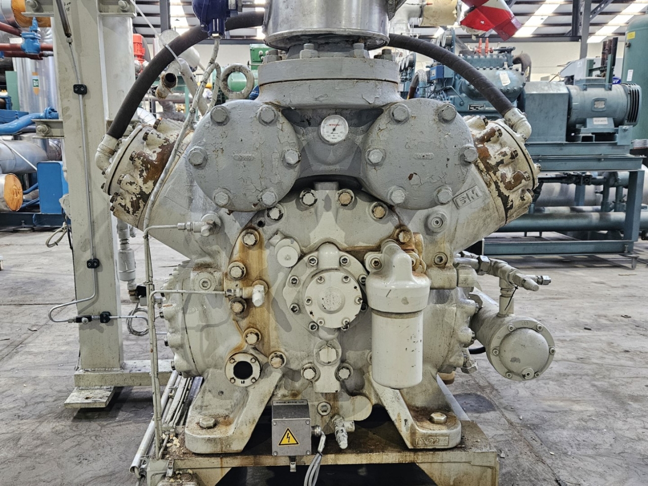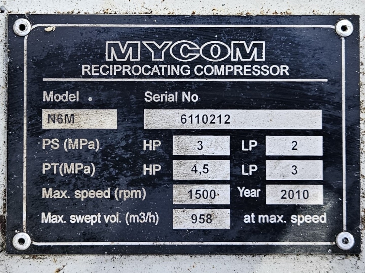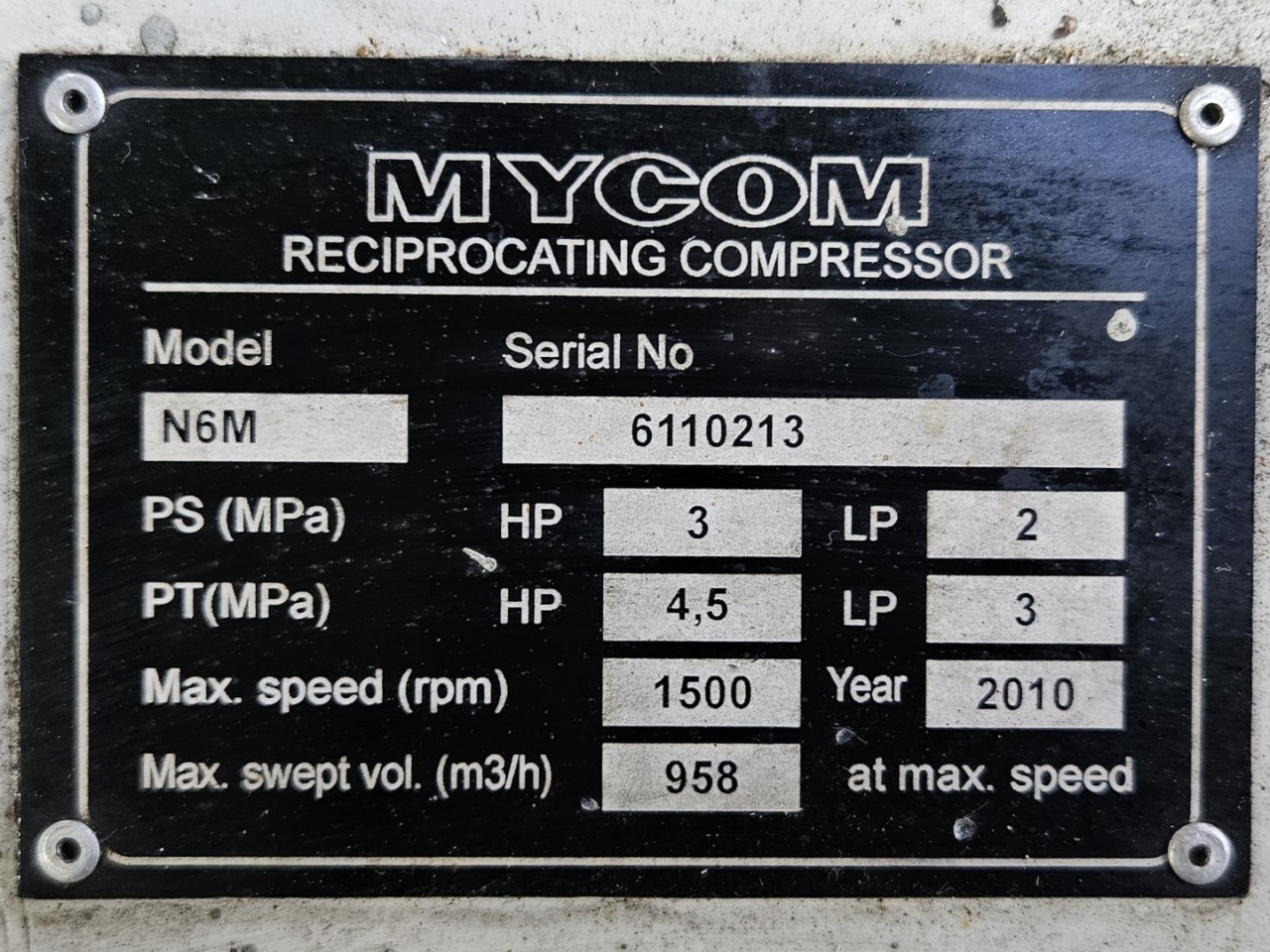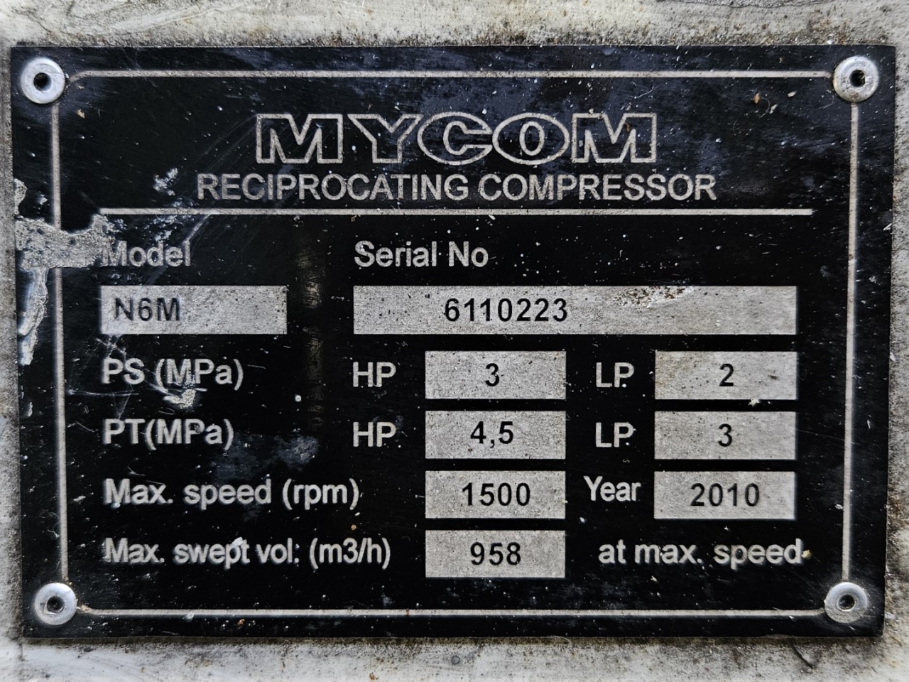 Used Mycom N6M reciprocating compressor on NH3 with head cooling. Complete with WEG 315SM6 electric motor - 50/60 Hz - 132/151 kW - 990/1185 RPM, Mayekawa OSF250-26/52-RM4-CE oil separator, oil cooler and pressure and safety switches/gauges. The compressor has a displacement of 958 m³/h.