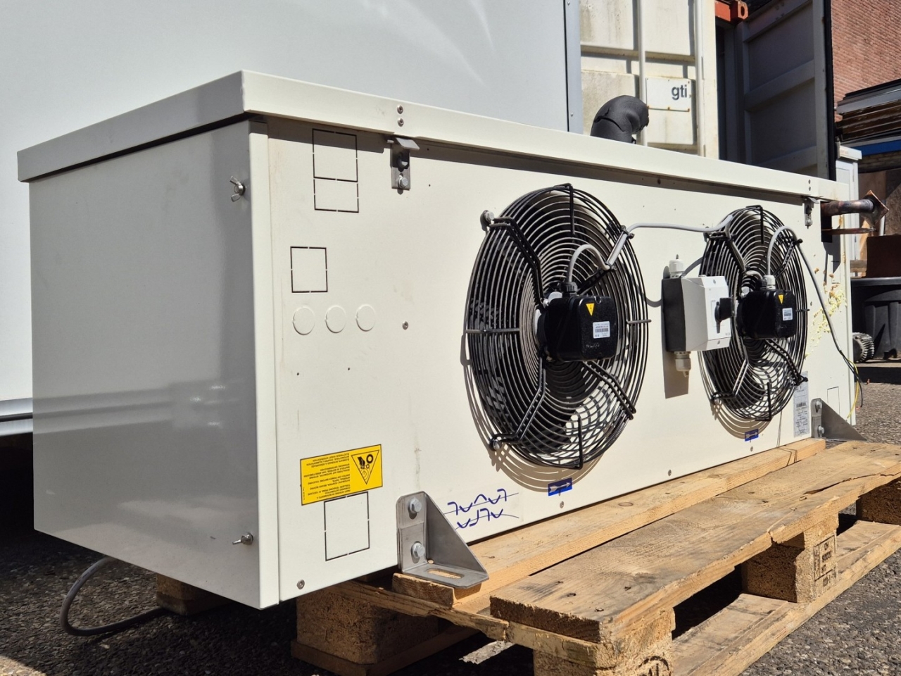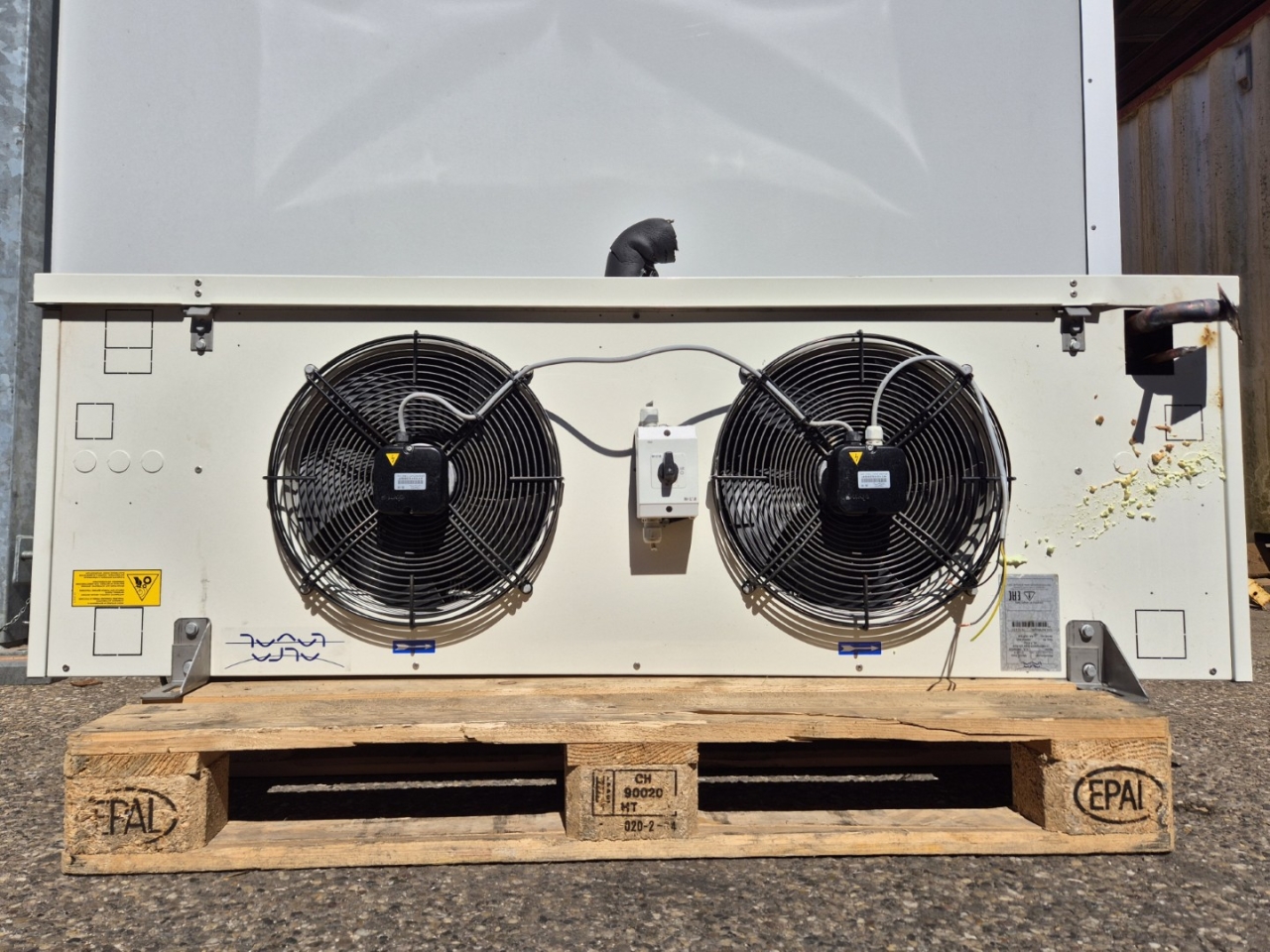 Used Alfa Laval CCBEH352CS air-cooled Freon evaporator with electric defrost. Complete with 2 EBM-Papst A4E350-AO02-14 fans - 50/60 Hz - 0,18/0,25 kW - 1400/1600 RPM - diameter 350 mm and a total airflow of 4.498 m³/h.