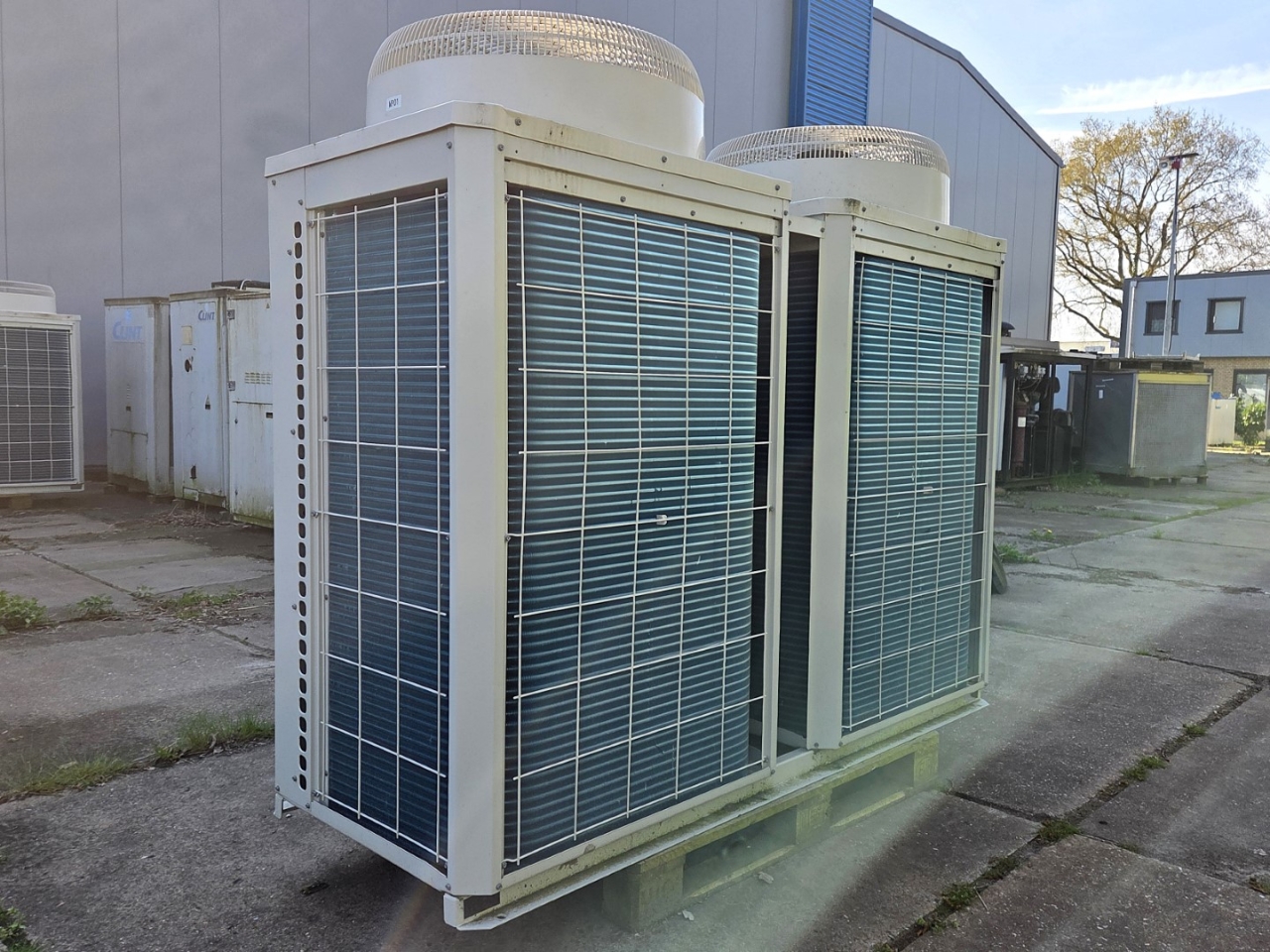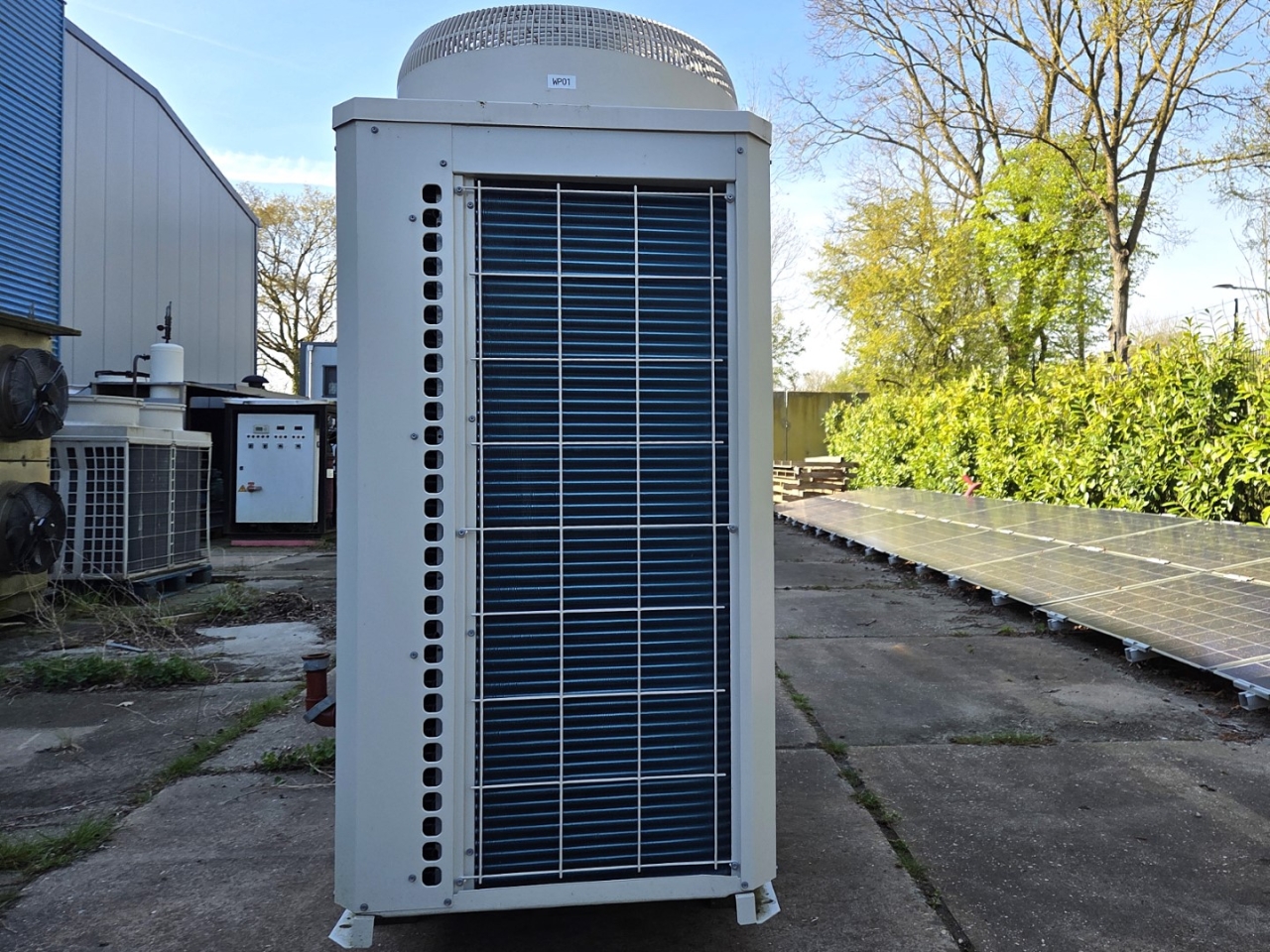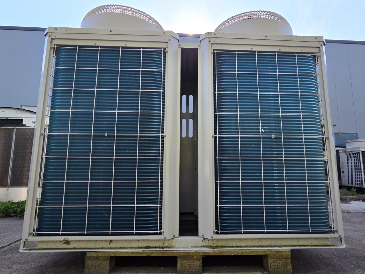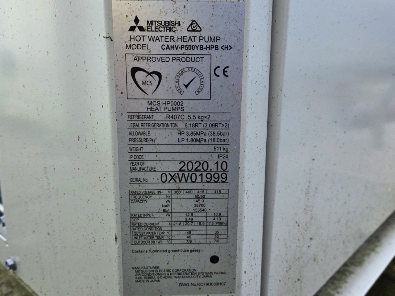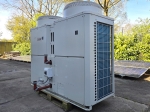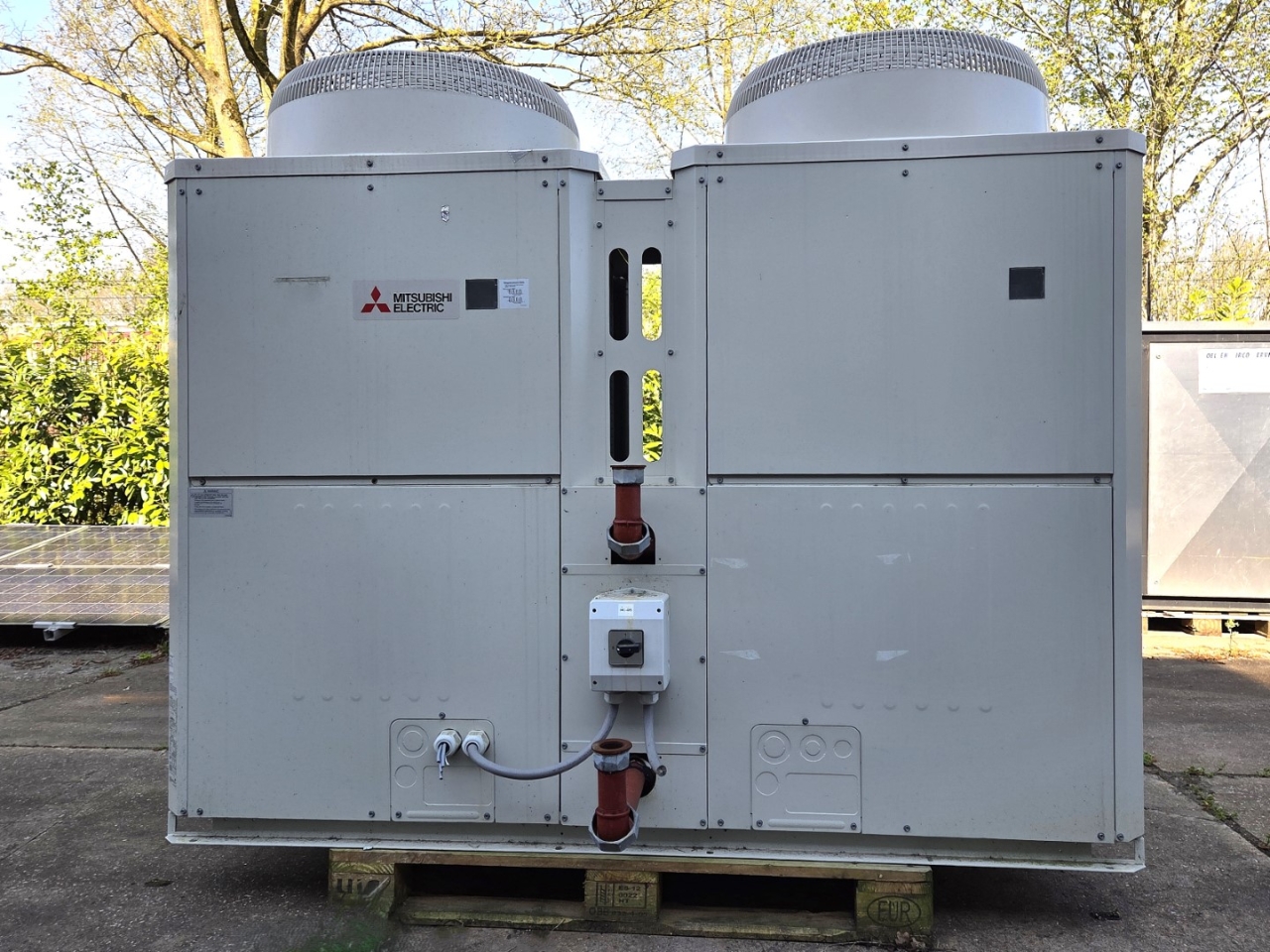 Used Mitsubishi CAHV-P500YB-HPB heat pump on Freon 407C. Complete with 2 Mitsubishi HEK84FC1-Y scroll compressors, condensers with 2 fans - 50 Hz - 0,92 kW - diameter 720 mm, 2 brazed heat exchengers as evaporator and a 2 control cabinets.