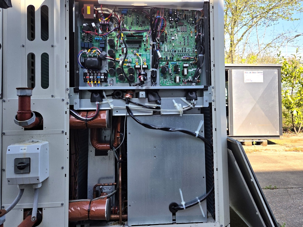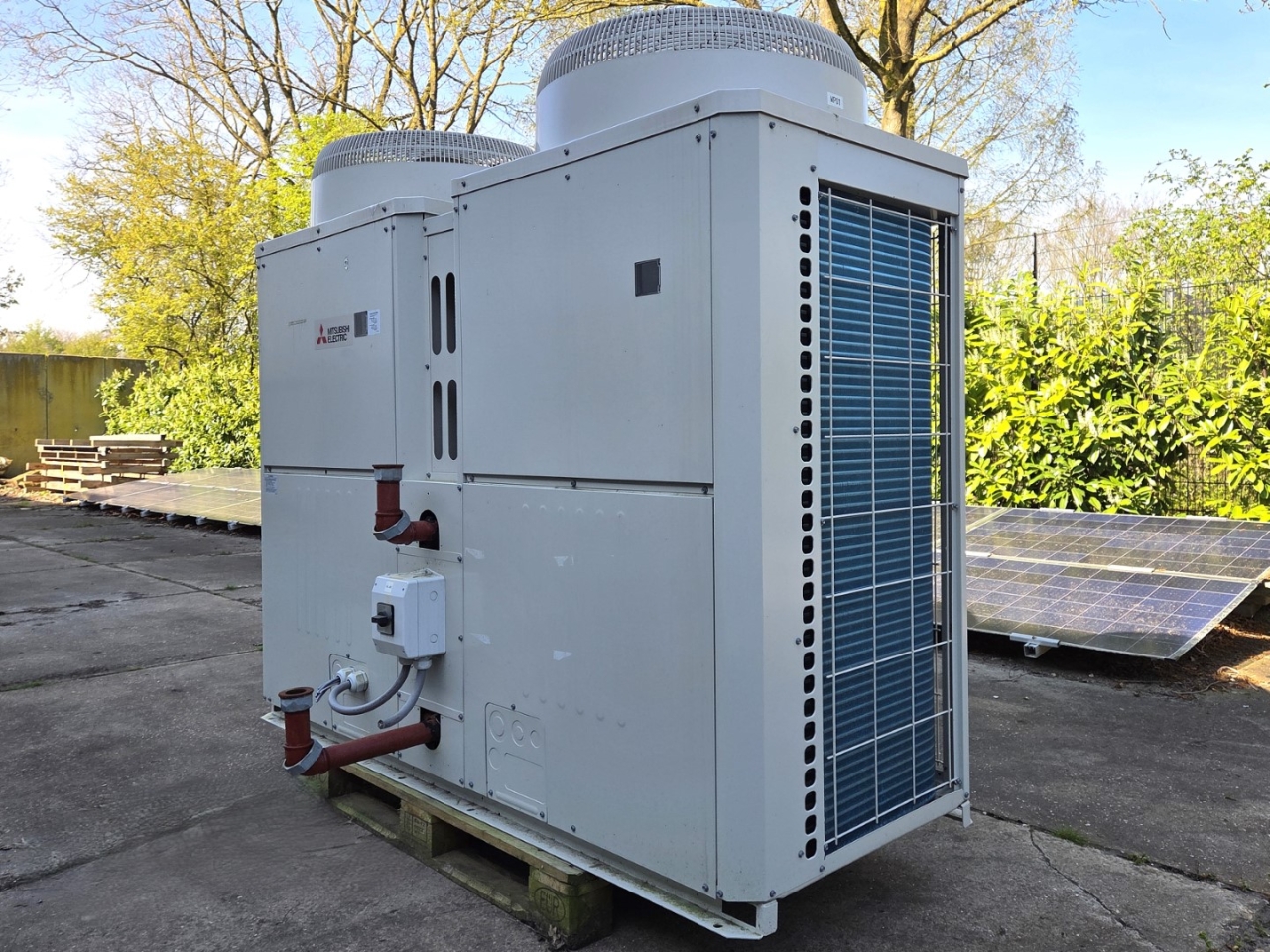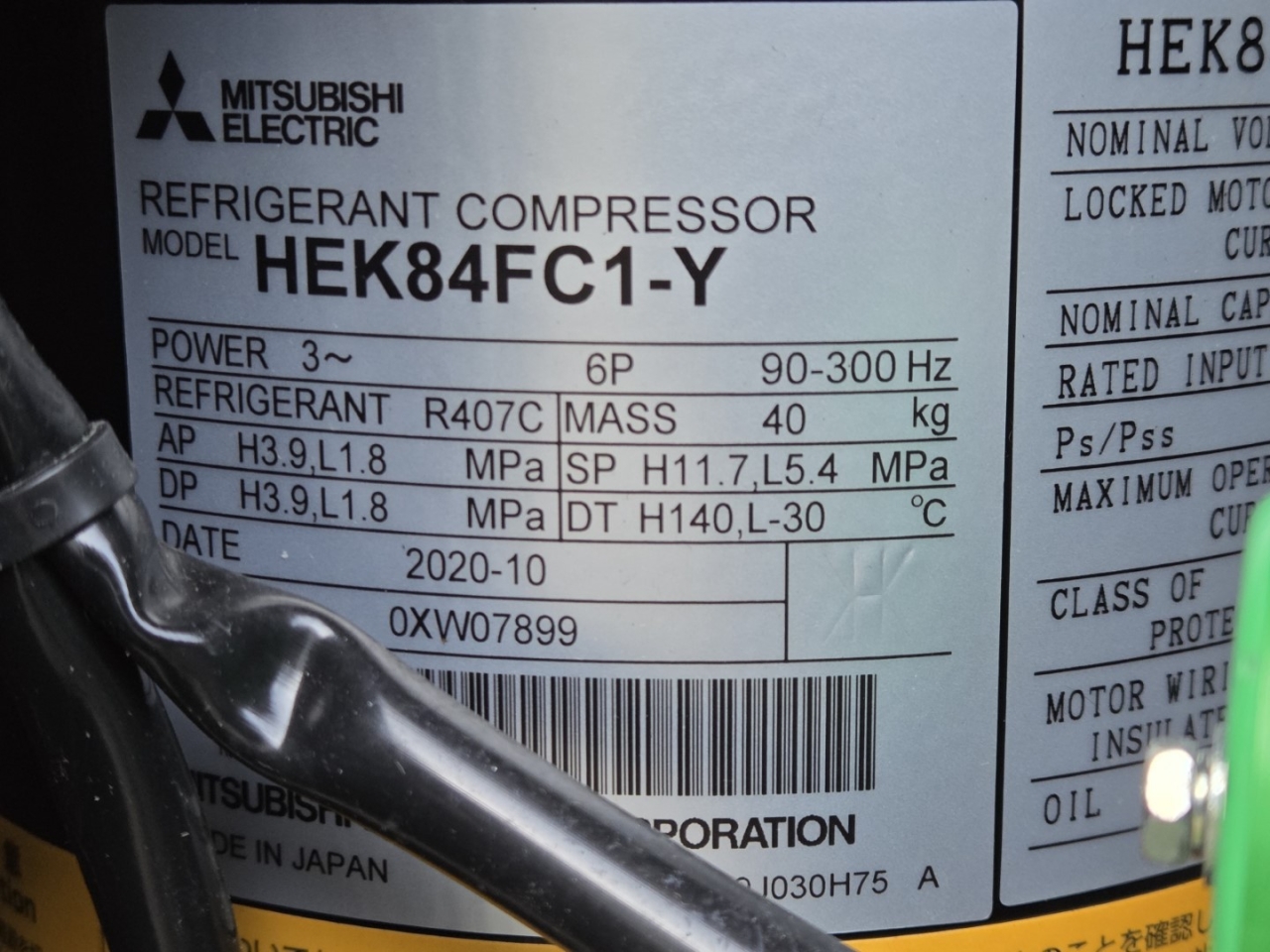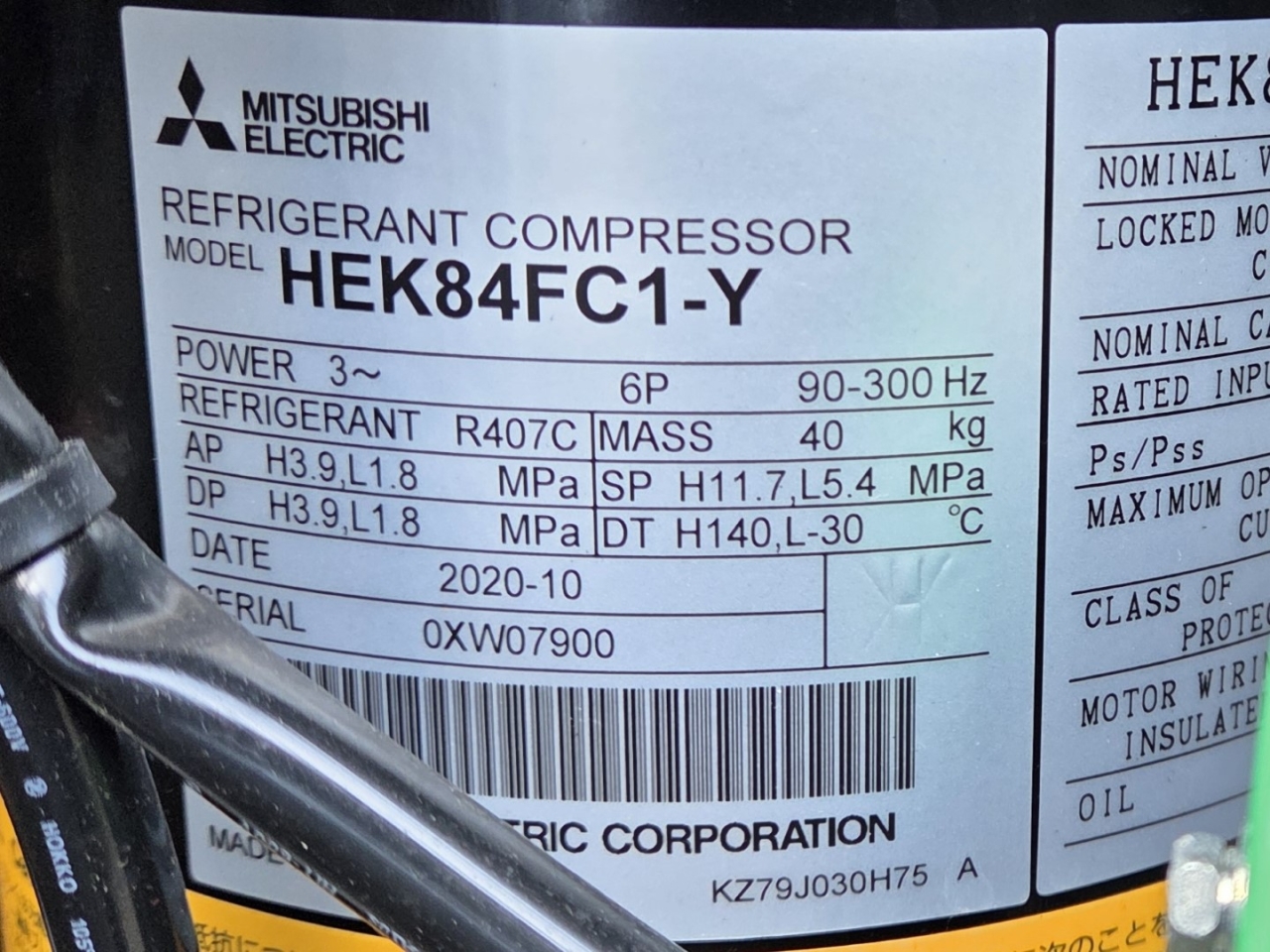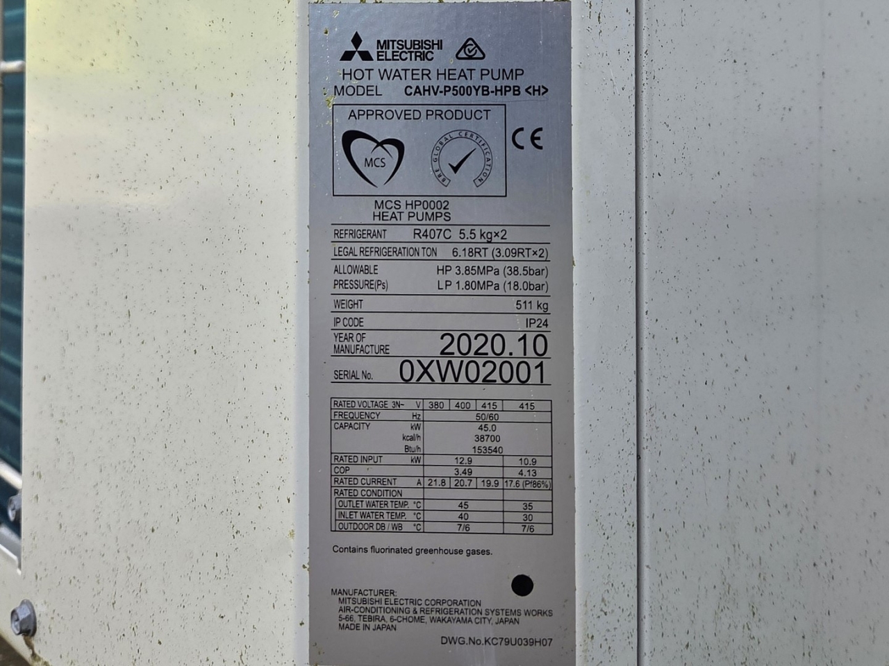 Used Mitsubishi CAHV-P500YB-HPB heat pump on Freon 407C. Complete with 2 Mitsubishi HEK84FC1-Y scroll compressors, condensers with 2 fans - 50 Hz - 0,92 kW - diameter 720 mm, 2 brazed heat exchengers as evaporator and a 2 control cabinets.
