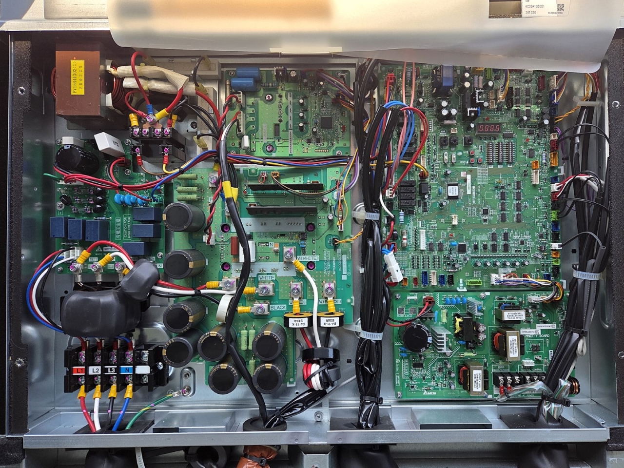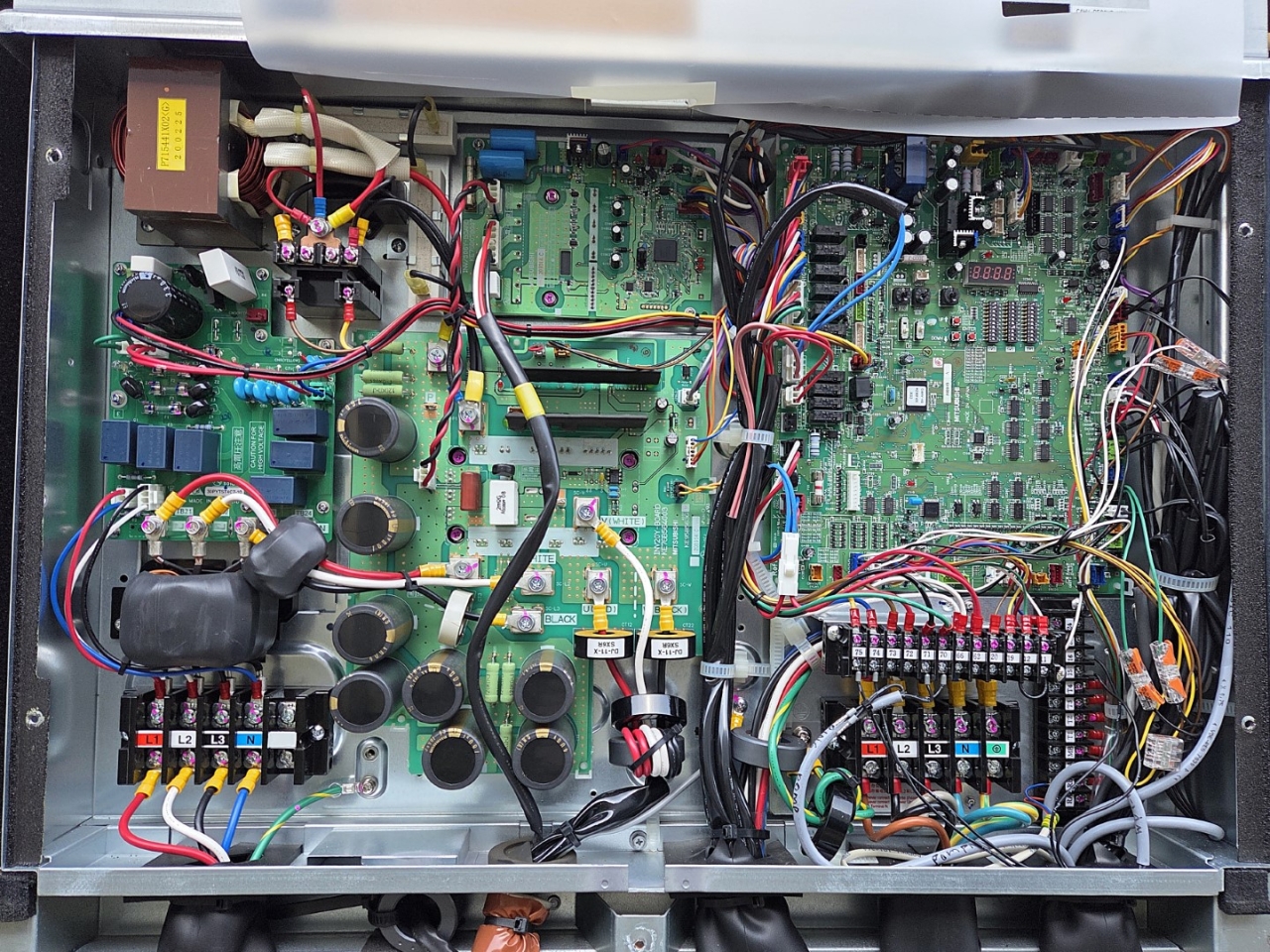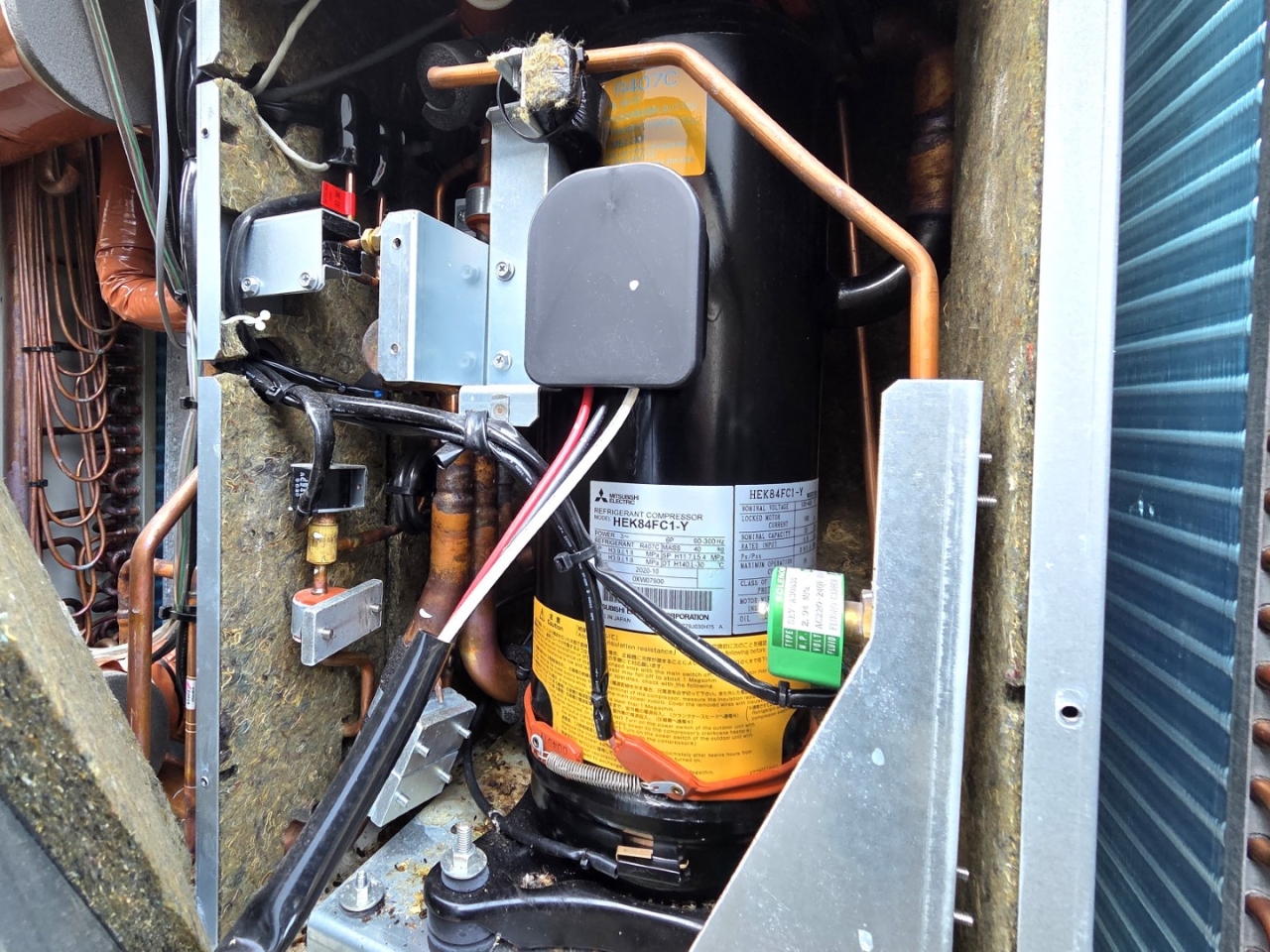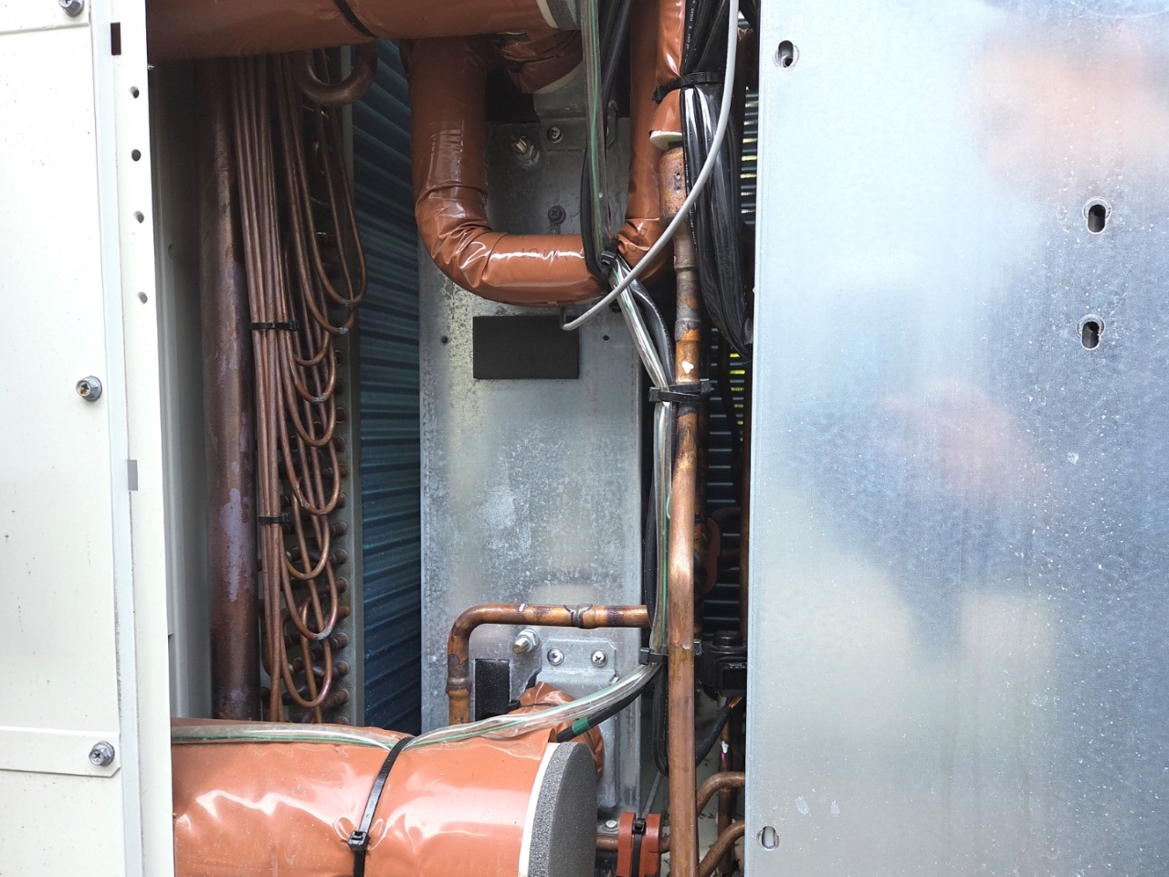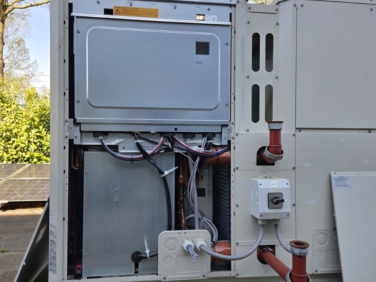Used Mitsubishi CAHV-P500YB-HPB heat pump on Freon 407C. Complete with 2 Mitsubishi HEK84FC1-Y scroll compressors, condensers with 2 fans - 50 Hz - 0,92 kW - diameter 720 mm, 2 brazed heat exchengers as evaporator and a 2 control cabinets.