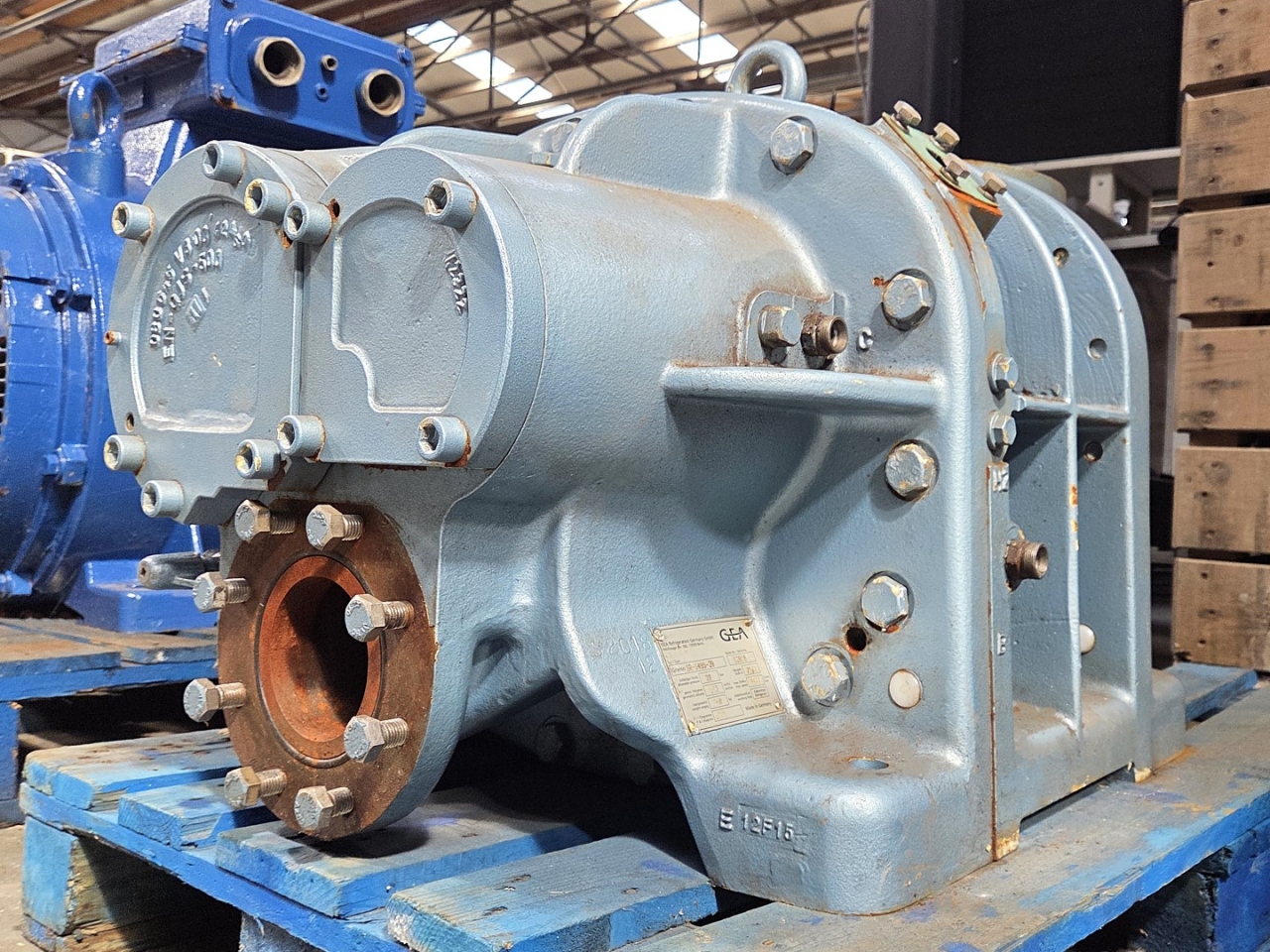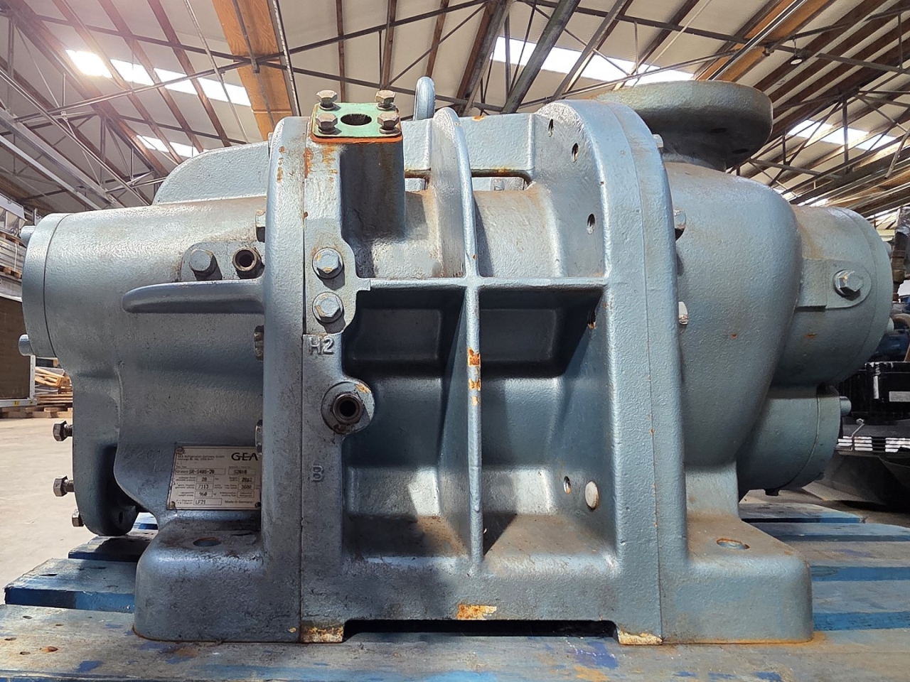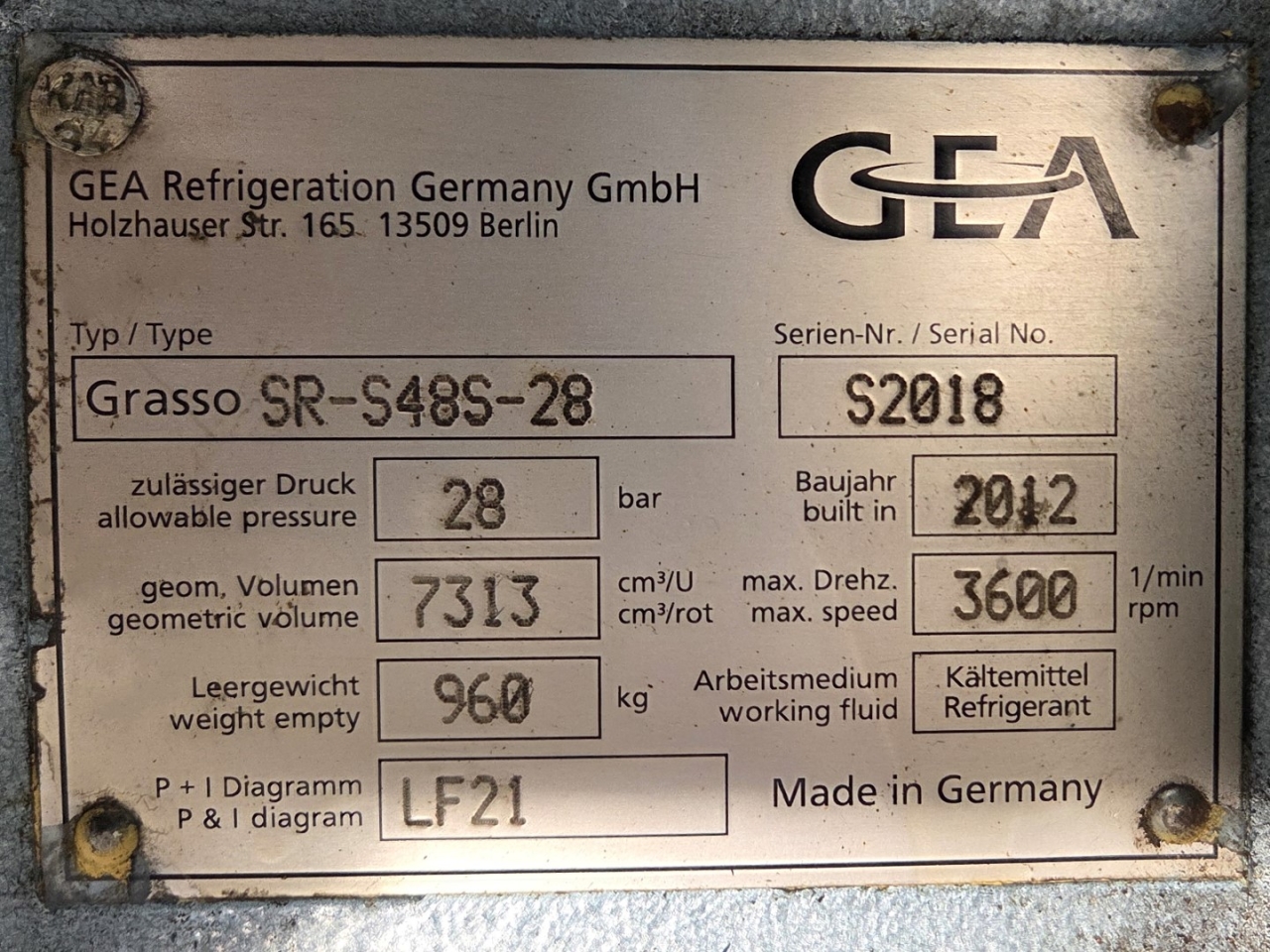 Used Grasso SR-S48S-28 screw compressor on NH3 (Ammonia). The compressor has a displacement of 1.579 m³/h.