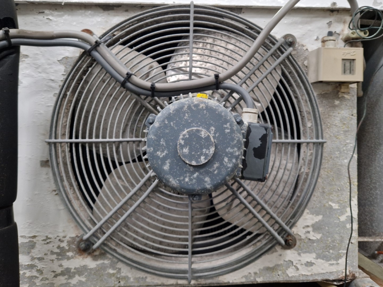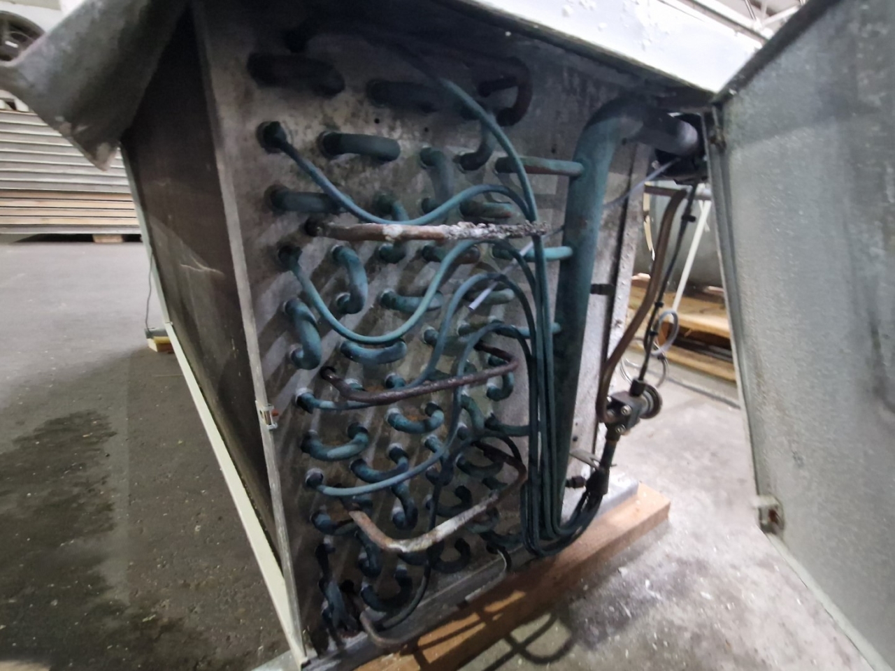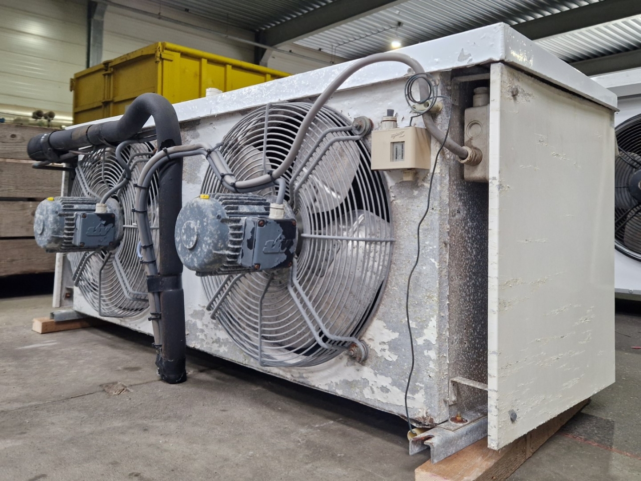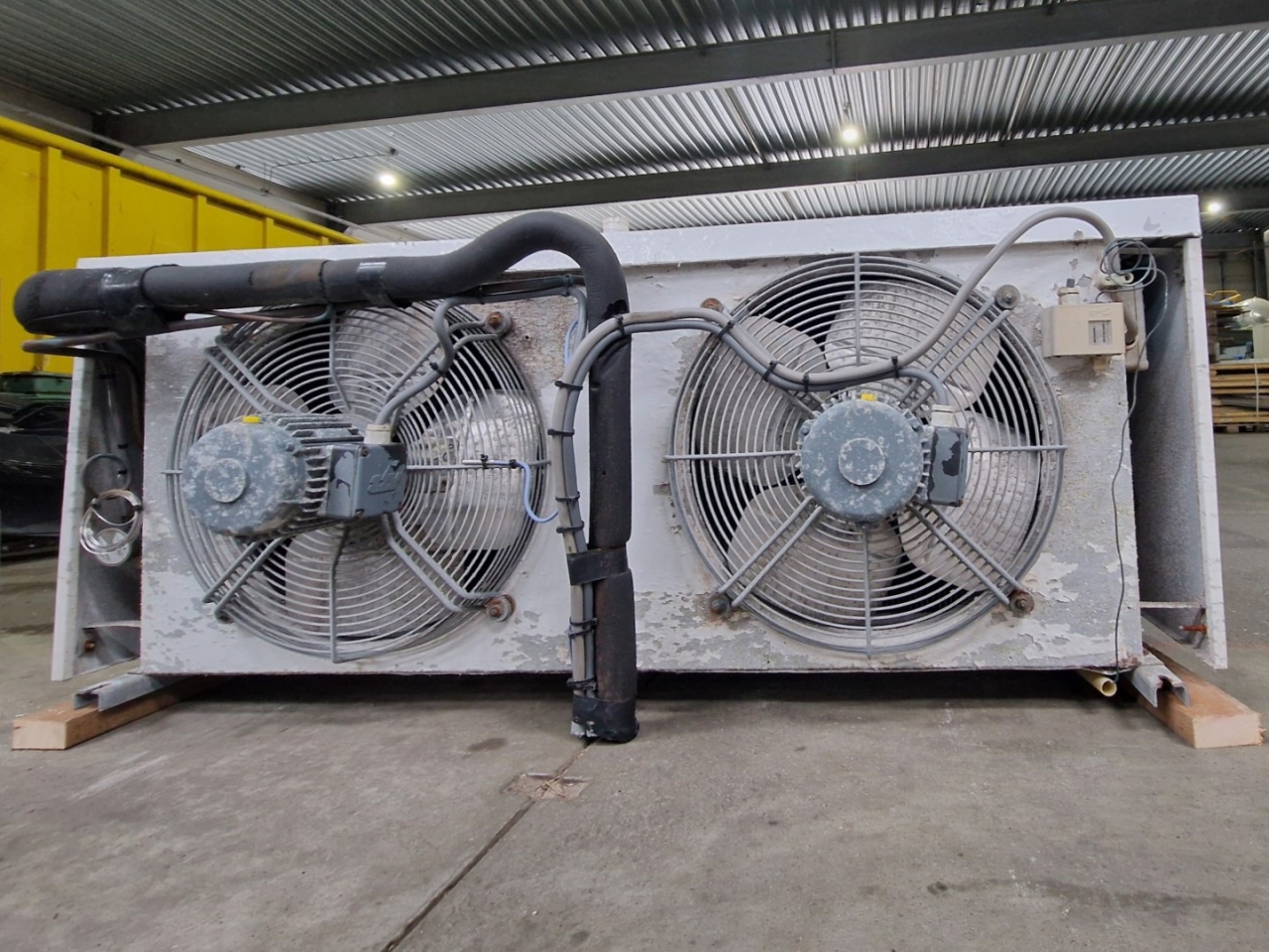 Gebruikte Helpman LA-74 freonverdamper. Compleet met 2 ATB-ventilatoren - 50/60 Hz - 0,25 kW - 1410/1710 tpm - diameter 450 mm en een totale luchtstroom van 7.400 m³/u.