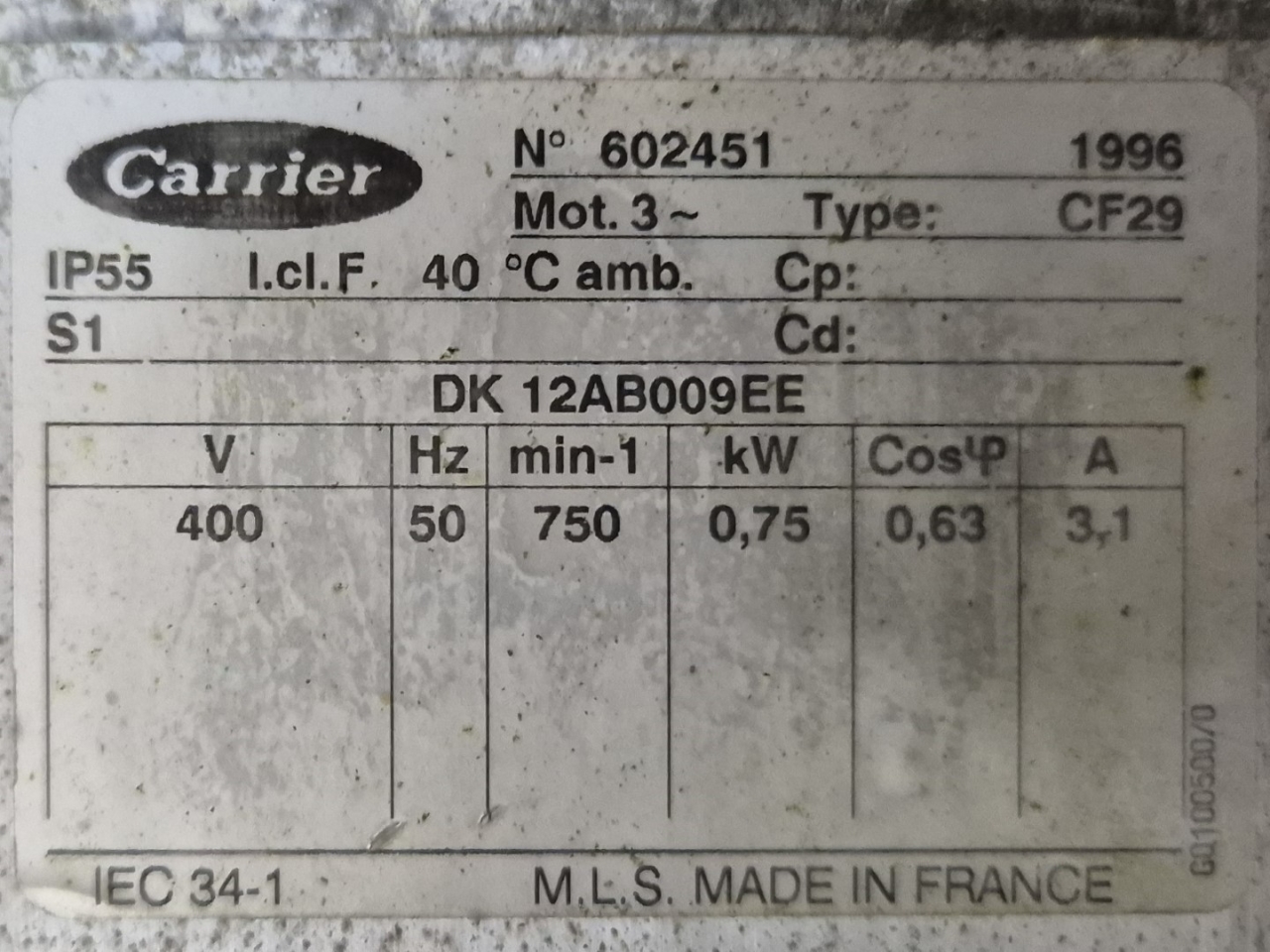 Gebruikte Carrier CF29 ventilator met de volgende specificaties: 50 Hz - 0,75 kW - 750 RPM.