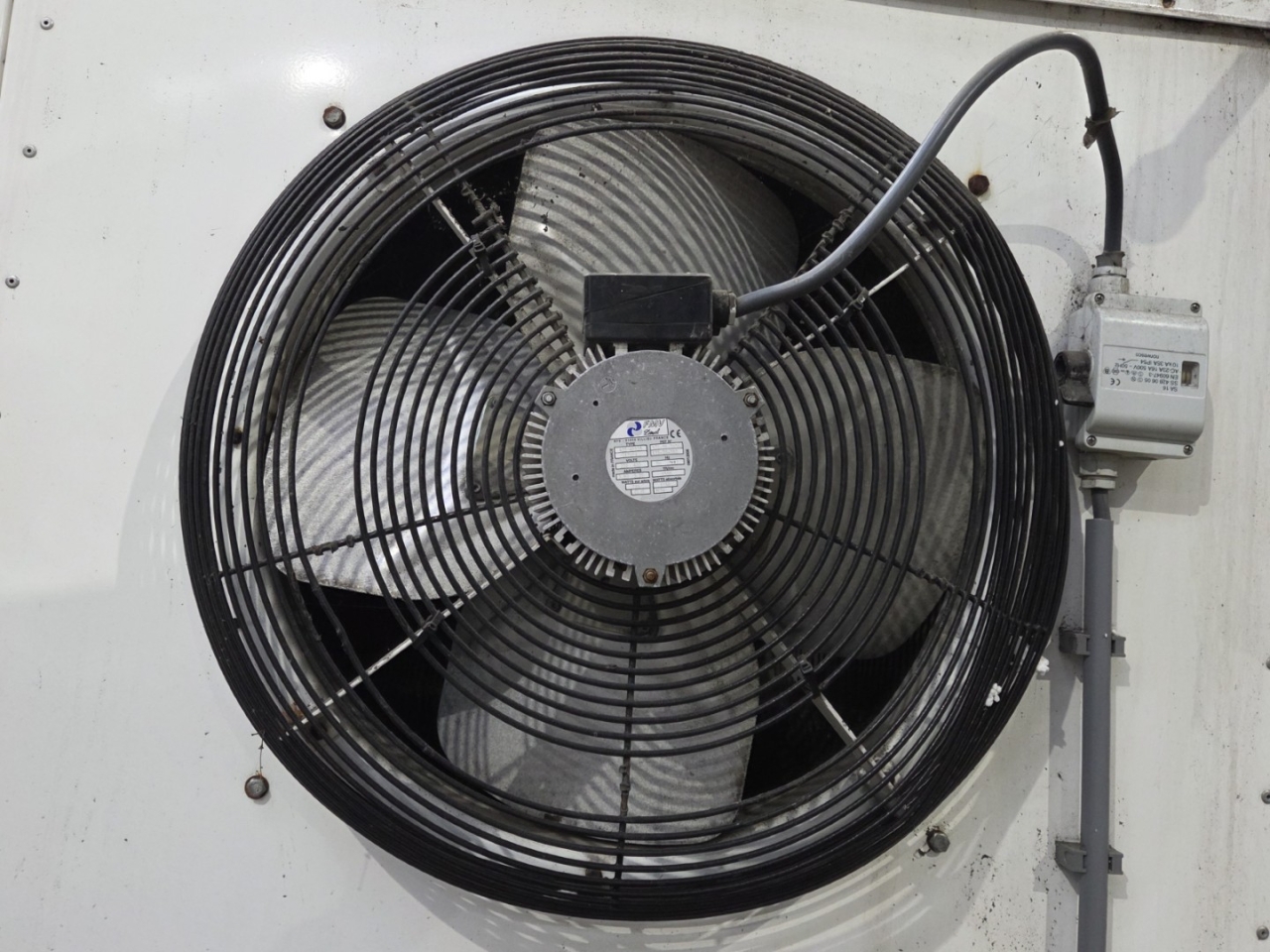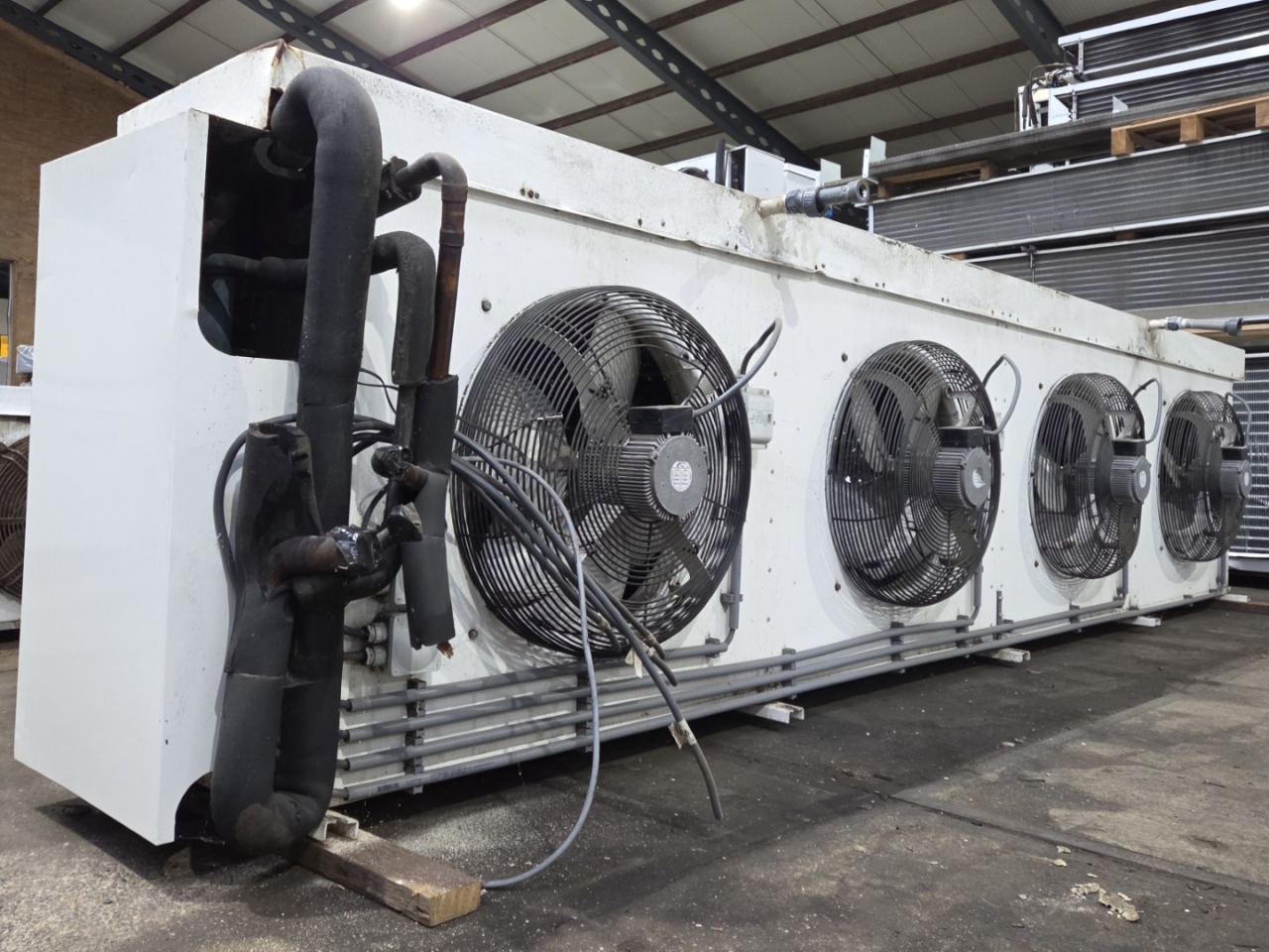 Gebruikte Glacial Freon-verdamper met hete gasontdooiing. Compleet met 4 FMV Lamel A55-4PR25 ventilatoren - 50 Hz - 0,70 kW - 1500 RPM en een totale luchtstroom van 33.700 m³/h.