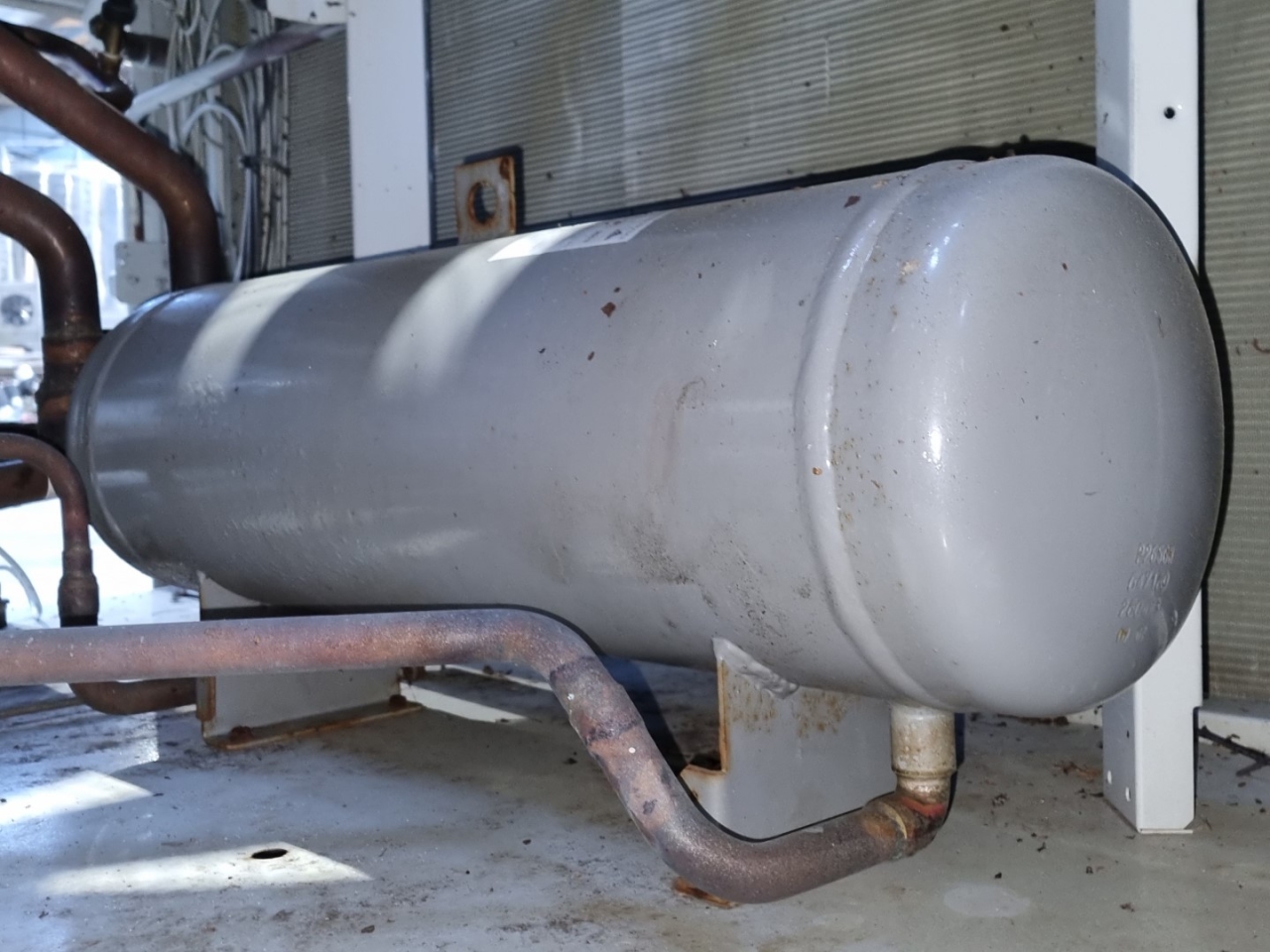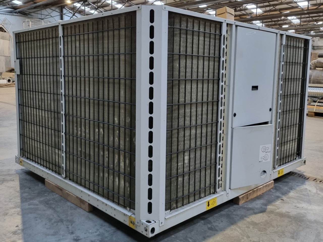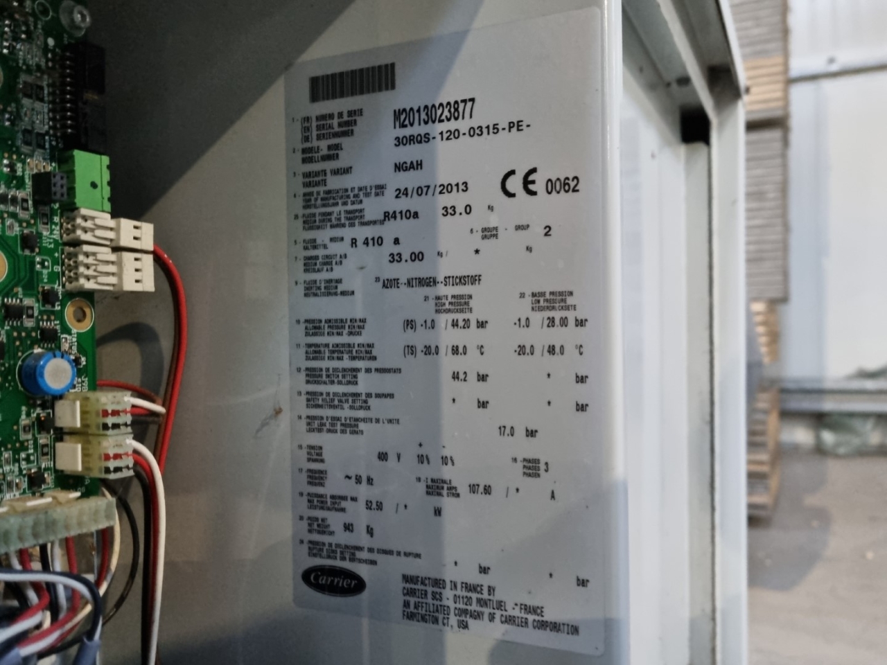 Gebruikte Carrier 30 RQS 120 luchtgekoelde chiller Freon op R410A. Compleet met 3 Copeland ZP182KQE-TFD-604 scrollcompressoren, geschoorde warmtewisselaar, Carrier PM 100-110mm ventilator - 50 Hz - 0,53/0,18 kW - 720/500 RPM, Mecasem OOPSG001171100C ontvanger met een volume van 23,5 liter en een schakelkast met een Carrier Pro-Dialog+ display.
