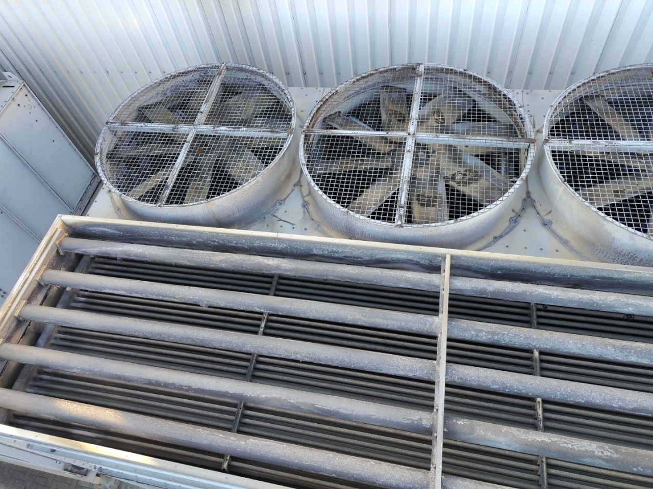 Gebruikte Baltimore CXV 481 R verdampingscondensor op NH3 (R717). Compleet met 4 ventilatoren die een totale luchtstroom van 235.080 m³/h produceren.
