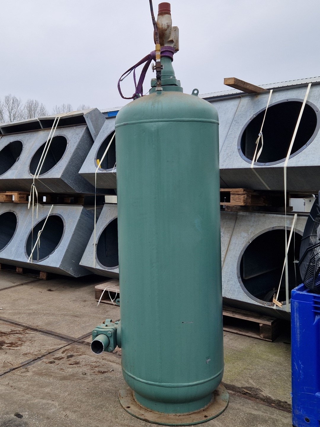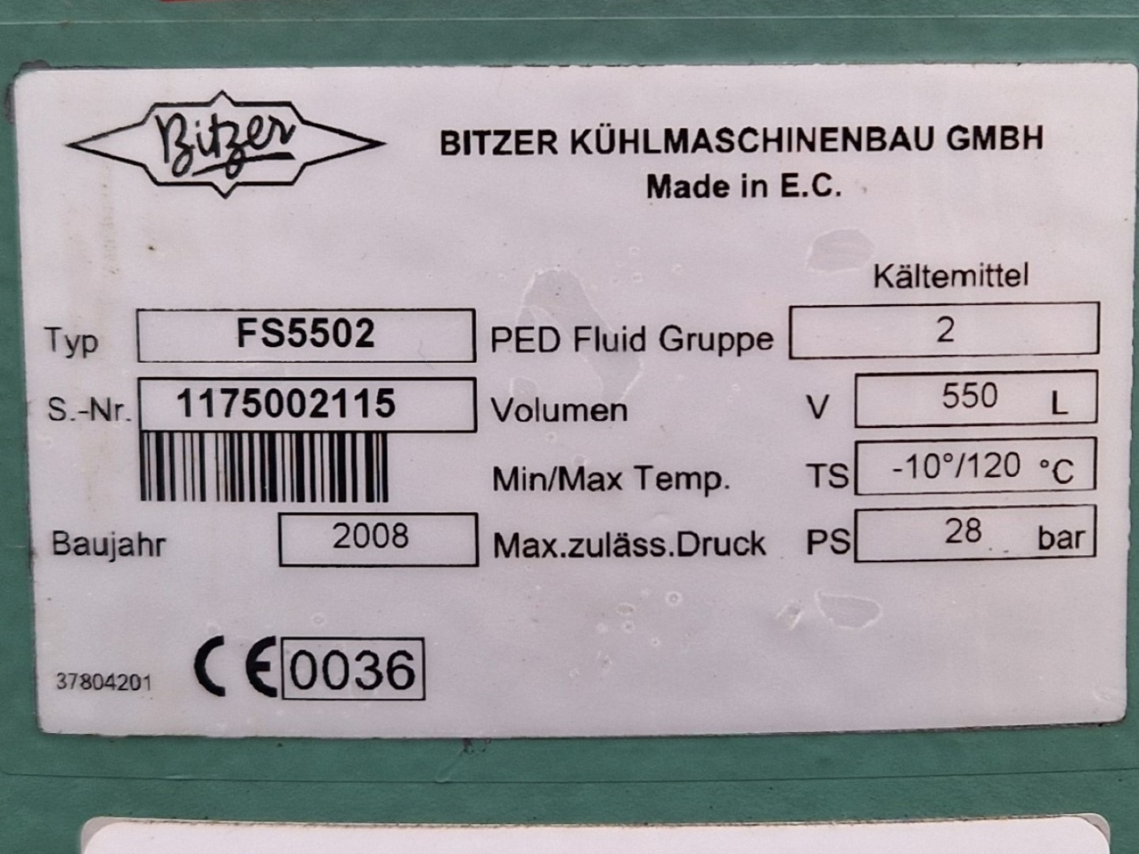 Used Bitzer FS5502 liquid receiver for Freon with a volume of 550 liters. Dimensions: 600x700x2500 mm (LxWxH).
