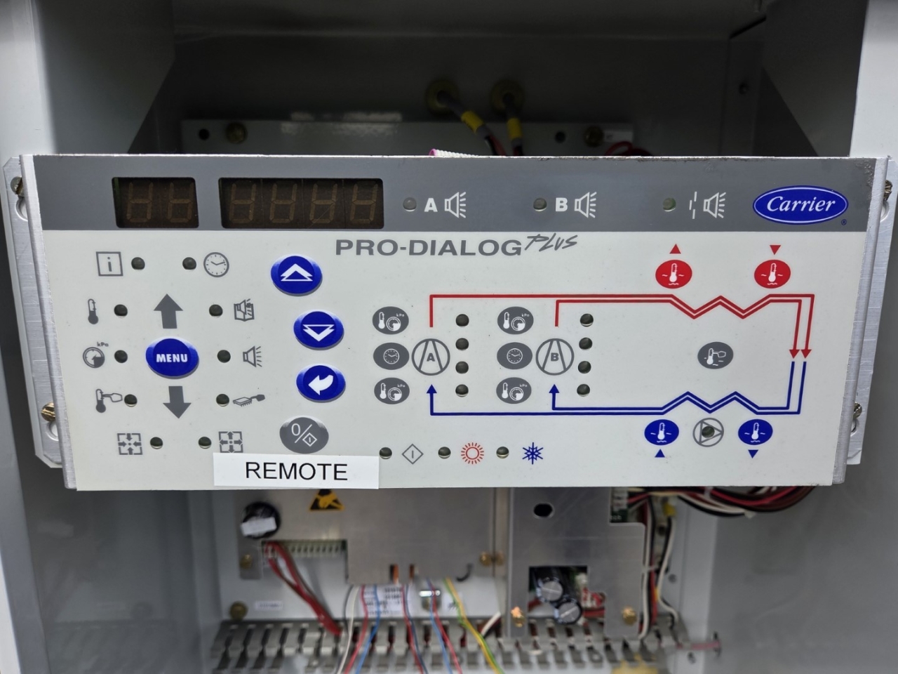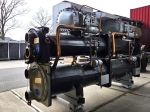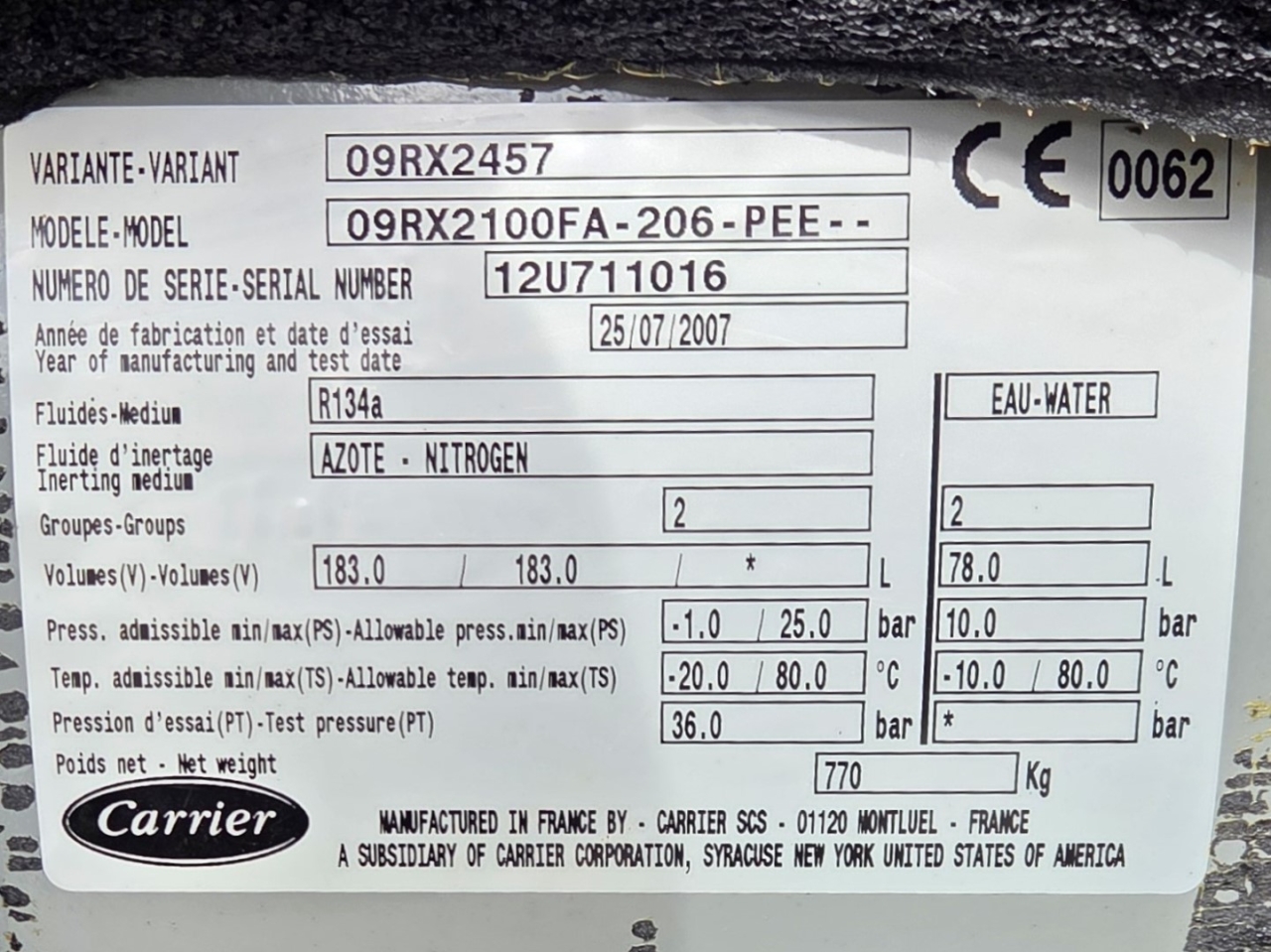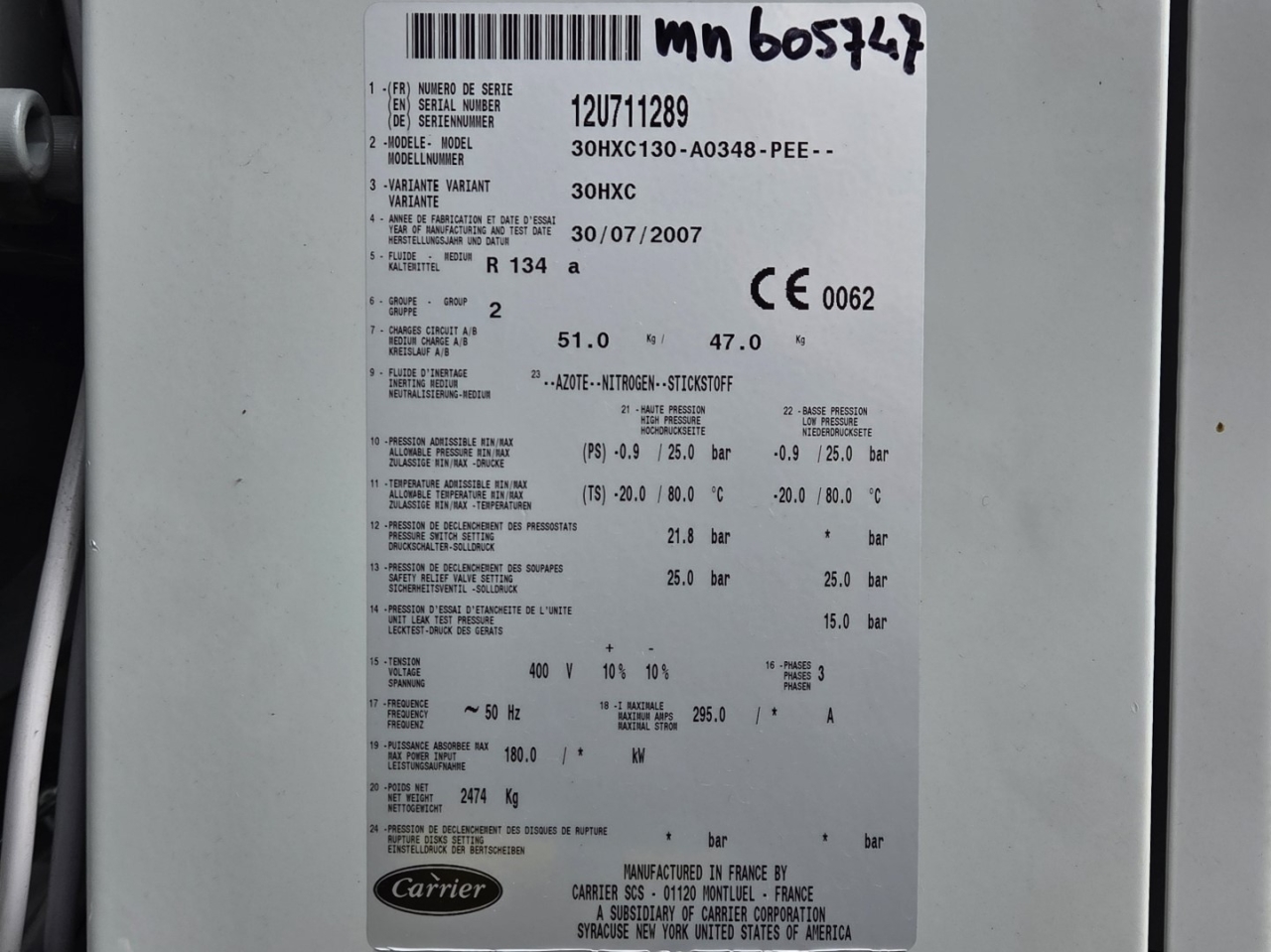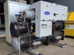 Used Carrier 30HXC130-A0348-PEE-- water-cooled chiller on Freon R134a. Complete with 1 Carlyle 06NA2209S7NC-A00 & 1 Carlyle 06NA2250S7NC-A00 screw compressors, Carrier 10HX2093FA-206-PEE-- shell & tube evaporator/exchanger, Carrier 09RX2100FA-206-PEE-- shell and tube condenser, liquid line filter driers and control cabinet with a Carrier Pro-Dialog Plus.