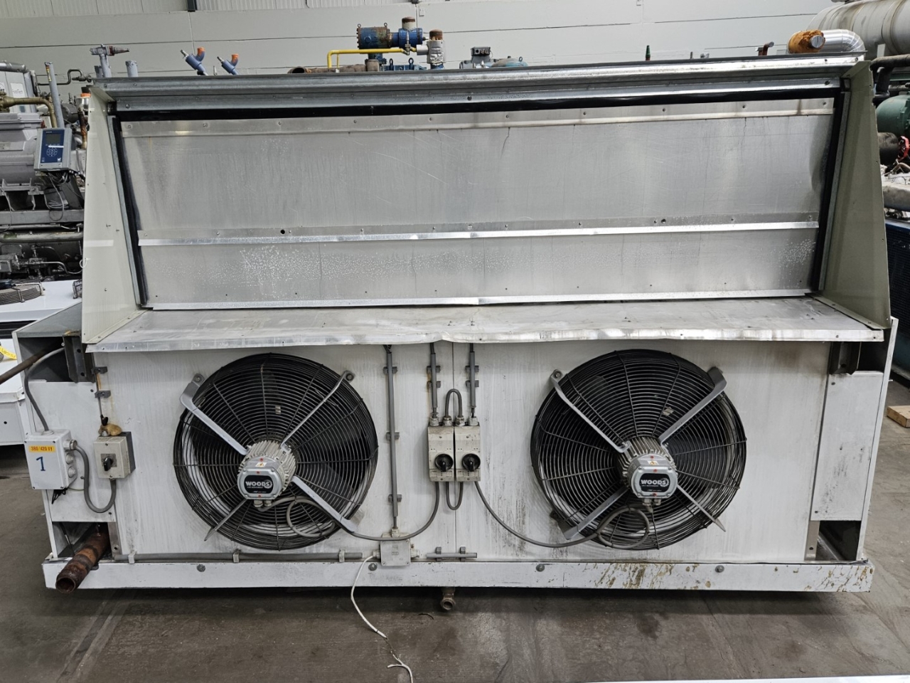 Used Goedhart VCB blow-through 82567 evaporator with electric defrost. Complete with 2 Woods fans - 50 Hz - 0,83/0,50 kW - 1340 RPM - diameter 560 mm and a total airflow of 19.714 m³/h.