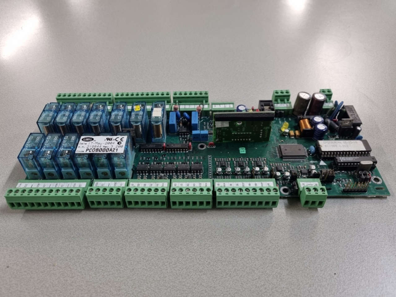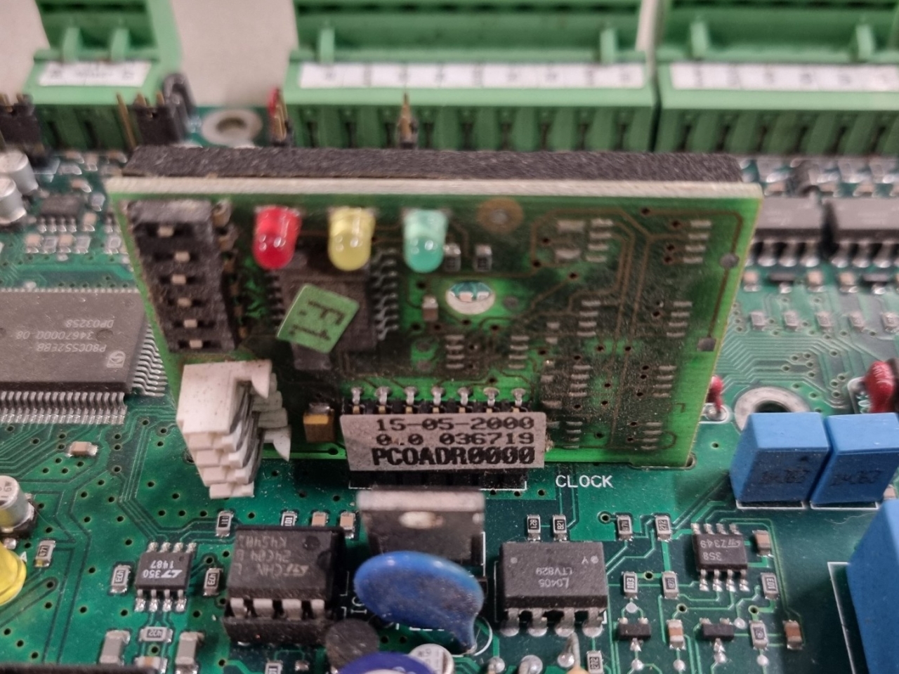Used Carel PCOB000A21 printed circuit board. Includes PCOADR0000 module.