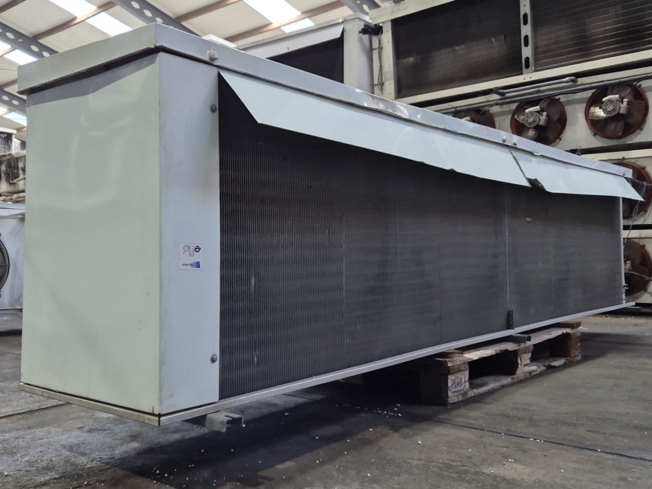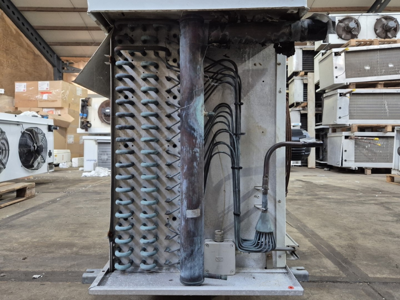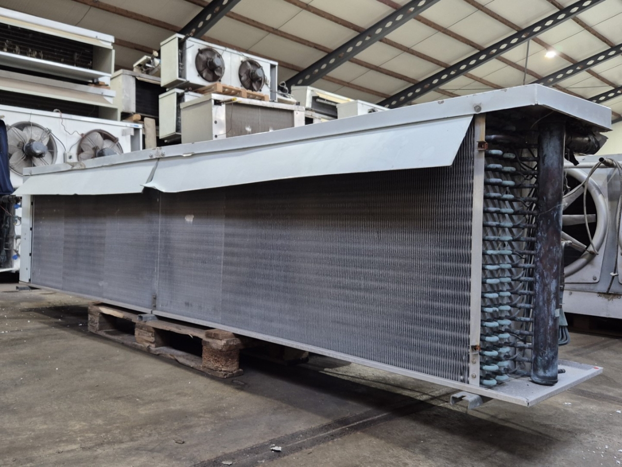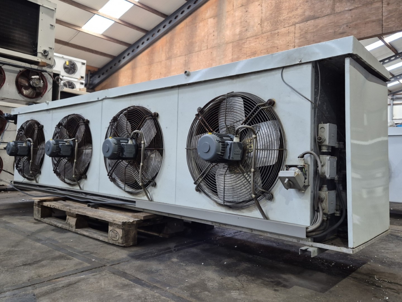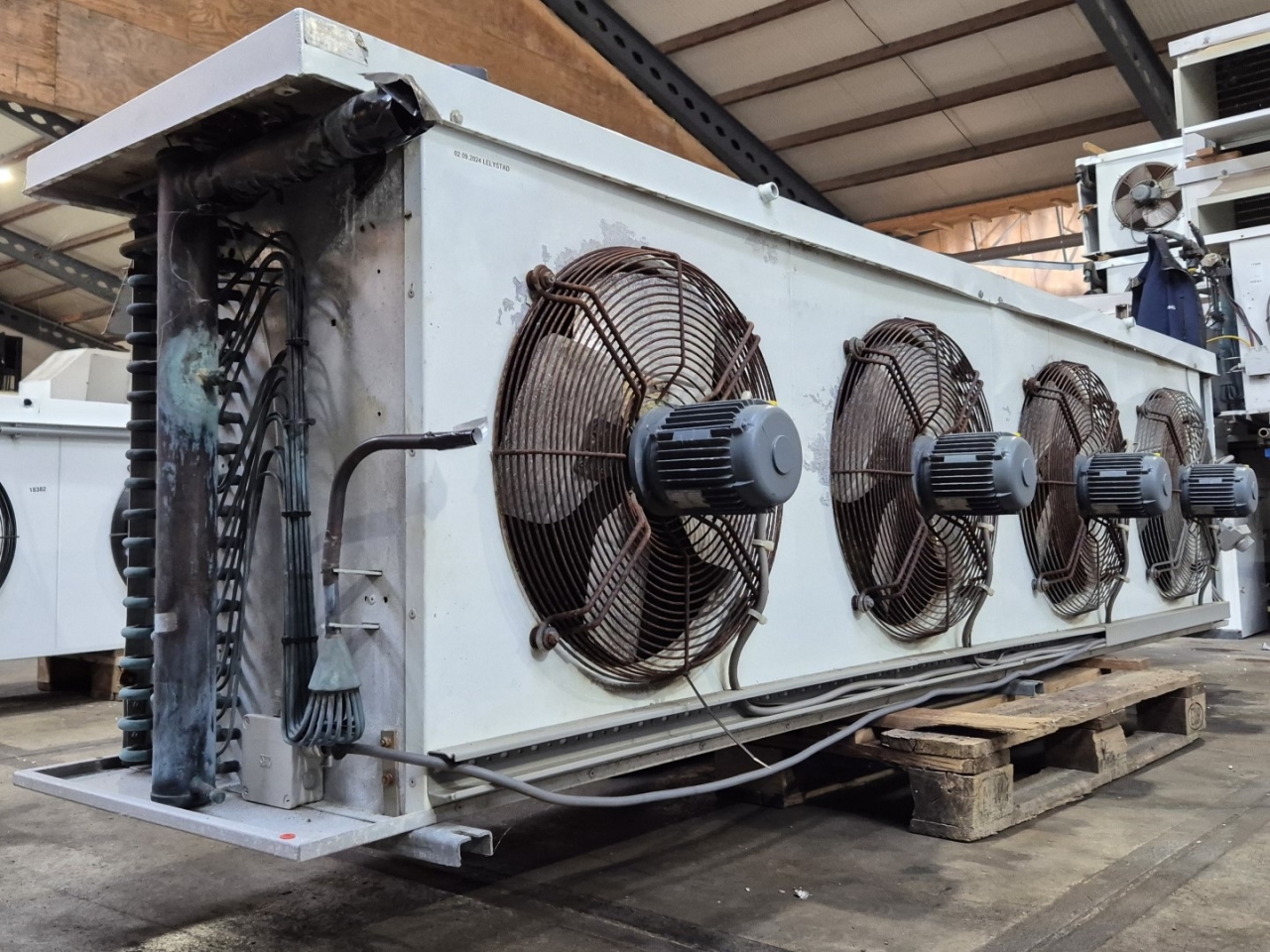 Used Helpman LEX 30-7 Freon evaporator. Complete with 4 ATB RFT0,45/4-7 fans - 50/60 Hz - 0,25 kW - 1410/1710 RPM - diameter 508 mm and a total airflow of 26.000 m³/h.