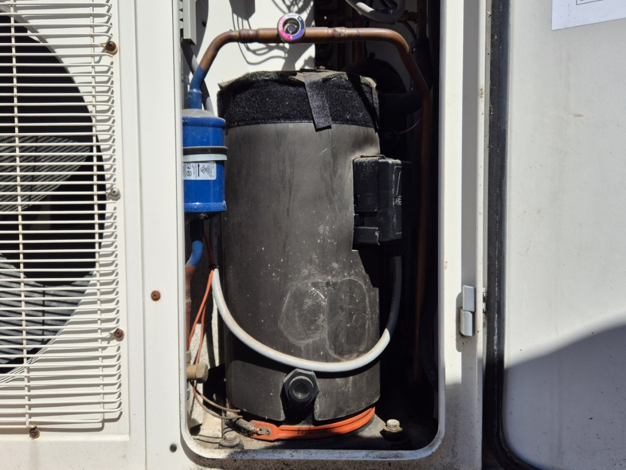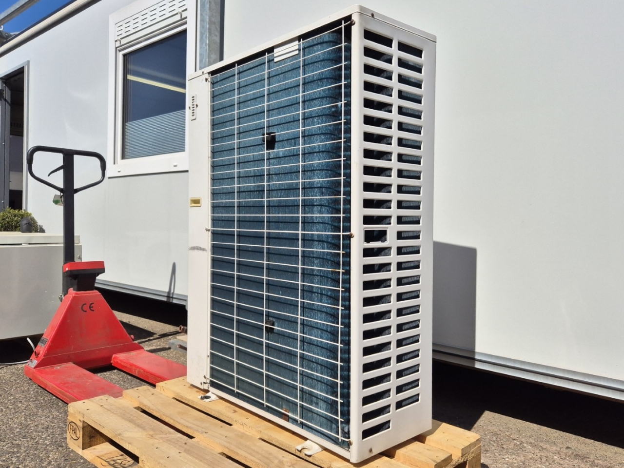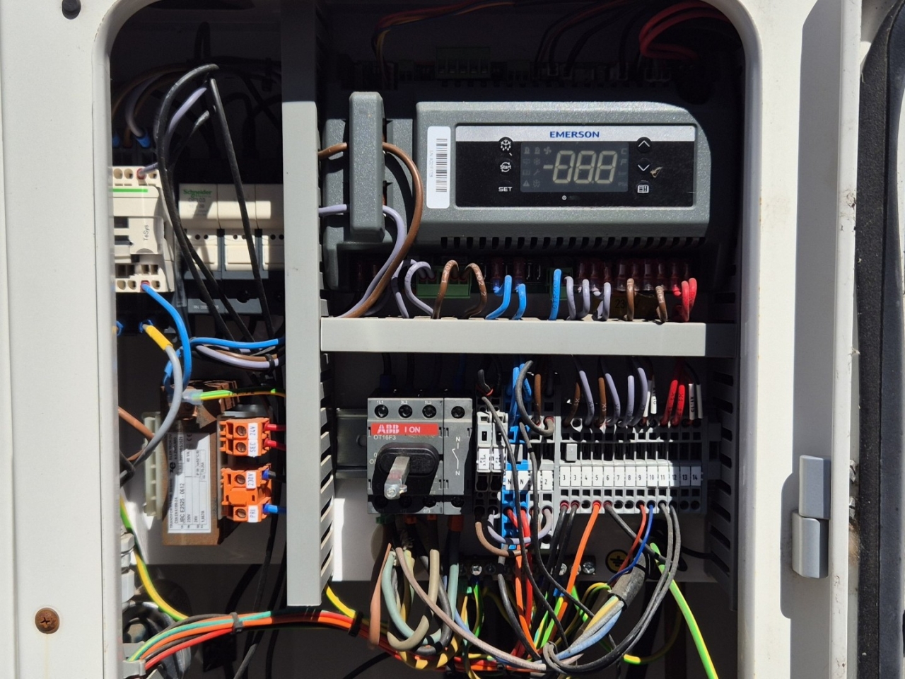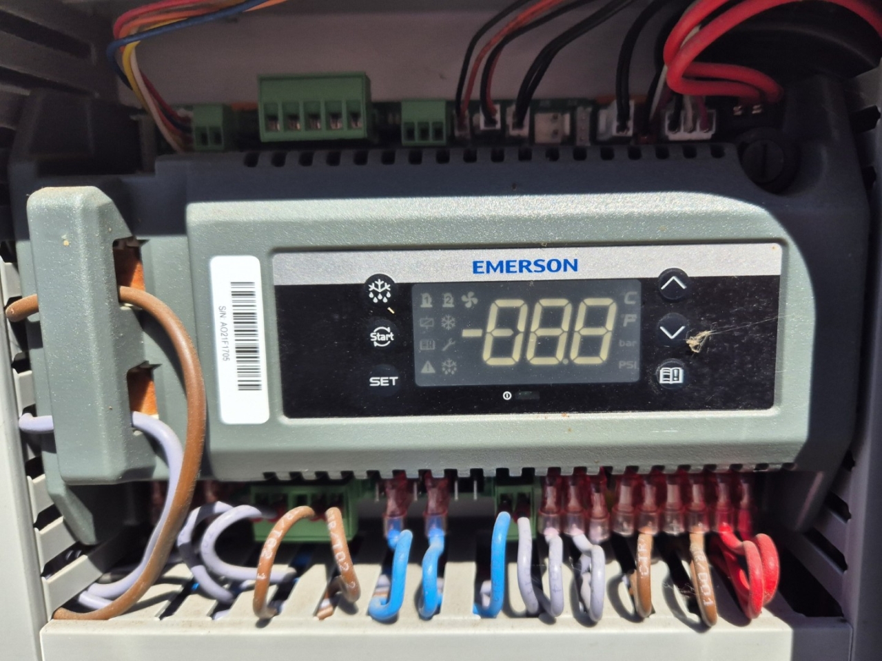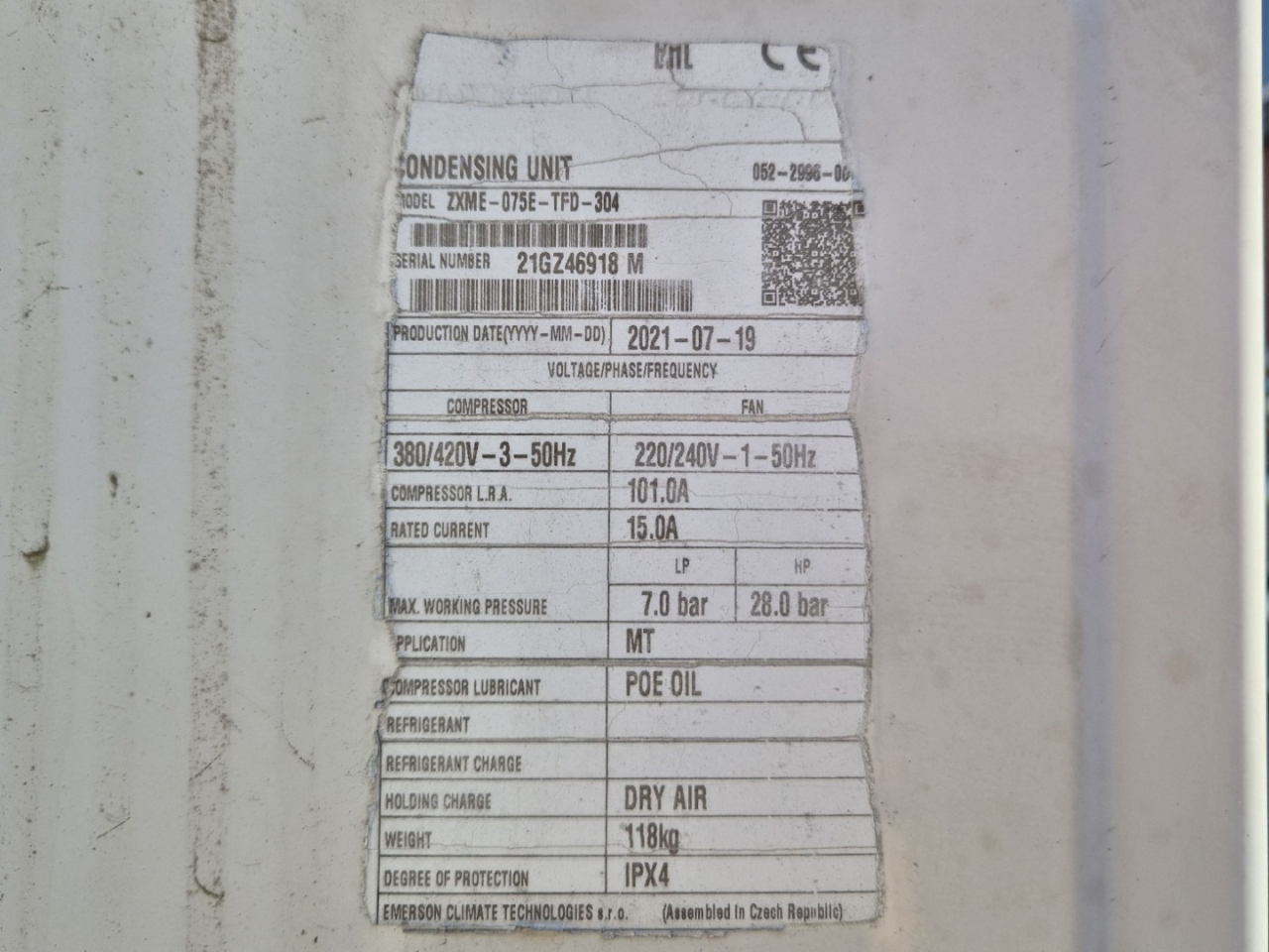 Used Copeland ZXME-075E-TFD-304 Condensing unit on Freon built in 2021. Complete with a ZX51KCE-TFD scroll compressor, condenser with 2 fans that produce an airflow of 5.904 m³/h, liquid receiver, liquid line filter drier, sight glass and a control panel with an Emerson controller. The compressor has a displacement of 11,9 m³/h and a capacity of 13,9 kW at -5ºC/+32ºC.