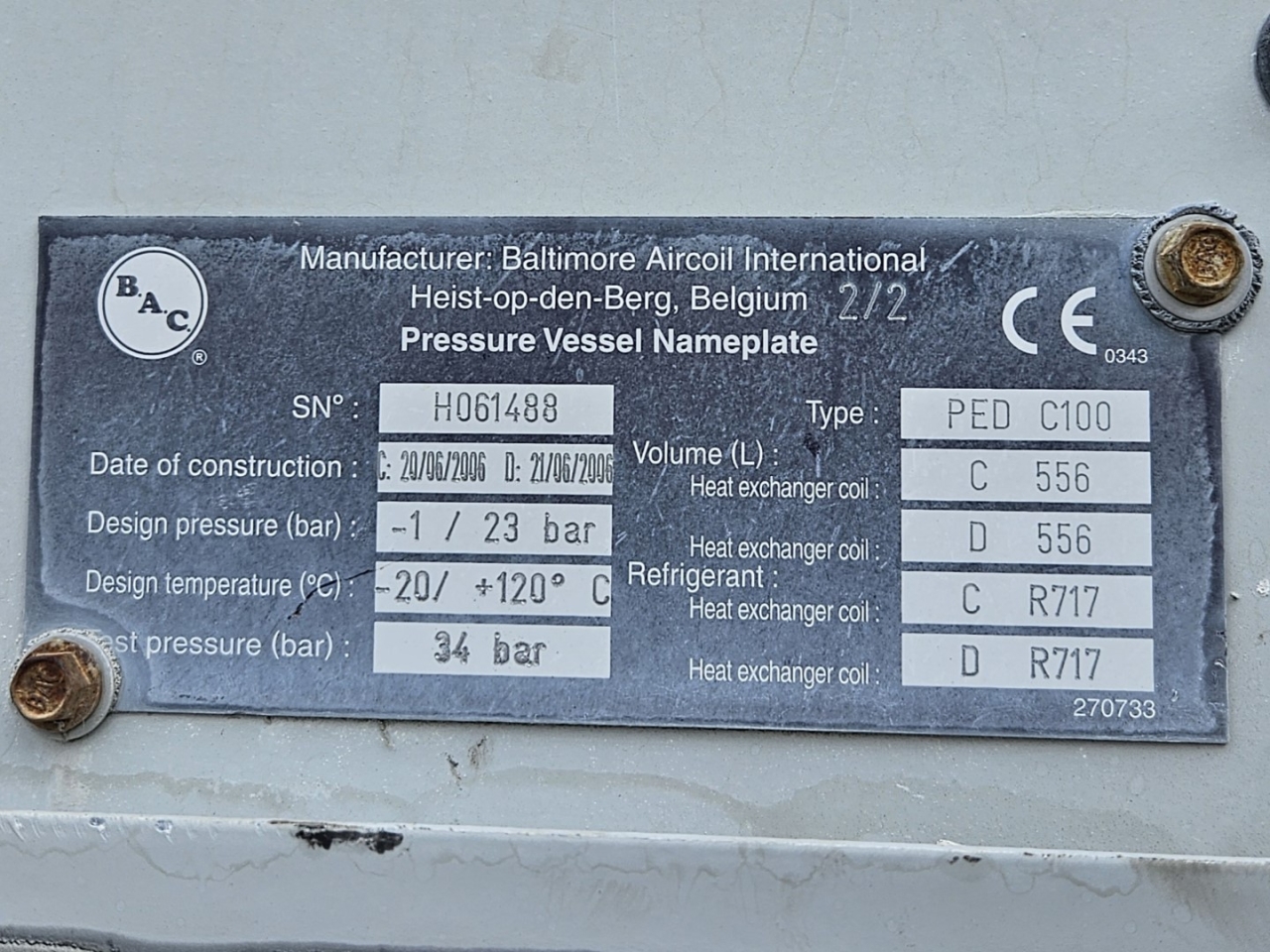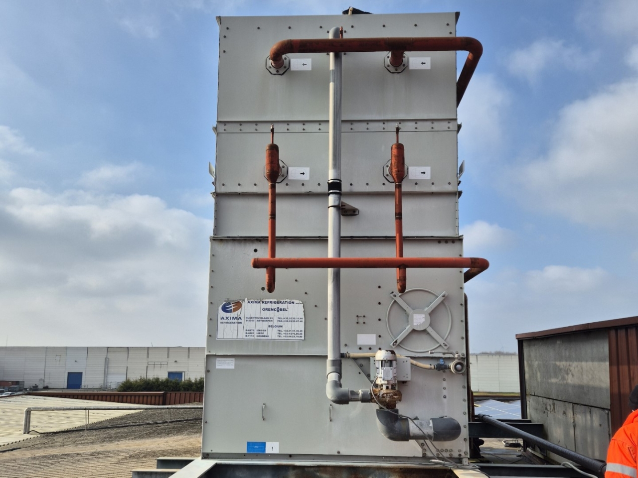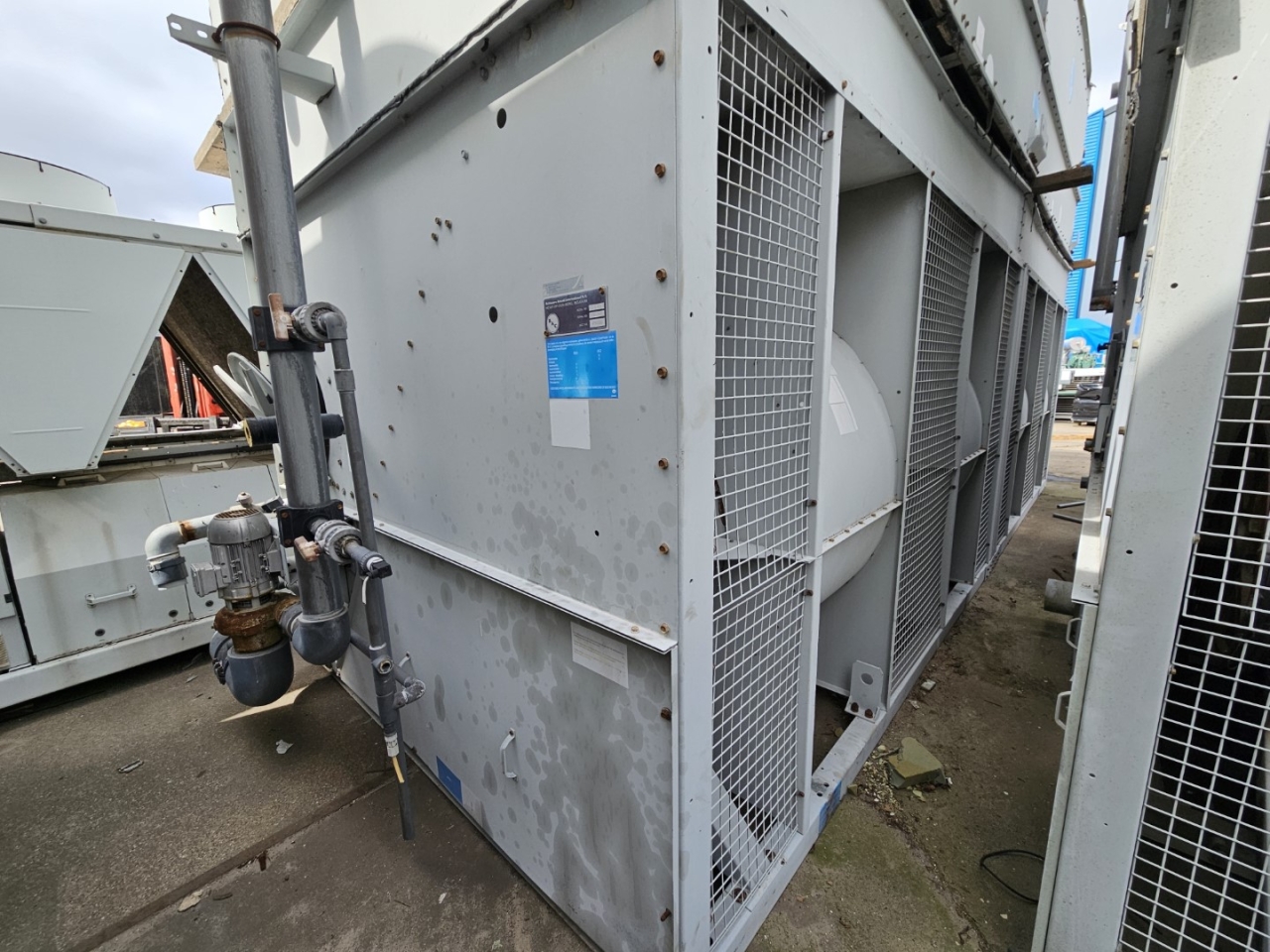 Used Baltimore VXC-S 288 R evaporating condenser on NH3 (Ammonia). Complete with 2 centrifugal fans that produce an airflow of 82.080 m³/h and a Baltimore water pump. This unit was originally a Baltimore VXC-S 576 R.