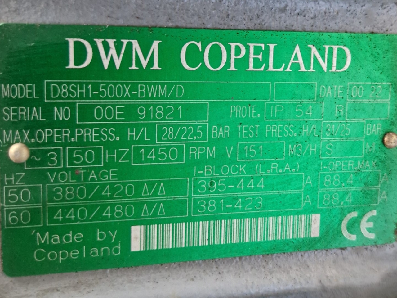 Used Bluebox/Western KAPPA/N2 1002 air-cooled chiller on Freon R407C. Complete with 2 DWM Copeland D8SH1-500X-BWM/D semi-hermetic piston compressors, condenser with 4 Ziehl-Abegg fans - diameter 800 mm, 2 brazed heat exchangers, 2 liquid receivers, 2 liquid line filters driers and control cabinet with a Carel controller and a Carel pGD control panel. Capacity based on +5ºC/+40ºC.