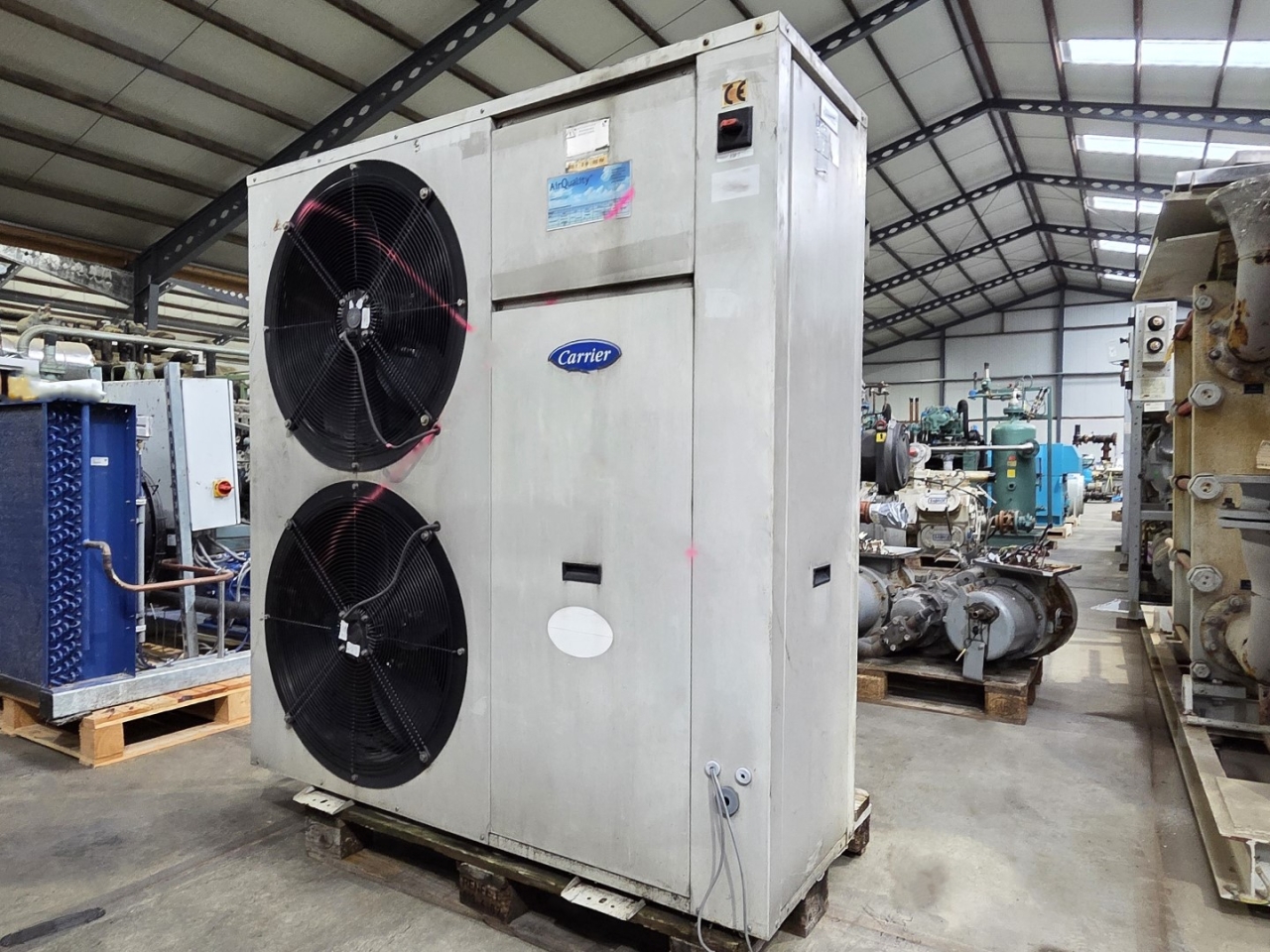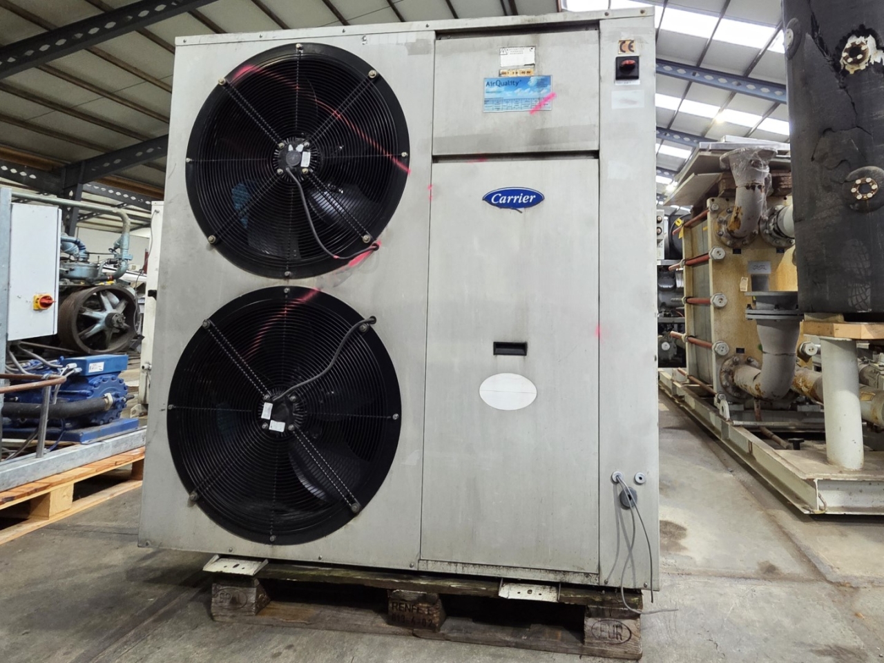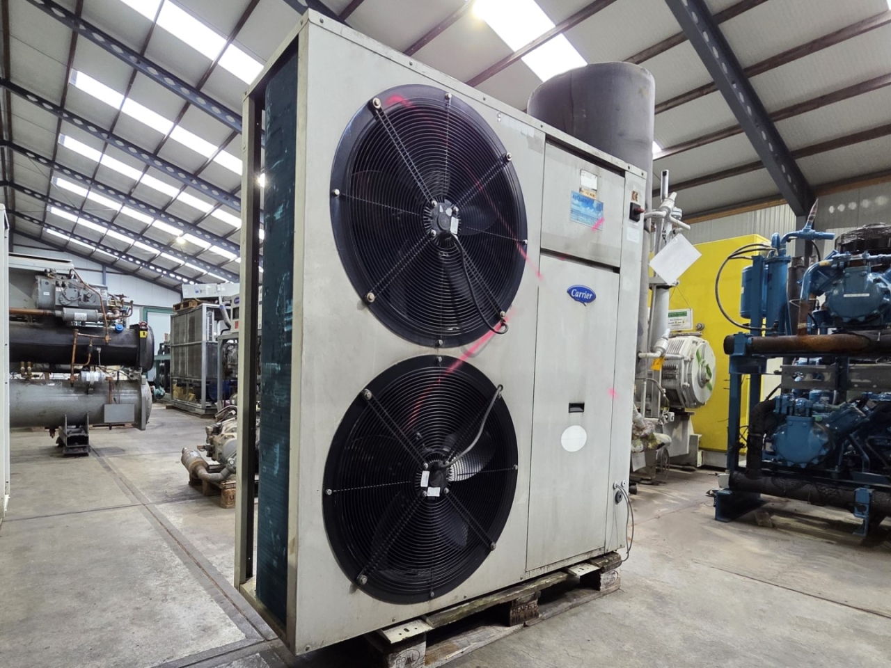 Used Carrier 30 RA 026 air-cooled chiller on Freon R407C. Complete with 1x Performer SZ120S4VC scroll compressor, condenser with 2 S&P TRB/6-610/30-BM fans: 50 Hz - 725/400 RPM - 0,4/0,17 kW - diameter 610 mm, brazed heat exchanger as evaporator, Grundfos water pump, expansion vessel and control cabinet with a Carrier Pro-dialog Plus controller.