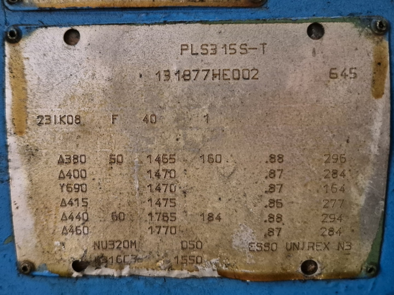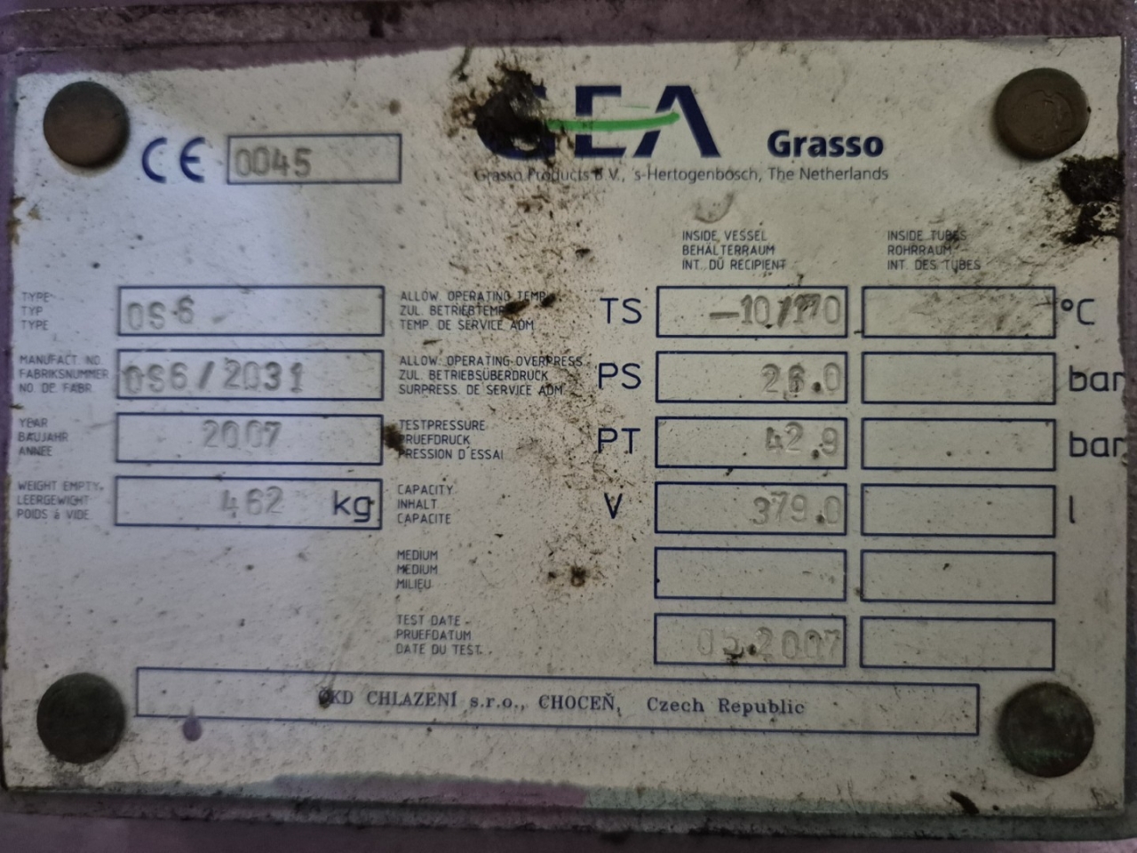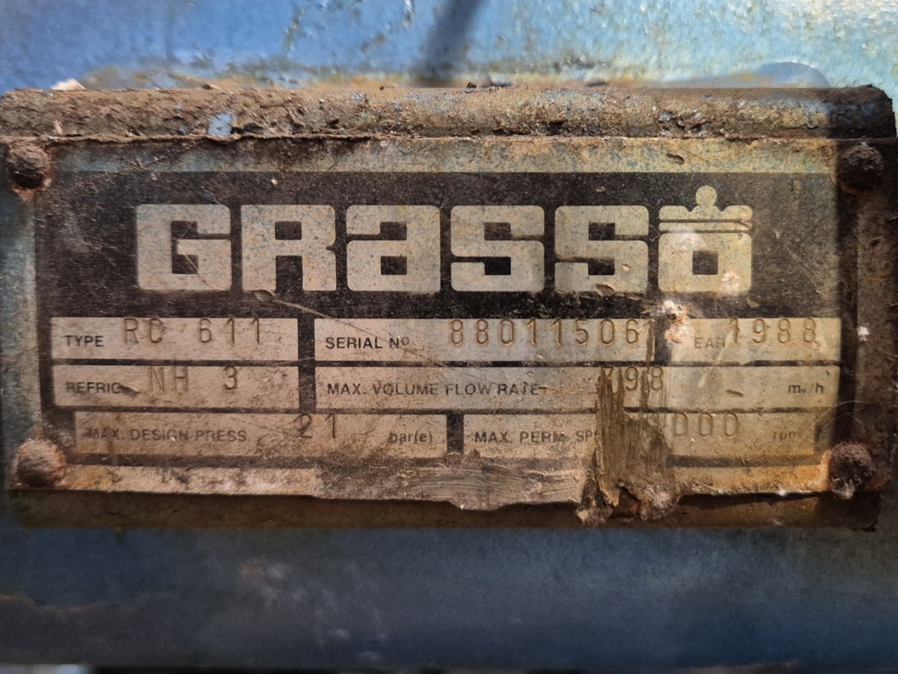 Used Grasso RC 611 reciprocating compressor on NH3 (R717). Complete with a Leroy Somer PLS315S-T electric motor - 50 Hz - 160 kW - 1465 RPM, GEA OS6 oil separator, pressure and safety switches/gauges. The compressor has a displacement of 798 m³/h.