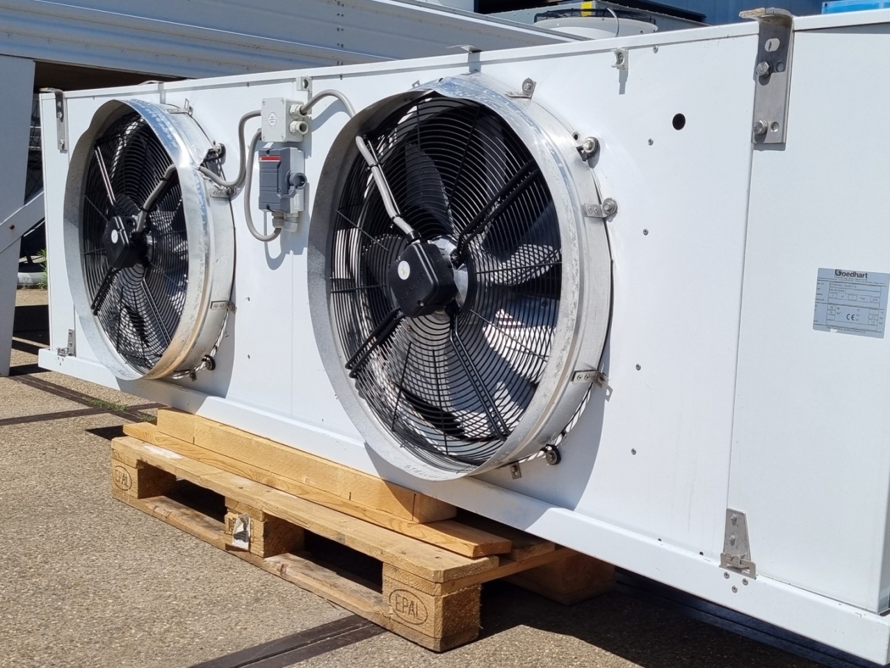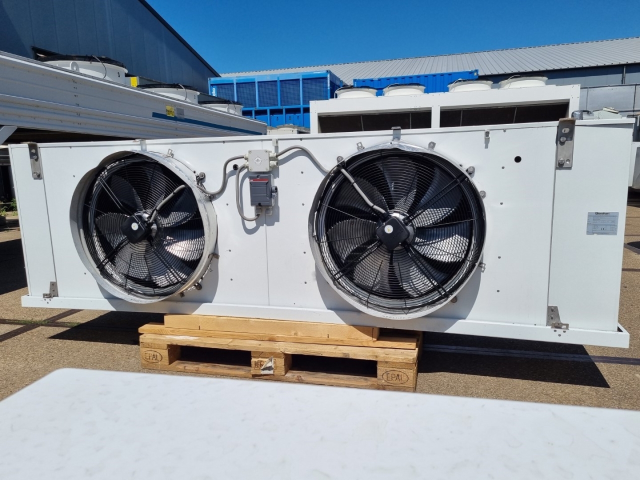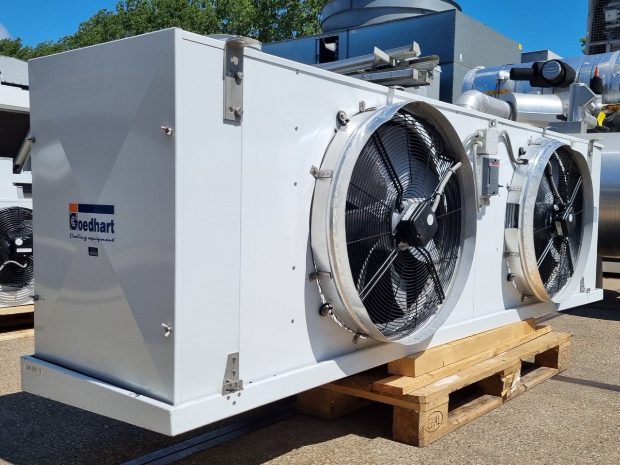 Used Goedhart SKU38 42564 L evaporator on Glycol. Complete with 2 Ziehl-Abegg FN056-SDK.4F.V7P2 fans: 50/60 Hz - 0,34/0,21 - 0,54/0,26 kW - 870/630 - 980/630 RPM - diameter 560 mm and a total airflow of 12.400 m³/h.