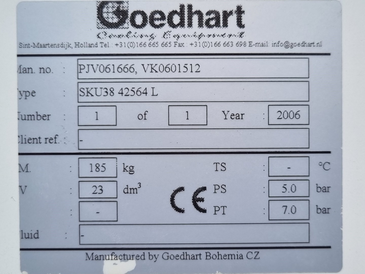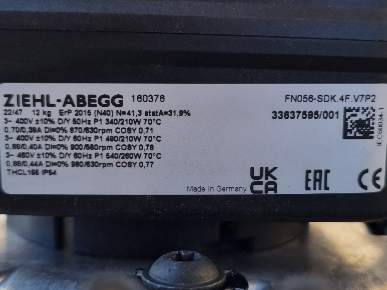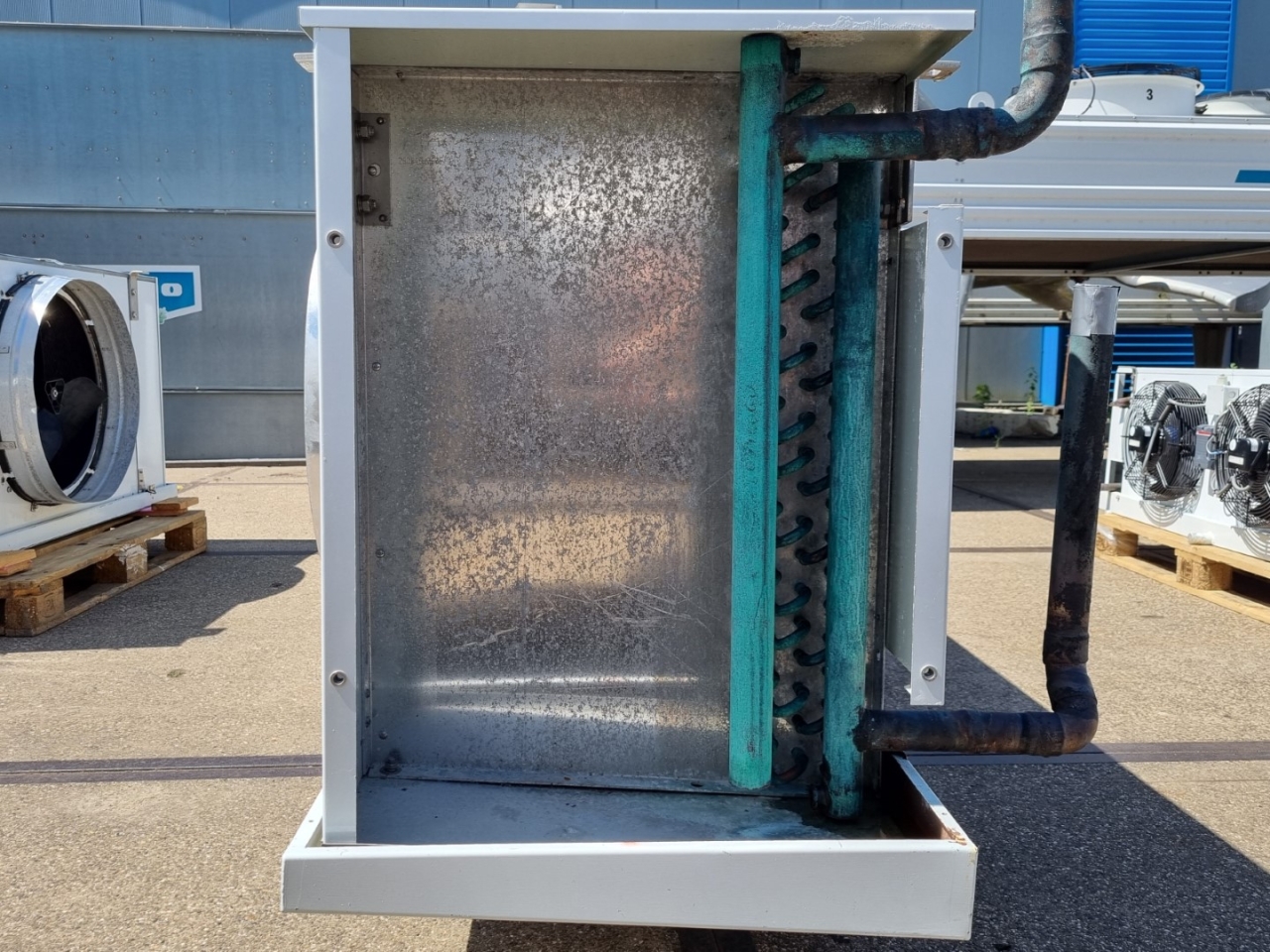 Used Goedhart SKU38 42564 L evaporator on Glycol. Complete with 2 Ziehl-Abegg FN056-SDK.4F.V7P2 fans: 50/60 Hz - 0,34/0,21 - 0,54/0,26 kW - 870/630 - 980/630 RPM - diameter 560 mm and a total airflow of 12.400 m³/h.