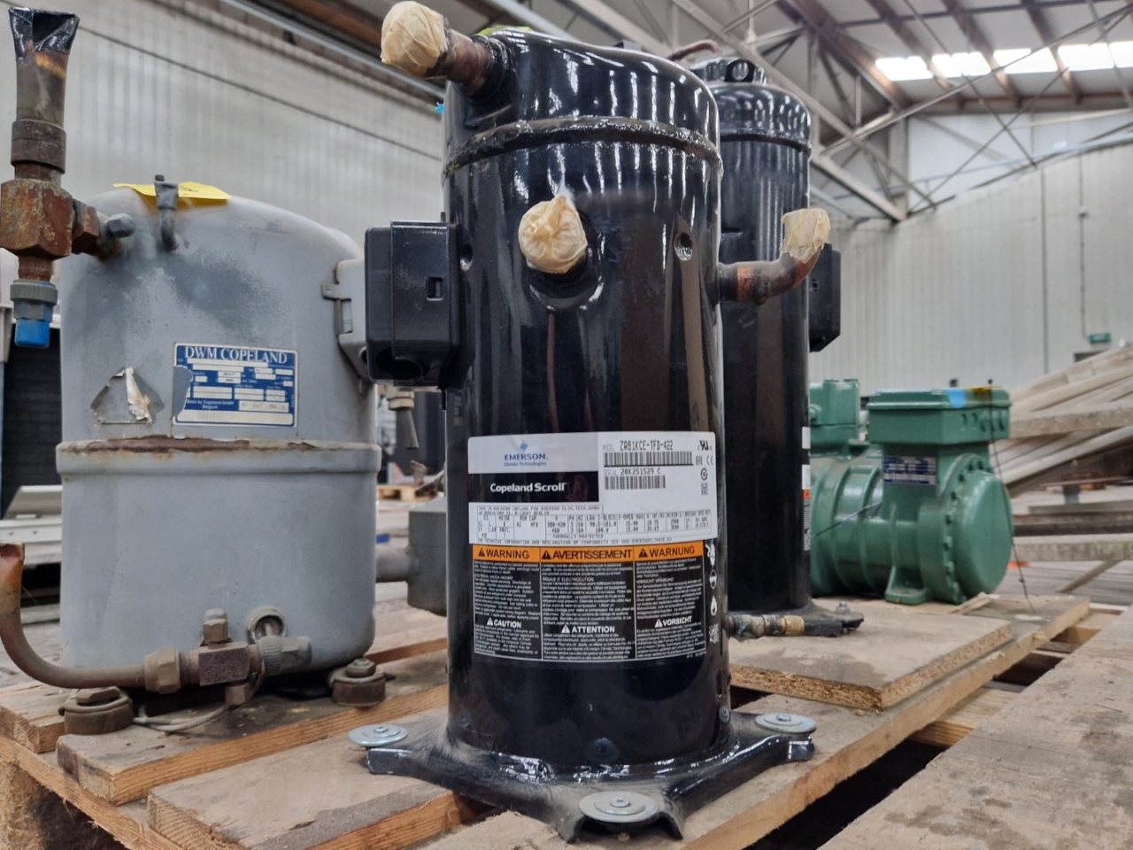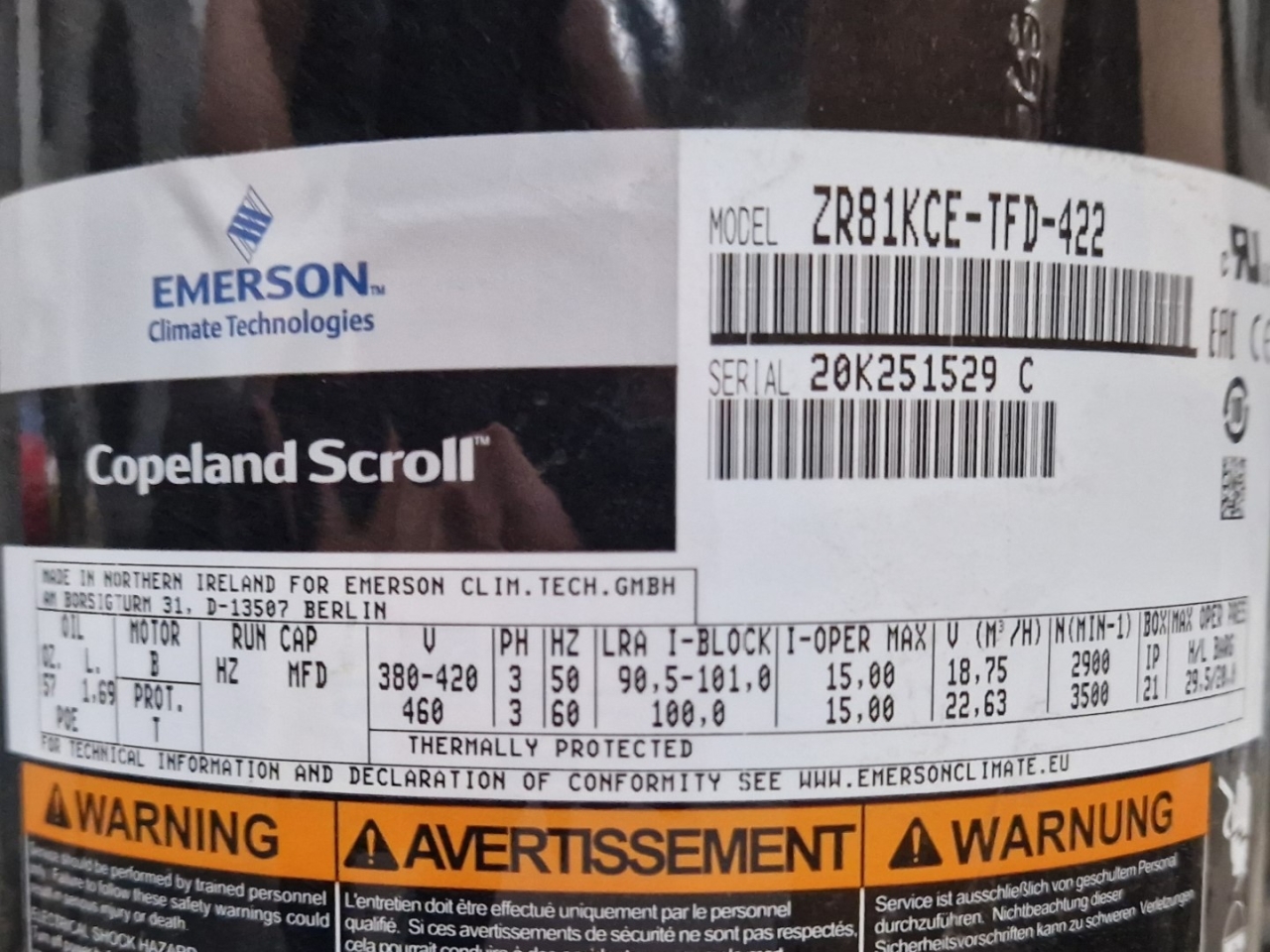 Used Copeland ZR81KCE-TFD-422 scroll compressor on Freon. The compressor has a displacement of 18,75 m³/h at 50 Hz & 22,63 m³/h at 60 Hz. The capacities based on Freon R134a.