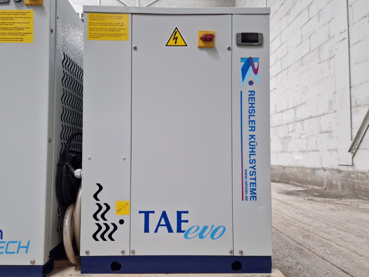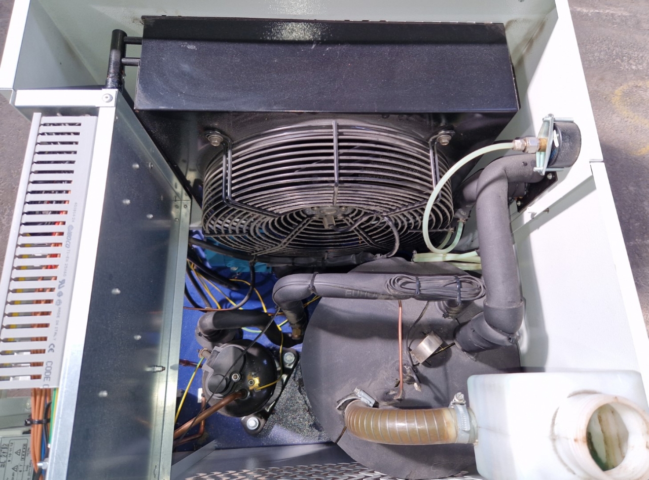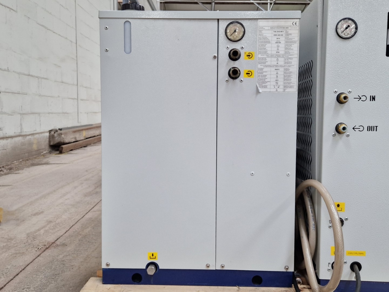 Used MTA TAE EVO M10 air-cooled chiller on R407C. Complete with a Tecumseh RK5518W hermetic compressor, condenser with 1 EBM-Papst A4E330-AP18-02 fan - 50/60 Hz - 0,11/0,14 kW - 1400/1620 RPM - diameter 330 mm, finned coil exchanger in a water storage tank as evaporator, Calpeda BCTM 61/A water pump and a control cabinet with a Dixell RX60CX controller.