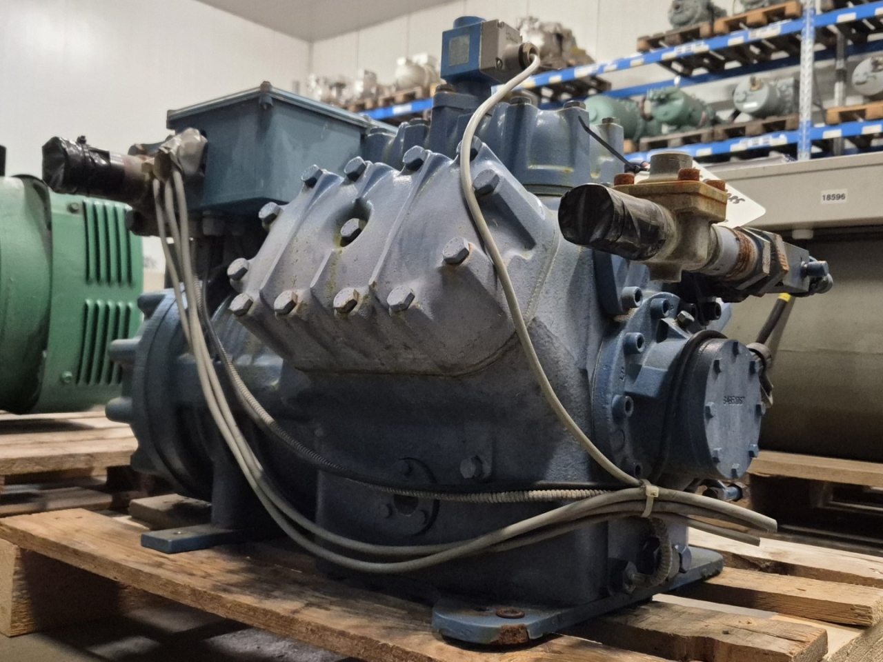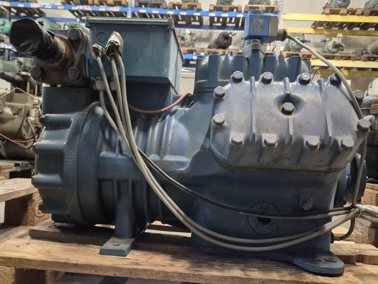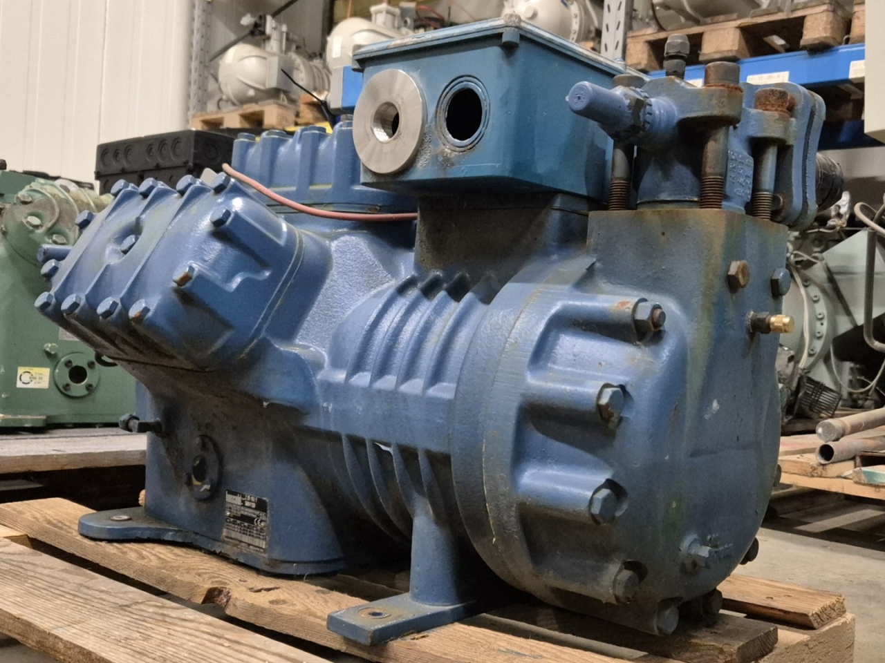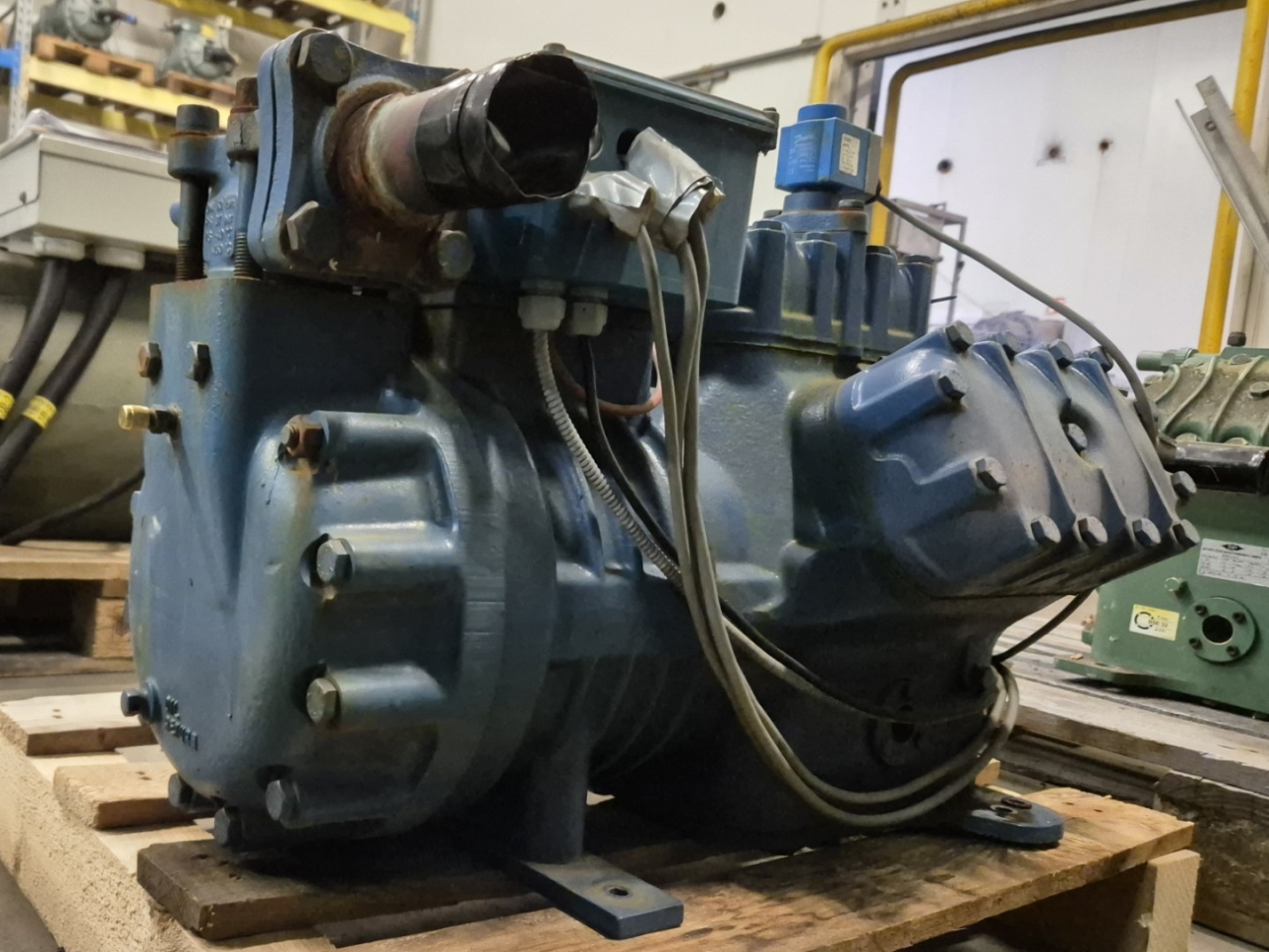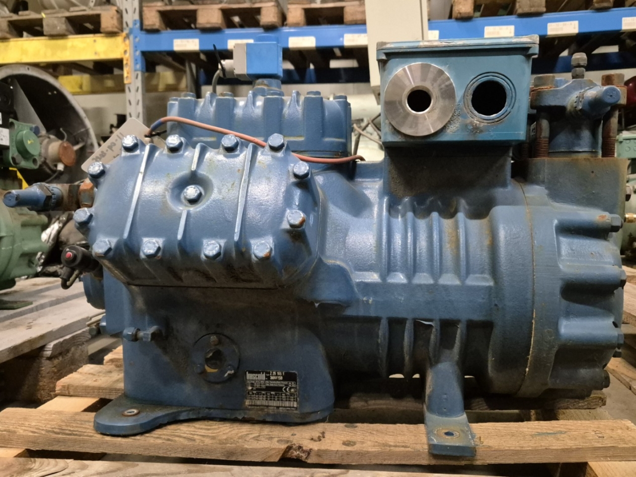 Used Frascold Z 25-106Y semi-hermetic reciprocating compressor on Freon with a sight glass and unloaded start. The compressor has a displacement of 106,2 m³/h at 50 Hz & 127,4 m³/h at 60 Hz.