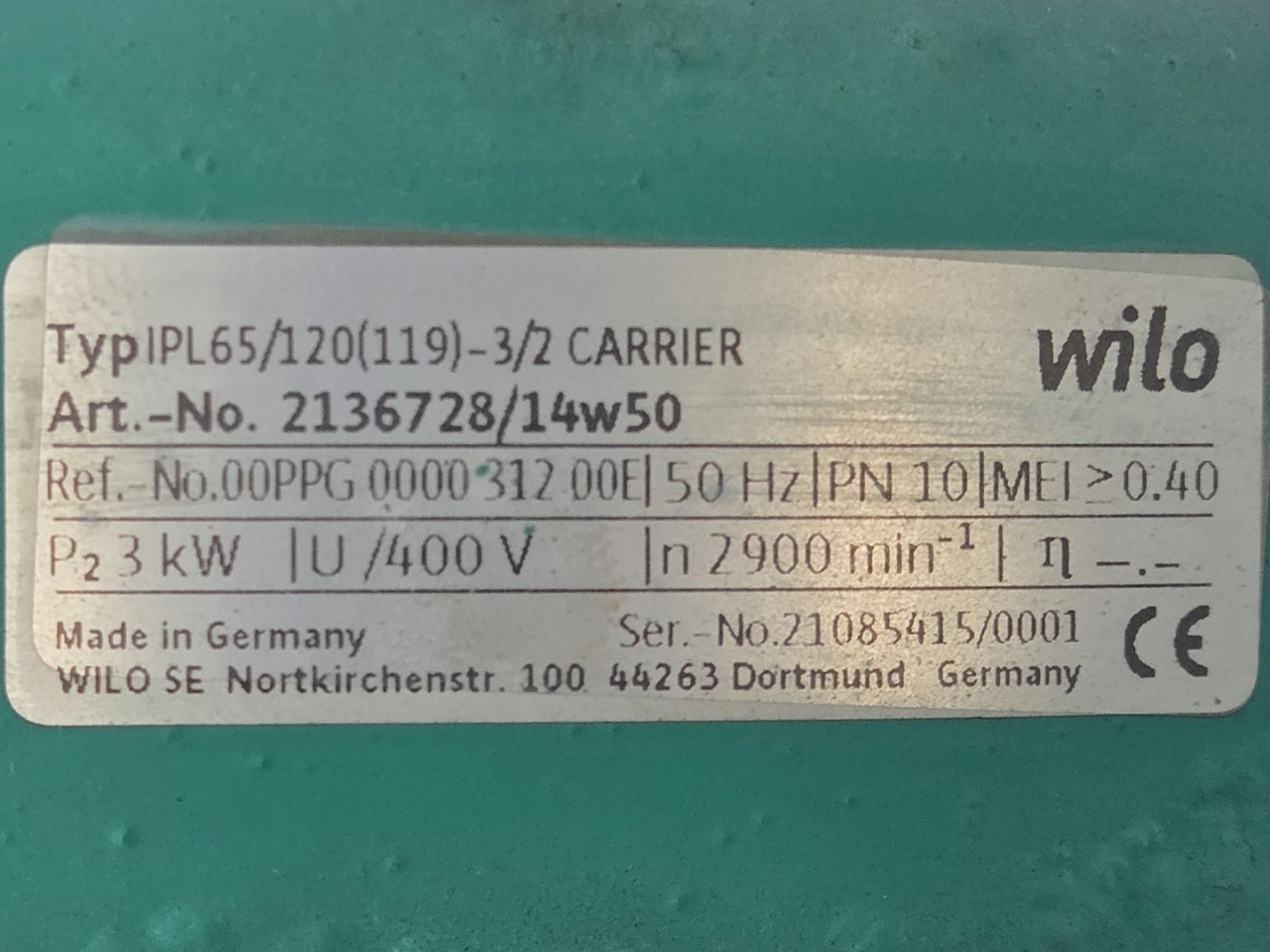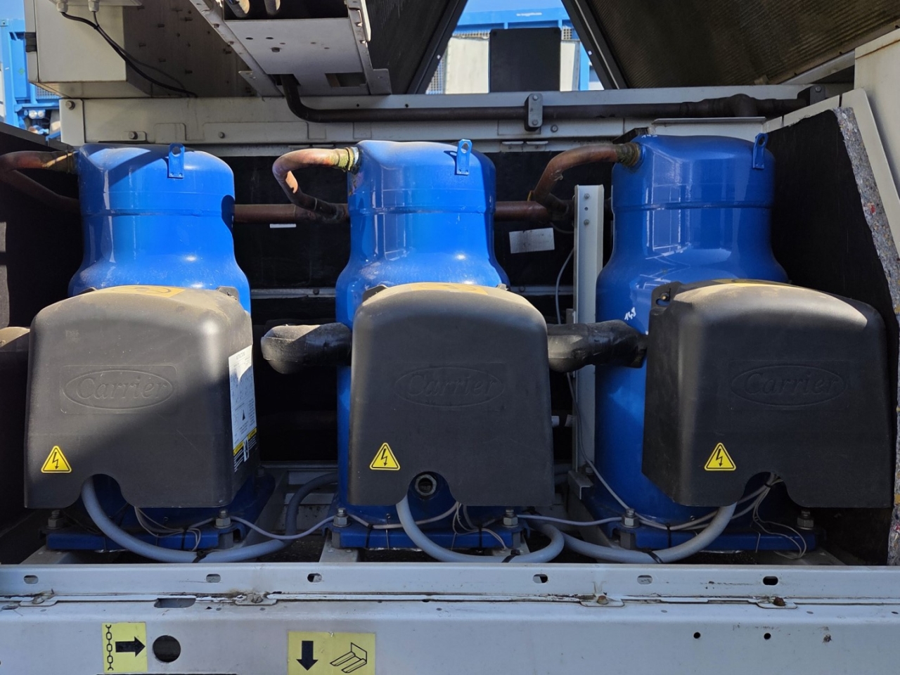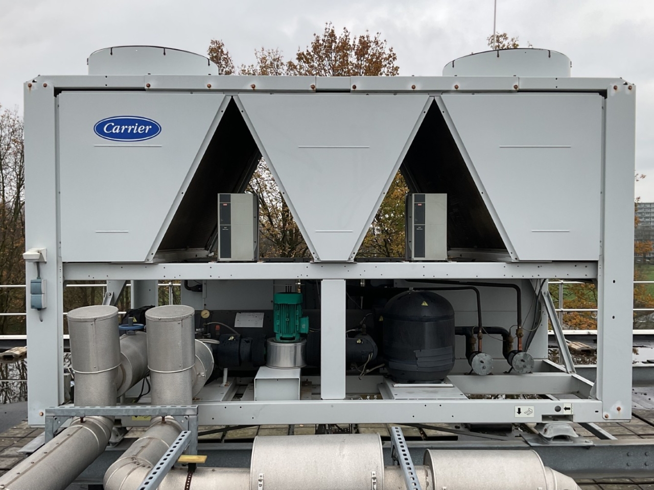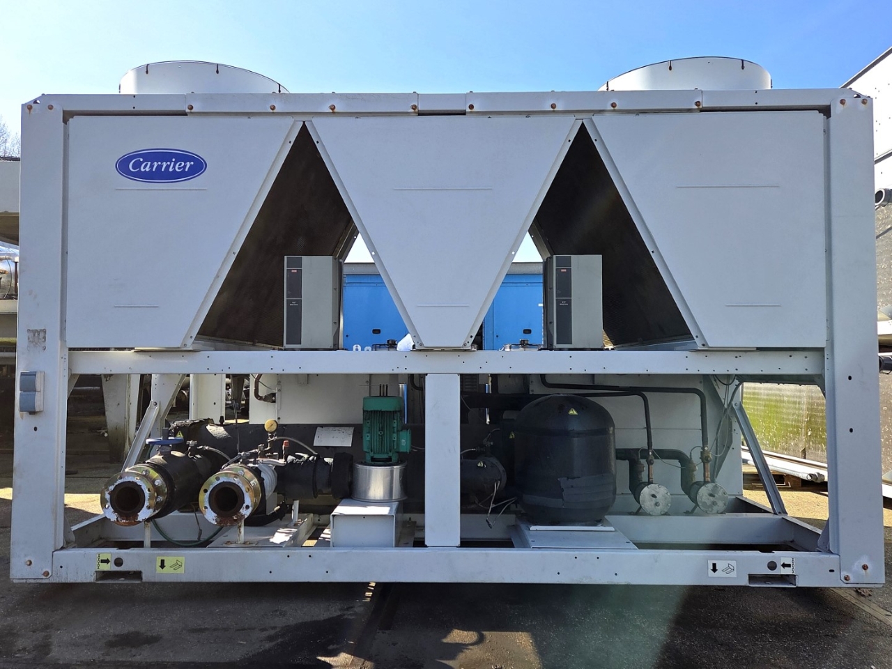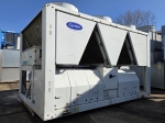 Used Carrier 30 RB 0302 air-cooled chiller on Freon R410A. Complete with 2 Danfoss SH300B4ACC & 3 Danfoss SH240A4ACE scroll compressors, condenser with 5 fans that produce an airflow of 81.248 m³/h, Carrier 00PSG000136906A shell and tube as evaporator with a volume of 111 liters, Wilo IPL65/120(119)-3/2 water pump with Tee Q2E FS 100L2C89-F188 electric motor: 50/60 Hz - 3,0/3,5 kW - 2885/3470 RPM, Zilmet expansion vessel with a volume of 80 liters, 2 Danfoss frequency converters and a control cabinet with a Carrier Pro-Dialog Plus.