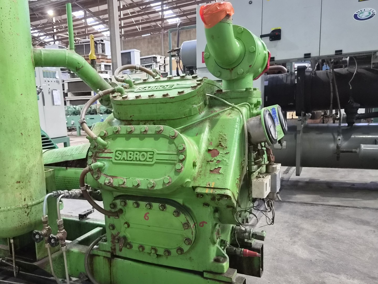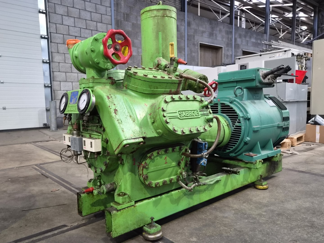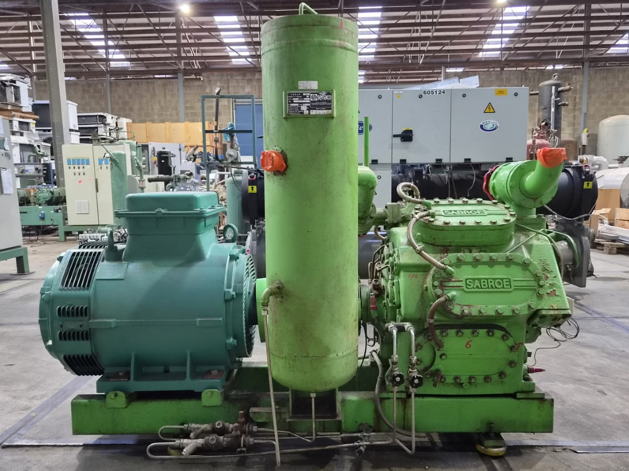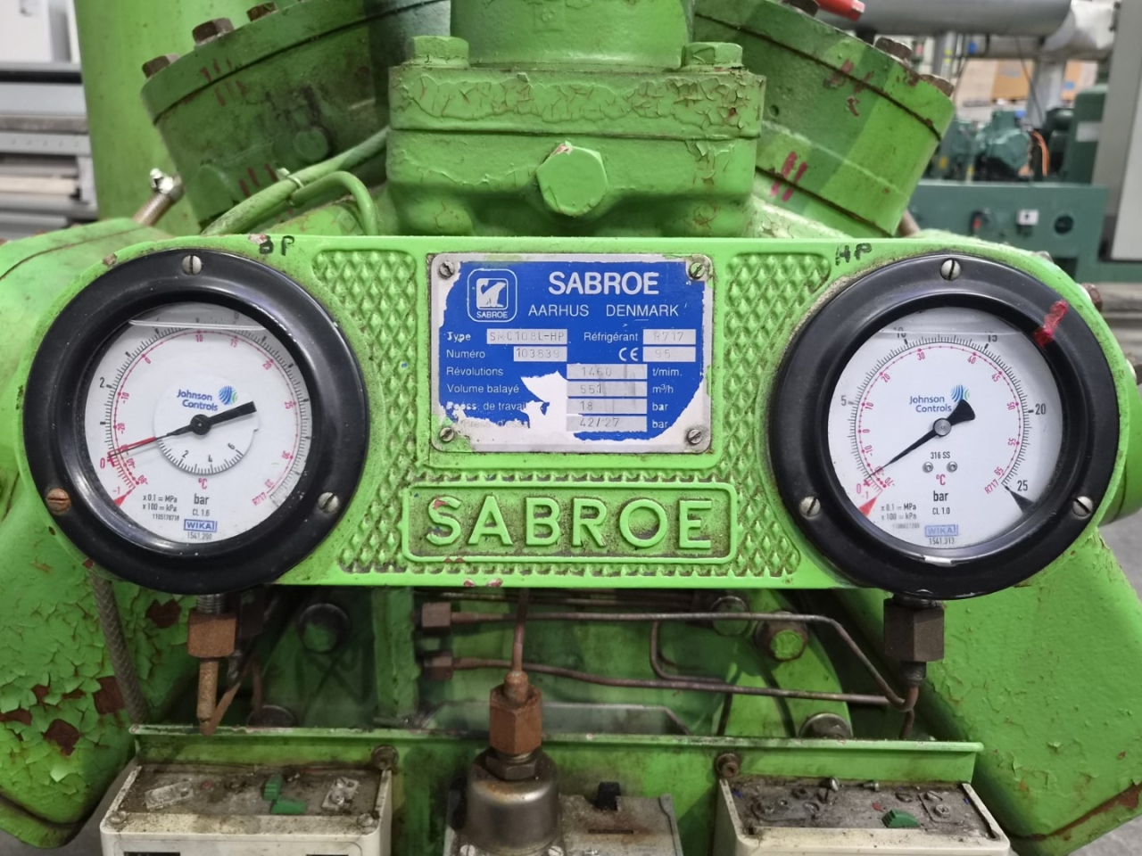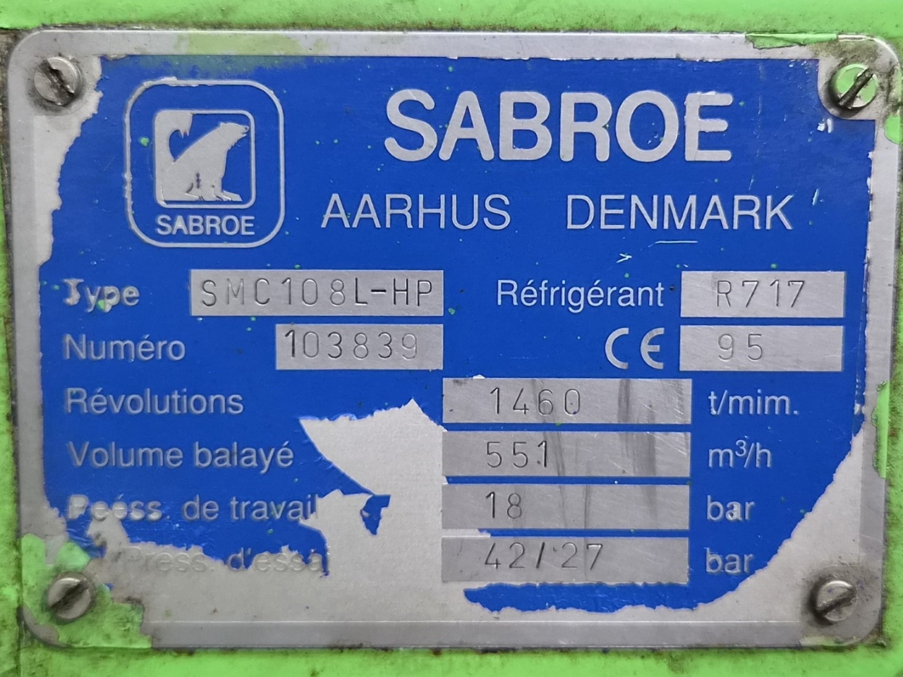 Used Sabroe SMC108L-HP reciprocating compressor on NH3 (Ammonia). Complete with an Schorch KN7280S-BB01B-401 electric motor - 50/60 Hz - 110/127 kW - 1475/1775 RPM, Seriaco S300/10 oil separator with a volume of 80 liters and pressure and safety switches/gauges. The compressor has a displacement of 551,0 m²/h at 1460 RPM.