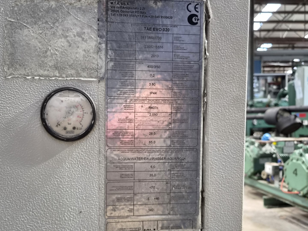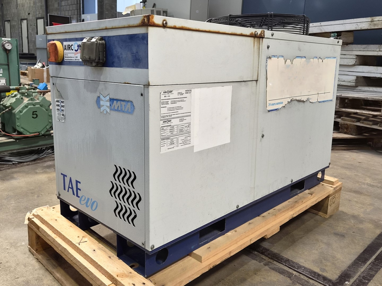 Used MTA TAE EVO 020 air-cooled chiller on Freon R407C. Complete with 1 Danfoss MTZ28JE4A reciprocating compressor, condenser with 1 Ebm-papst A4D400-AP12-01 - 50/60 Hz - 1450/1690 RPM - 0,14/0,19 kW - diameter 400 mm that produces an airflow of 3.100 m³/h, Lowara CIE70/5 water pump, liquid buffer tank and a control cabinet with a Dixell display.