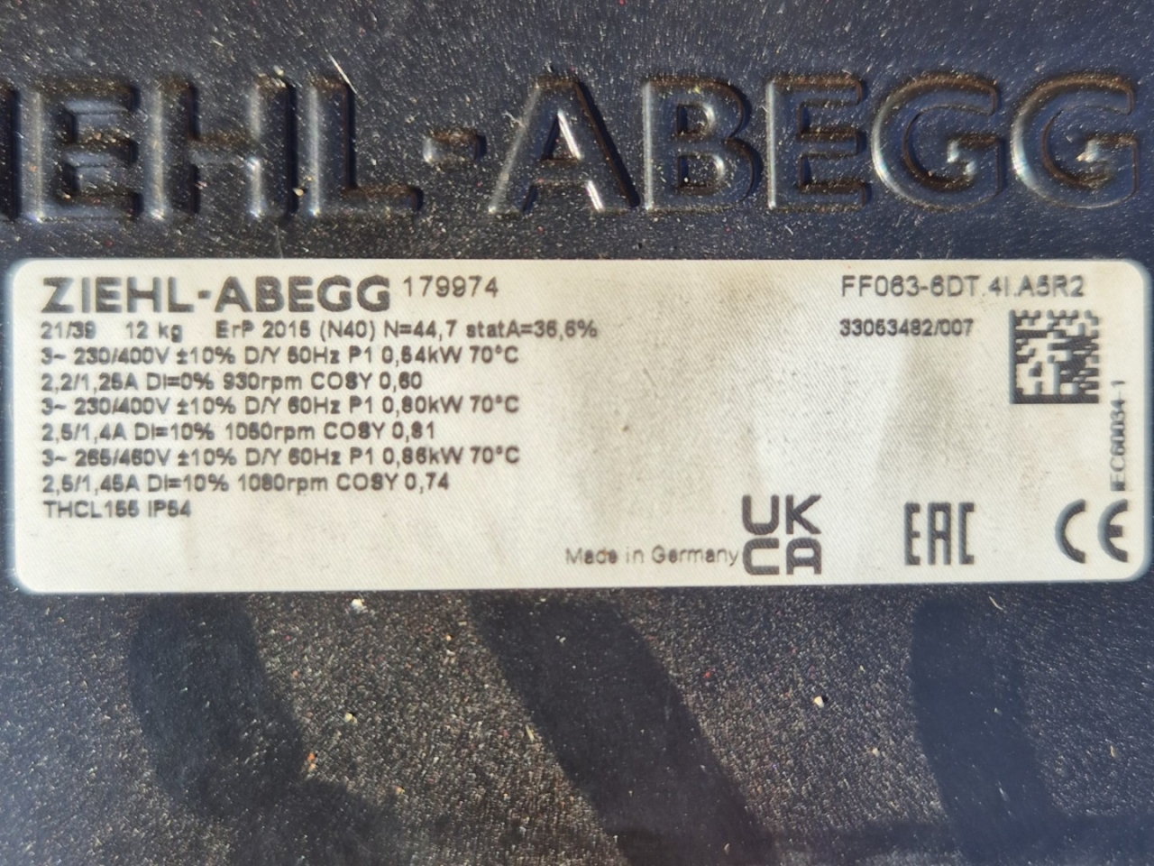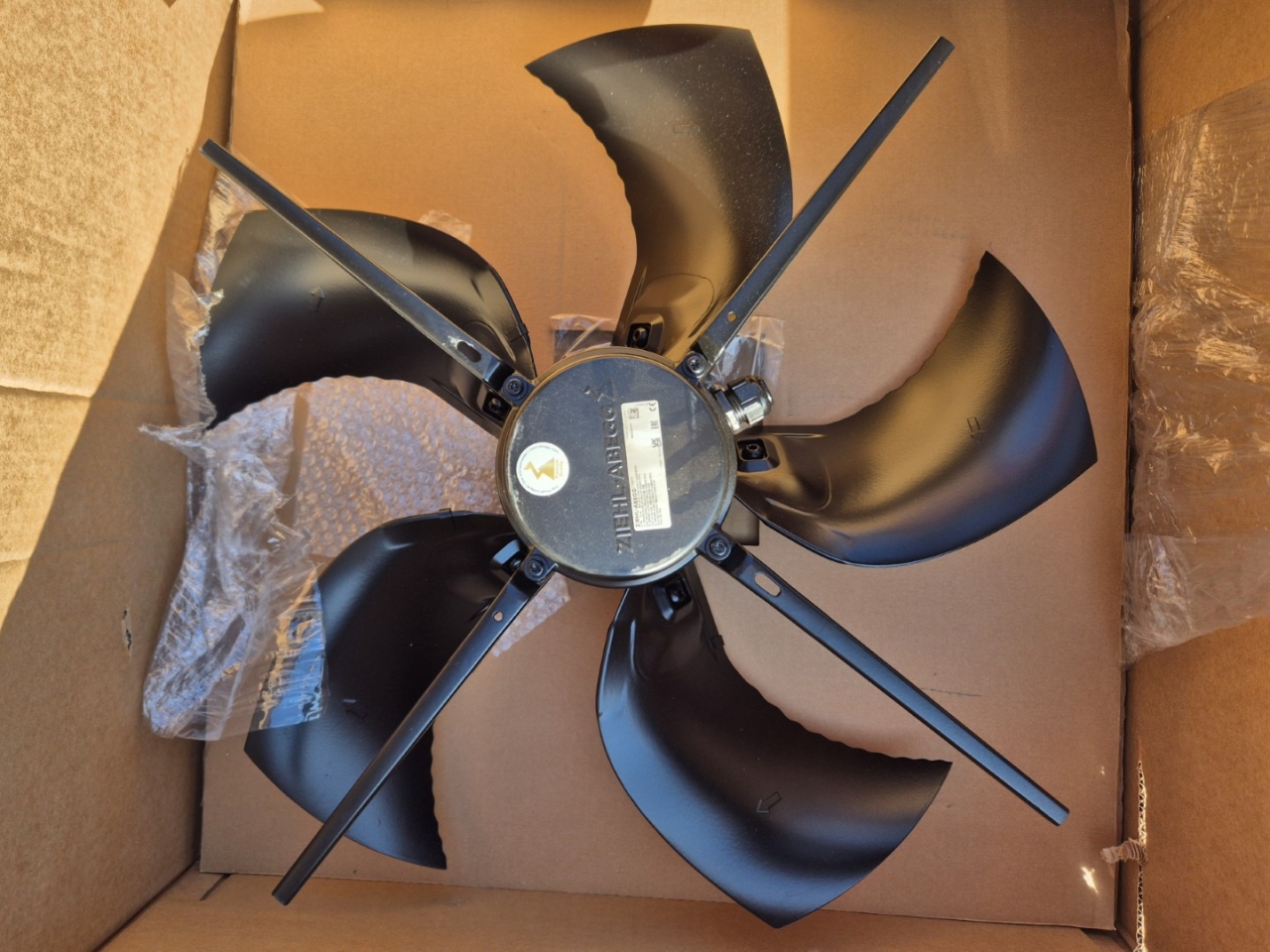 New Ziehl-Abegg FF063-6DT.4I.A5R2 fan with the following specifications: 50 Hz - 0,54 kW - 930 RPM & 60 Hz - 0,80 kW - 1050 RPM - diameter 630 mm.