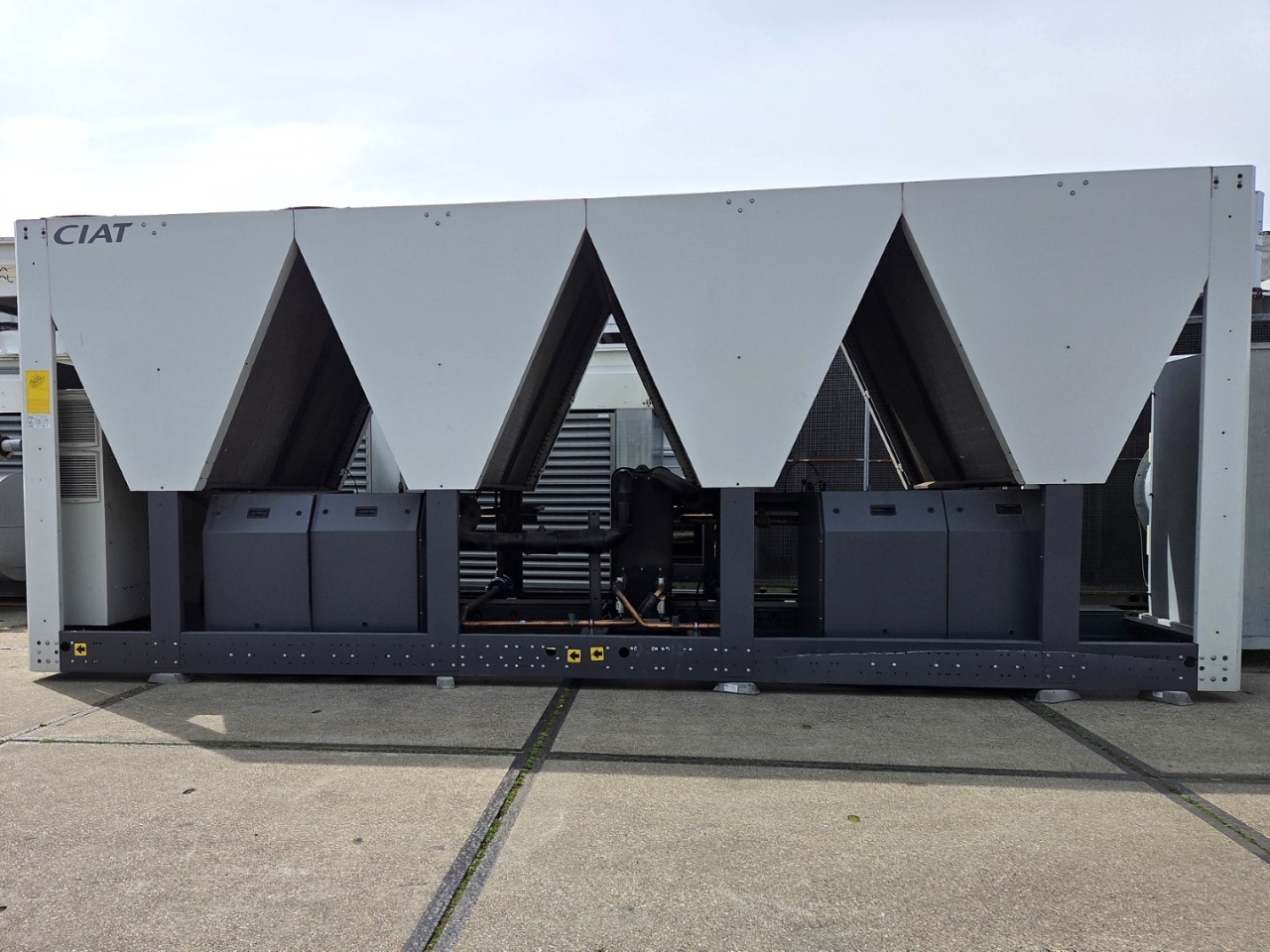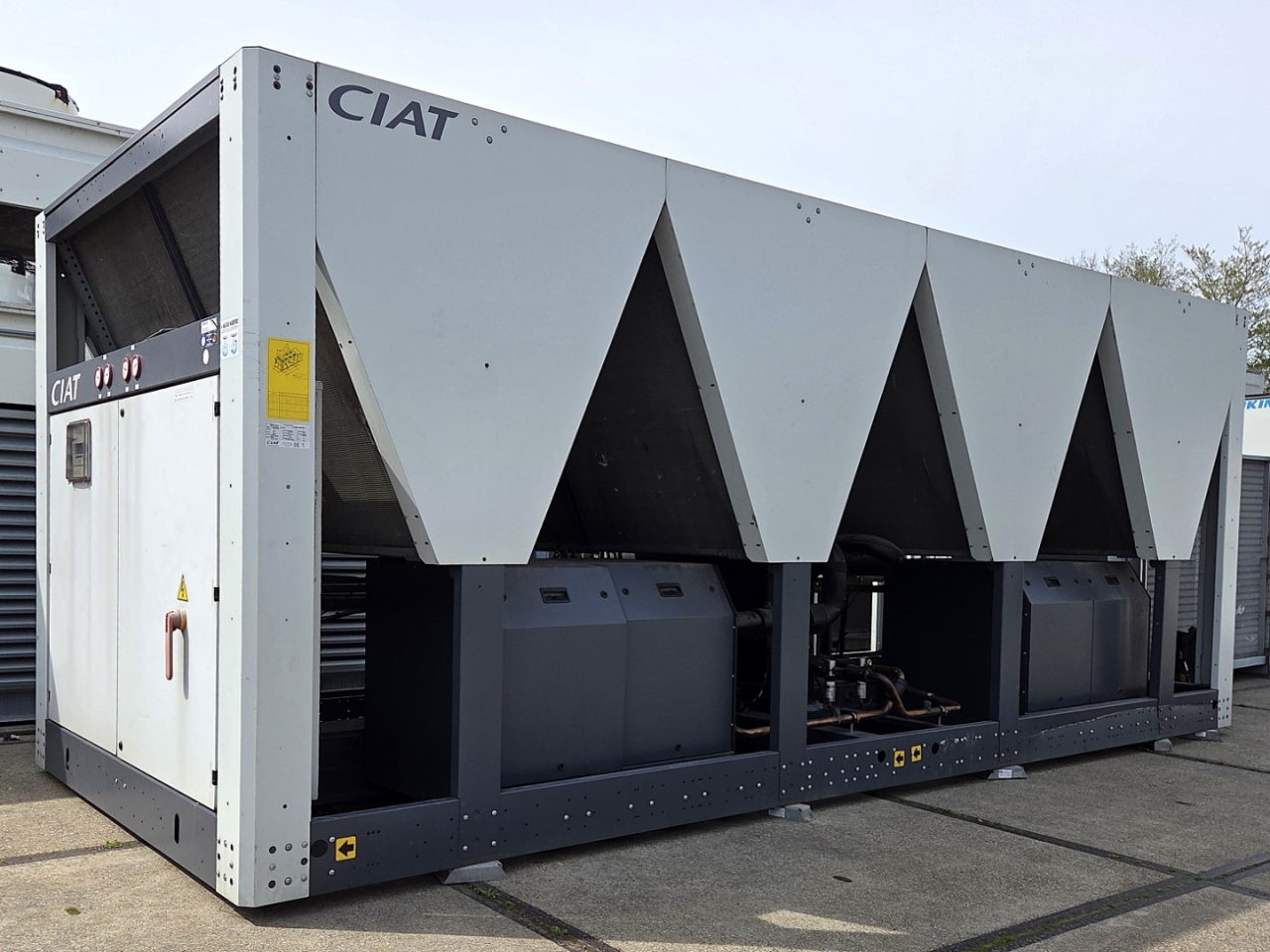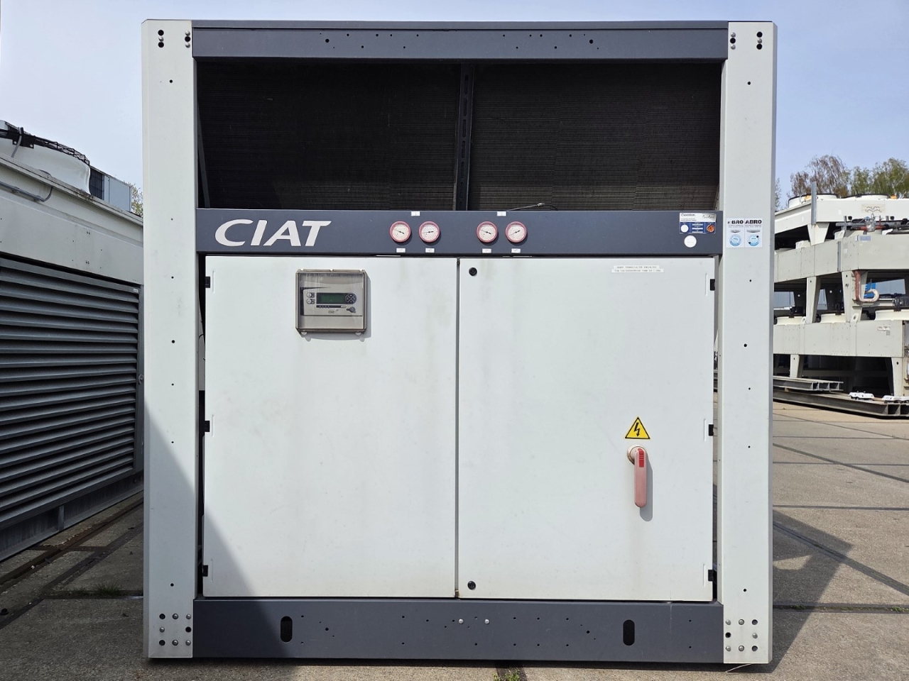 Used Ciat LD 1600V-STD air-cooled chiller on Freon R410A. Complete with 4 Copeland ZP485KCE-TWD-522 scroll compressors, condenser with 8 fans that produce an airflow of 168.000 m³/h, brazed heat exchanger as evaporator and control cabinet with a Ciat Connect2.