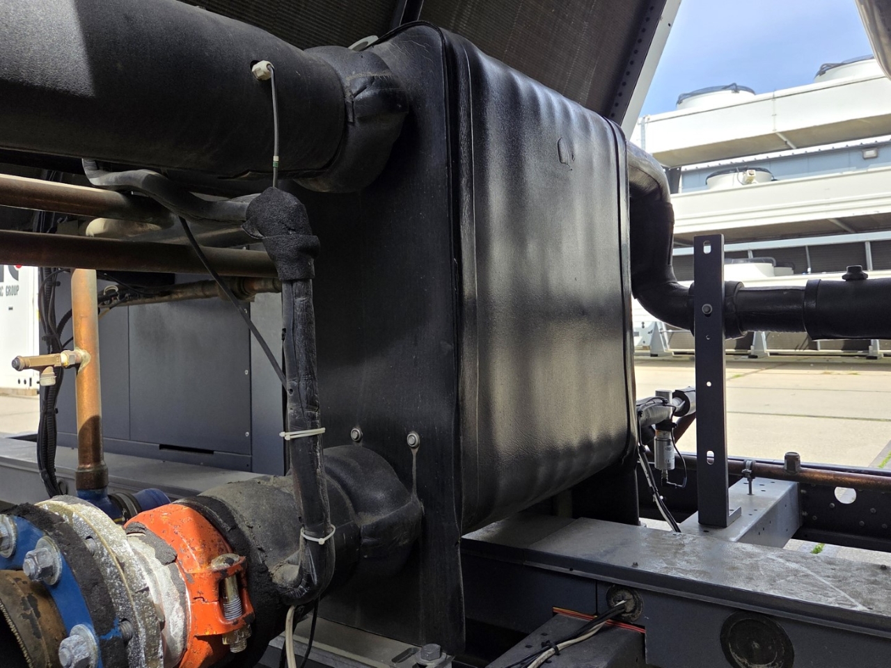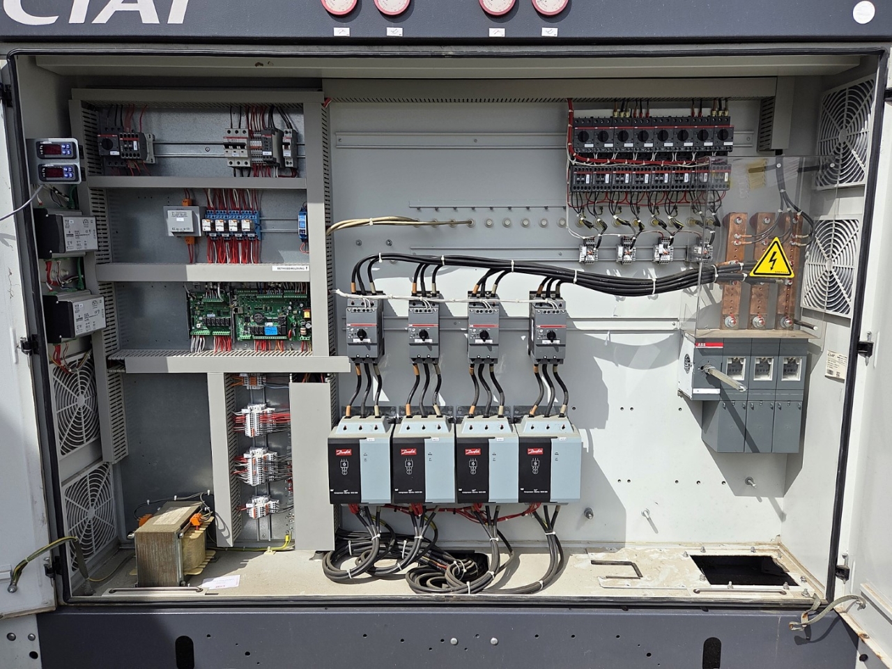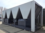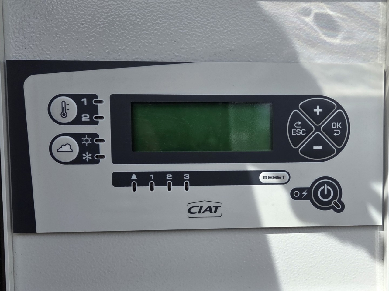 Used Ciat LD 1600V-STD air-cooled chiller on Freon R410A. Complete with 4 Copeland ZP485KCE-TWD-522 scroll compressors, condenser with 8 fans that produce an airflow of 168.000 m³/h, brazed heat exchanger as evaporator and control cabinet with a Ciat Connect2.