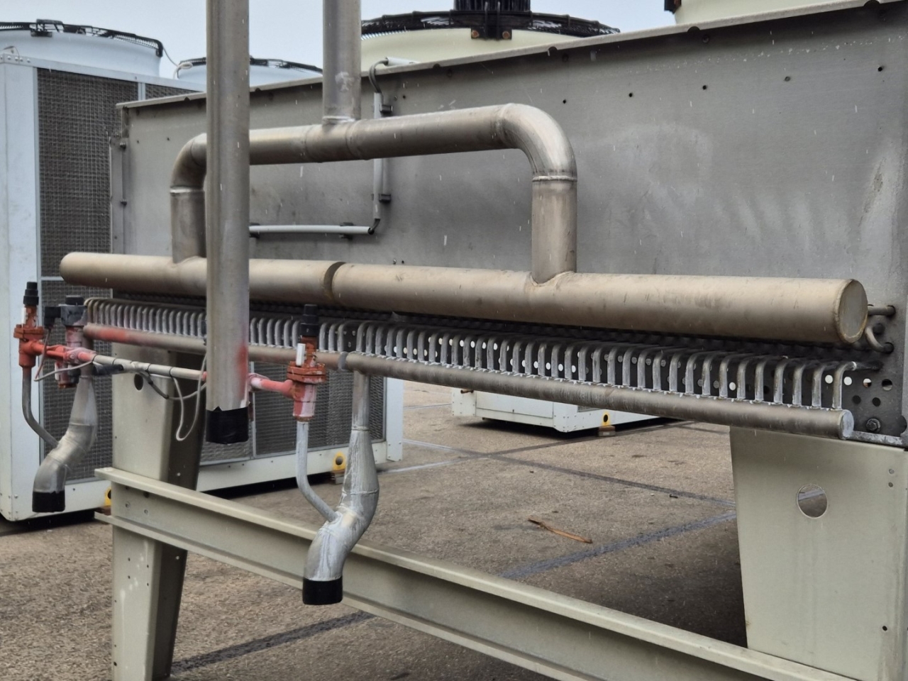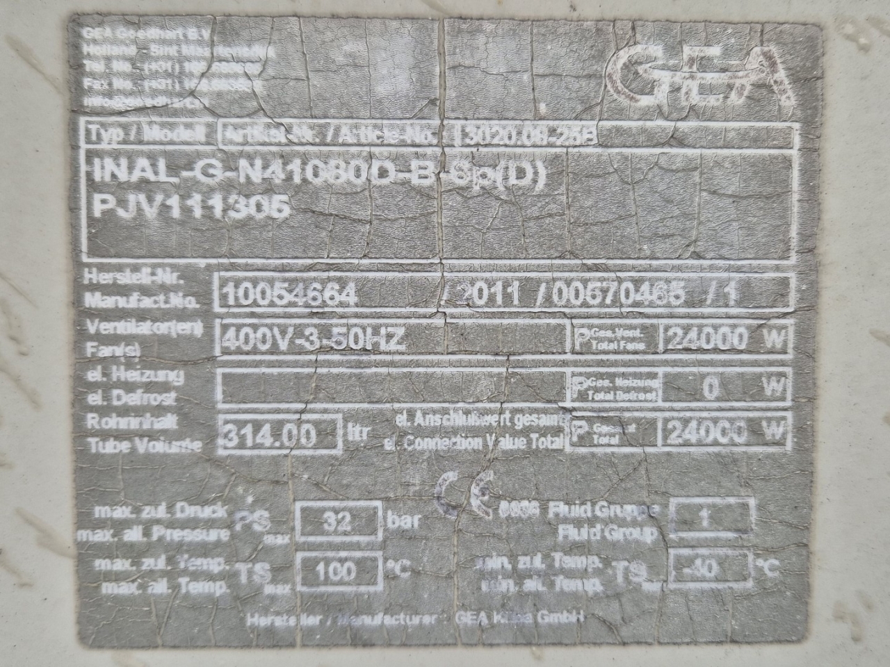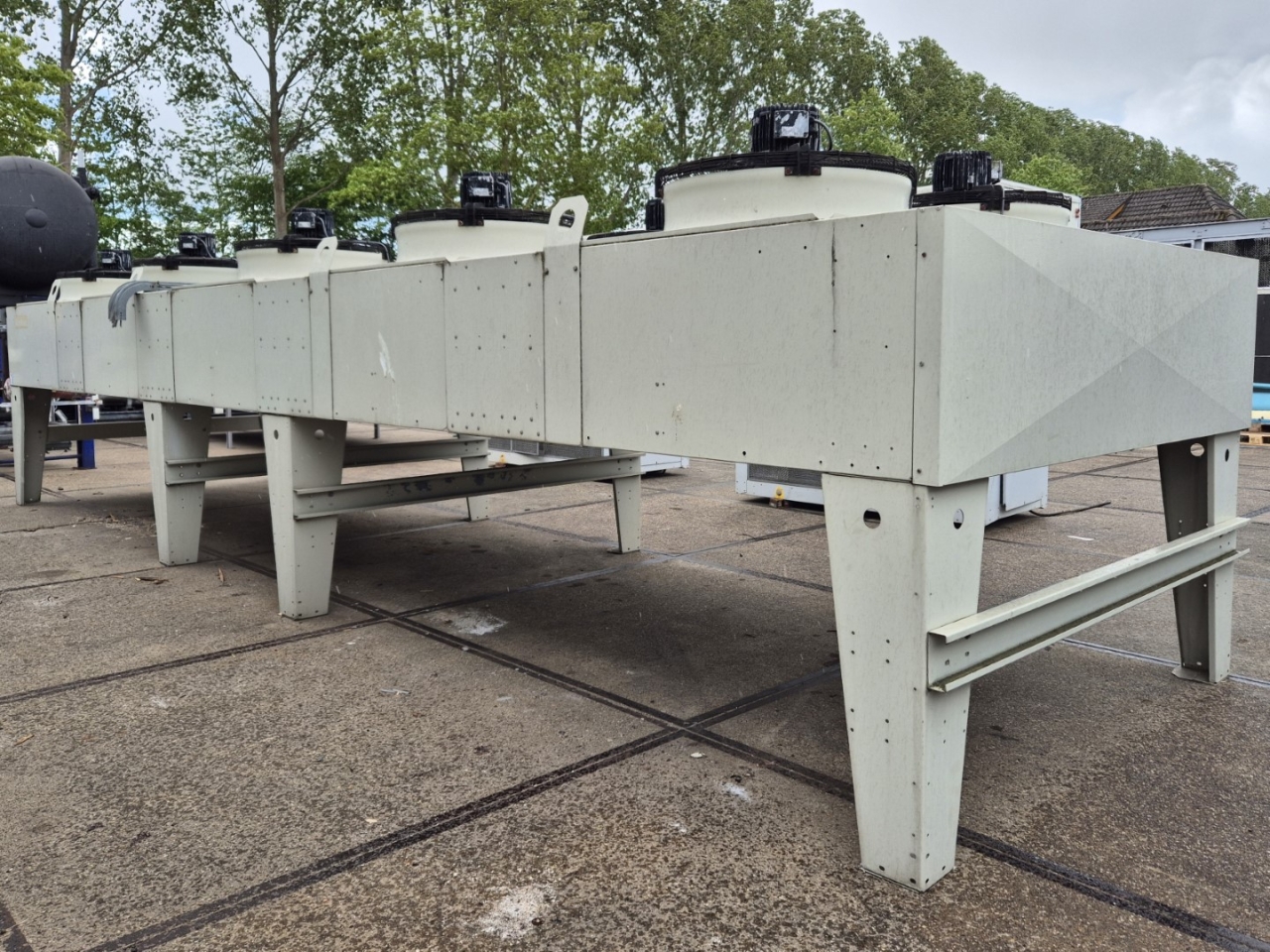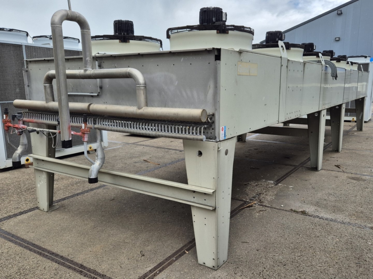 Gebrauchter luftgekühlter NH3-Kondensator (Ammoniak) vom Typ Goedhart INAL-G-N41080D-B-6p(D). Komplett mit 10 Süd-Electric LOD-080T3-100-NSUBTK-Ventilatoren – 50 Hz – 2,4/1,5 kW – 900/650 U/min – Durchmesser 800 mm und einem Gesamtluftstrom von 210.120 m³/h.